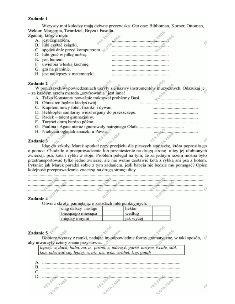 Zadanie 1 Wszyscy moi koledzy mają dziwne przezwiska. Oto one: Biblioman, Korner, Ottoman, Wektor, Margerita, Twardziel, Bryza i Fasolla. Zgadnij, który z nich: A. jest żeglarzem. ................................................. B. lubi czytać książki. ................................................. C. spędza dnie przed komputerem. ................................................. D. lubi grać w piłkę nożną. ................................................. E. jest leniem. ................................................. F. uwielbia włoską kuchnię. ................................................. G. gra na pianinie. ................................................. H. jest najlepszy z matematyki. ................................................. Zadanie 2 W poniższych wypowiedzeniach ukryły się nazwy instrumentów muzycznych. Odszukaj je – za każdym razem metoda „szyfrowania” jest inna! A. Tylko Konstanty poważnie traktował problemy Basi. ...................................... B. Obraz ten będzie kiedyś twój. ...................................... C. Kupiłem nowy fotel, firanki i dywan. ...................................... D. Helikopter sanitarny wiózł organy do przeszczepu. ...................................... E. Radek – talent gimnazjalny. ...................................... F. Turyści dotrą bardzo późno. ...................................... G. Paulina i Agata nieraz ignorowały natrętnego Olafa. ...................................... H. Nieliczni oglądali znaczki u Pawła. ...................................... Zadanie 3 Idąc do szkoły, Marek spotkał przy przejściu dla pieszych staruszkę, która poprosiła go o pomoc. Chodziło o przeprowadzenie lub przeniesienie na drugą stronę ulicy jej ulubionych zwierząt: psa, kota i rybki w słoju. Problem polegał na tym, że za jednym razem można było przetransportować tylko jedno zwierzę, ale nie wolno zostawić kota z rybką ani psa z kotem. Pytanie: jak Marek poradzi sobie z tym zadaniem, jeśli babcia nie będzie mu pomagać? Opisz kolejność przeprowadzania zwierząt na drugą stronę ulicy. ....................................................................................................................................................... ....................................................................................................................................................... ....................................................................................................................................................... ....................................................................................................................................................... Zadanie 4 Utwórz skróty, pamiętając o zasadach interpunkcyjnych: ciąg dalszy nastąpi hektar bieżącego miesiąca według między innymi jak wyżej Zadanie 5 Dobierz wyrazy z ramki, nadając im odpowiednie formy gramatyczne, w taki sposób, aby utworzyły cztery znane przysłowia. lepszy, w, dach, baba, na, a, późno, z, uderzyć, garść, nożyce, wcale, stół, koń, odezwać się, lepiej, w, niż, niż, wóz, wróbel, lżej, gołąb A. B. C. D. ....................................................................................................................... ....................................................................................................................... ....................................................................................................................... ....................................................................................................................... Zadanie 6 Do każdej grupy wyrazów dopisz pasujący rzeczownik: A. herbatnik, harmonijka, helikopter ..................................... B. czasownik, spójnik, przysłówek ..................................... C. średnik, przecinek, myślnik ..................................... D. opactwo, górnictwo, proroctwo ..................................... E. życie, żyletka, życzliwy ..................................... F. sąsiedztwo, doradztwo, dowództwo ..................................... Zadanie 7 Do jakiego miasta jedzie pociąg, ruszający z peronu 27 w Warszawie? Odpowiedz pełnym zdaniem. ............................................................................................................................. Poznań Gdańsk Elbląg Olsztyn Uwaga! Zagadka oparta jest na alfabecie: A, B, C, D, E, F, G, H, I, J, K, L, Ł, M, N, O, P, R, S, T, U, W, X, Y, Z. Zadanie 8 Rozwiąż zadanie i napisz poprawnie liczebniki (słownie): Na wiejskim podwórku Ania zobaczyła 27 kurcząt, trzy razy mniej źrebiąt niż cieląt, dwa razy więcej gąsiąt niż kurcząt oraz o 11 mniej prosiąt niż kurcząt. W sumie zobaczyła 109 zwierząt. Ile było poszczególnych gatunków zwierząt? Odpowiedź: Ania zobaczyła: .................................................................. kurcząt, .................................................................. gąsiąt, .................................................................. prosiąt, .................................................................. źrebiąt, .................................................................. cieląt, czyli w sumie .................................................................. zwierząt.