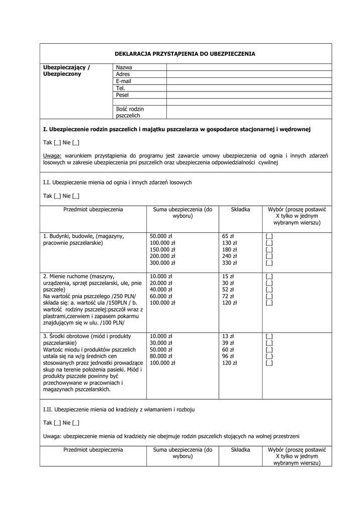 DEKLARACJA PRZYSTĄPIENIA DO UBEZPIECZENIA Ubezpieczający / Ubezpieczony Nazwa Adres E-mail Tel. Pesel Ilość rodzin pszczelich I. Ubezpieczenie rodzin pszczelich i majątku pszczelarza w gospodarce stacjonarnej i wędrownej Tak [_] Nie [_] Uwaga: warunkiem przystąpienia do programu jest zawarcie umowy ubezpieczenia od ognia i innych zdarzeń losowych w zakresie ubezpieczenia pni pszczelich oraz ubezpieczenia odpowiedzialności cywilnej I.I. Ubezpieczenie mienia od ognia i innych zdarzeń losowych Tak [_] Nie [_] Przedmiot ubezpieczenia Suma ubezpieczenia (do wyboru) Składka Wybór (proszę postawić X tylko w jednym wybranym wierszu) 1. Budynki, budowle, (magazyny, pracownie pszczelarskie) 50.000 zł 100.000 zł 150.000 zł 200.000 zł 300.000 zł 65 zł 130 zł 180 zł 240 zł 330 zł [_] [_] [_] [_] [_] 2. Mienie ruchome (maszyny, urządzenia, sprzęt pszczelarski, ule, pnie pszczele) Na wartość pnia pszczelego /250 PLN/ składa się: a. wartość ula /150PLN / b. wartość rodziny pszczelej:pszczół wraz z plastrami,czerwiem i zapasem pokarmu znajdującym się w ulu. /100 PLN/ 10.000 zł 20.000 zł 40.000 zł 60.000 zł 100.000 zł 15 zł 30 zł 52 zł 72 zł 120 zł [_] [_] [_] [_] [_] 3. Środki obrotowe (miód i produkty pszczelarskie) Wartośc miodu i produktów pszczelich ustala się na w/g średnich cen stosowanych przez jednostki prowadzące skup na terenie położenia pasieki. Miód i produkty pszczele powinny być przechowywane w pracowniach i magazynach pszczelarskich. 10.000 zł 30.000 zł 50.000 zł 80.000 zł 100.000 zł 13 zł 39 zł 60 zł 96 zł 120 zł [_] [_] [_] [_} [_] I.II. Ubezpieczenie mienia od kradzieży z włamaniem i rozboju Tak [_] Nie [_] Uwaga: ubezpieczenie mienia od kradzieży nie obejmuje rodzin pszczelich stojących na wolnej przestrzeni Przedmiot ubezpieczenia Suma ubezpieczenia (do wyboru) Składka Wybór (proszę postawić X tylko w jednym wybranym wierszu) Mienie ruchome (maszyny, urządzenia, sprzęt pszczelarski, ule) 10.000 20.000 50.000 80.000 zł zł zł zł Środki obrotowe (miód i produkty pszczelarskie) 2.000 zł 5.000 zł 10.000 zł 20.000 zł 100 200 450 720 zł zł zł zł [_] [_] [_] [_] 25 zł 62 zł 110 zł 200 zł [_] [_] [_] [_] I.III. Ubezpieczenie mienia od wandalizmu . Rozszerzenie ochrony ubezpieczeniowej o ryzyko wandalizmu jest dostępne po wykupieniu ochrony ubezpieczeniowej w ryzyku kradzieży z włamaniem i rozboju. Tj. I.II. Tak [_] Nie [_] Przedmiot ubezpieczenia Pień (ul wraz z pszczołami, plastrami, czerwiem i zapasem pokarmu) Suma ubezpieczenia 250 zł dla jednego pnia Składka roczna za każdy pień Wybór (proszę wstawić ilość uli) 3,00 zł II. Ubezpieczenie odpowiedzialności cywilnej Tak [_] Nie [_] Wariant I[ ] Wariant II [ ] Wariat III [ ] I Wariant I Europa Łącznie z ubezpieczeniem od ognia i zdarzeń losowych mienia – pni pszczelich tj.I.I.2 Zakres ubezpieczenia Suma gwarancyjna Ubezpieczenie OC deliktowej z tytułu szkód osobowych i rzeczowych w związku z hodowlą pszczół oraz posiadaniem mienia związanego hodowlą pszczół z włączeniem odpowiedzialności cywilnej za produkt (miód, propolis, pyłek. jad pszczeli, pierzga) i utratę mienia. Ochrona ubezpieczeniowa obejmuje również odpowiedzialność cywilną za skutki nietypowego użądlenia przez pszczoły będące własnością ubezpieczonych. 30.000 zł na jedno i 60.000 zł na wszystkie zdarzenia w okresie ubezpieczenia Zakres terytorialny Europa 10.000 zł OC pracodawcy na jedno zdarzenie i na wszystkie zdarzenia w okresie ubezpieczenia na każdego ubezpieczonego. 20.000 zł OC za produkt / miód, pyłek, propolis, jad pszczeli, pierzga na jedno i wszystkie zdarzenia w okresie ubezpieczenia na każdego ubezpieczonego Składka 50 PLN od każdej pasieki Za jedną pasiekę uznaje się 80 rodzin. Każde następne rozpoczęte 80 rodzin uznaje się za kolejną pasiekę. II Wariant II RP Łącznie z ubezpieczenia od ognia i zdarzeń losowych mienia – pni pszczelich tj.I.I.2 Zakres ubezpieczenia Suma gwarancyjna Składka Ubezpieczenie OC deliktowej z tytułu szkód osobowych i rzeczowych w związku z hodowlą pszczół oraz posiadaniem mienia związanego z hodowlą pszczół , z wyłączeniem odpowiedzialności cywilnej za produkt i utratę mienia. Ochrona ubezpieczeniowa obejmuje również odpowiedzialność cywilną za skutki nietypowego użądlenia przez pszczoły będące własnością ubezpieczonych. 15.000 PLN na jedno i 30.000 PLN na wszystkie zdarzenia w okresie ubezpieczenia na każdego ubezpieczonego 5 PLN od każdej pasieki Za jedną pasiekę uznaje się 80 rodzin. Każde następne rozpoczęte 80 rodzin uznaje się za kolejną pasiekę. Signal Iduna Polska nie odpowiada za szkody spowodowane typowym użądleniem przez pszczoły niewymagającym pomocy lekarskiej ( w odniesieniu do ludzi) lub weterynaryjnej w odniesieniu do zwierząt. III. Ubezpieczenie odpowiedzialności cywilnej W Uniqa TU S.A. Można zawierać samodzielnie bez łączenia z ubezpieczeniami majątkowymi . Tak [_] Nie [_] Wariant III RP Zakres ubezpieczenia Suma gwarancyjna Składka Uniqa udziela ochrony ubezpieczeniowej pszczelarzom, gdy w wyniku użadlenia przez pszczoły ,będących własnością pszczelarza, Ubezpieczony obowiązany jest w myśl przepisów do naprawienia szkody poniesionej przez osobę trzecią wskutek spowodowania śmierci, uszkodzenia ciała lub rozstroju zdrowia albo zniszczenia lub uszkodzenia mienia.Zakres ochrony rozszerza się o szkody w/w zaistniałe podczas transportu pasiek.Uniqa nie odpowiada za szkody będące typowym następstwem użadlenia przez pszczoły ,nie wymagające pomocy lekarskiej/ w odniesieniu do ludzi/ lub weterynaryjnej/ w odniesieniu do zwierząt. 15.000 zł na jedno i 30.000 zł na wszystkie zdarzenia w okresie ubezpieczenia 11zł za pasiekę (1 pasieka 80 rodzin; każde kolejne rozpoczęte 80 rodzin uznaje się za kolejną pasiekę) Łączna składka z wyżej zadeklarowanych ubezpieczeń (suma składek z z