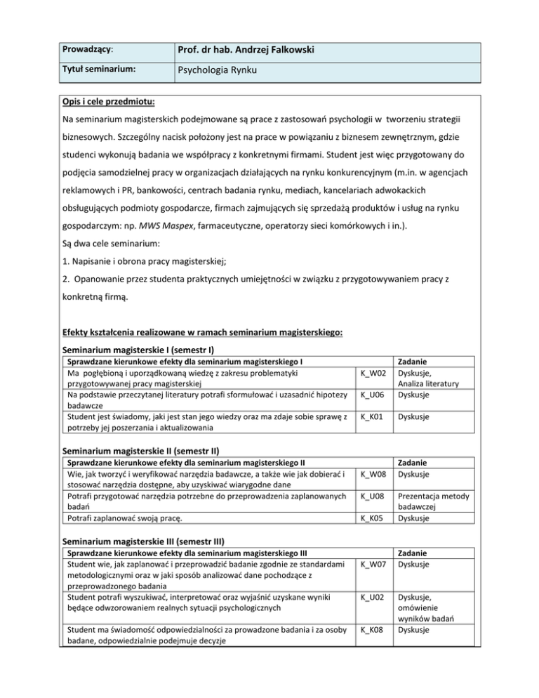 Prowadzący: Prof. dr hab. Andrzej Falkowski Tytuł seminarium: Psychologia Rynku Opis i cele przedmiotu: Na seminarium magisterskich podejmowane są prace z zastosowań psychologii w tworzeniu strategii biznesowych. Szczególny nacisk położony jest na prace w powiązaniu z biznesem zewnętrznym, gdzie studenci wykonują badania we współpracy z konkretnymi firmami. Student jest więc przygotowany do podjęcia samodzielnej pracy w organizacjach działających na rynku konkurencyjnym (m.in. w agencjach reklamowych i PR, bankowości, centrach badania rynku, mediach, kancelariach adwokackich obsługujących podmioty gospodarcze, firmach zajmujących się sprzedażą produktów i usług na rynku gospodarczym: np. MWS Maspex, farmaceutyczne, operatorzy sieci komórkowych i in.). Są dwa cele seminarium: 1. Napisanie i obrona pracy magisterskiej; 2. Opanowanie przez studenta praktycznych umiejętności w związku z przygotowywaniem pracy z konkretną firmą. Efekty kształcenia realizowane w ramach seminarium magisterskiego: Seminarium magisterskie I (semestr I) Sprawdzane kierunkowe efekty dla seminarium magisterskiego I Ma pogłębioną i uporządkowaną wiedzę z zakresu problematyki przygotowywanej pracy magisterskiej Na podstawie przeczytanej literatury potrafi sformułować i uzasadnić hipotezy badawcze Student jest świadomy, jaki jest stan jego wiedzy oraz ma zdaje sobie sprawę z potrzeby jej poszerzania i aktualizowania K_U06 Zadanie Dyskusje, Analiza literatury Dyskusje K_K01 Dyskusje K_W08 Zadanie Dyskusje K_W02 Seminarium magisterskie II (semestr II) Sprawdzane kierunkowe efekty dla seminarium magisterskiego II Wie, jak tworzyć i weryfikować narzędzia badawcze, a także wie jak dobierać i stosować narzędzia dostępne, aby uzyskiwać wiarygodne dane Potrafi przygotować narzędzia potrzebne do przeprowadzenia zaplanowanych badań Potrafi zaplanować swoją pracę. K_U08 K_K05 Prezentacja metody badawczej Dyskusje K_W07 Zadanie Dyskusje Seminarium magisterskie III (semestr III) Sprawdzane kierunkowe efekty dla seminarium magisterskiego III Student wie, jak zaplanować i przeprowadzić badanie zgodnie ze standardami metodologicznymi oraz w jaki sposób analizować dane pochodzące z przeprowadzonego badania Student potrafi wyszukiwać, interpretować oraz wyjaśnić uzyskane wyniki będące odwzorowaniem realnych sytuacji psychologicznych Student ma świadomość odpowiedzialności za prowadzone badania i za osoby badane, odpowiedzialnie podejmuje decyzje K_U02 K_K08 Dyskusje, omówienie wyników badań Dyskusje Seminarium magisterskie IV (semestr IV) Sprawdzane kierunkowe efekty dla seminarium magisterskiego IV Student wie, jak należy przygotować i napisać pracę magisterską (zasady etyczne, formalne i merytoryczne) Student potrafi przeanalizować i zinterpretować uzyskane wyniki, przeprowadzić ich dyskusję zgodnie z obowiązującymi go zasadami etyki i względami formalnymi Potrafi napisać pracę magisterską Świadomie stosuje się do zasad etyki zawodowej i w ich świetle rozpatruje napotykane trudności w realizacji projektu K_W13 K_U07 K_U12 K_K07 Zadanie Dyskusje Napisanie i złożenie pracy magisterskiej Dyskusje Tematyka i przykładowe pytania badawcze: Tworzenie wizerunku marki; Psychologia w sądzie: dowodzenie własności znaku towarowego; Lojalność wobec marki w aspekcie zachowań konsumenckich; Strategie promocyjno-reklamowe w aspekcie osobowościowej segmentacji rynku; Badanie postaw konsumenckich; Badanie osobowości marki; Strategie rozszerzania znaku towarowego; Wartość marki i jej struktura skojarzeniowa; Pozycjonowanie marki i reklamy; Strategie reklamowe w marketingu konsumenckim i politycznym. Przykładowe pytania: W jaki sposób można wykorzystywać prawa spostrzegania, uczenia się i pamięci, emocji i motywacji w tworzeniu reklamy i strategii marketingowych? Jak postrzegana jest osobowość marek produktów różnego rodzaju (np. publicznych i prywatnych, mocno angażujących i mało angażujących)? Jak silny jest efekt deprecjacji marki w negatywnych reklamach porównawczych? Jaką strategię obrony należy przyjąć w sytuacji naśladowania znaku towarowego przez firmę konkurencyjną? W jaki sposób należy budować wartość marki opartą o jej strukturę skojarzeniową? Jaki jest udział elementów poznawczych i emocjonalnych w preferencji produktu, marki lub partii politycznych? Przykładowe tytuły obronionych prac magisterskich: -) Znaczenie poczucia bezpieczeństwa i poziomu lęku w kształtowaniu lojalności wobec marki; -) Wizerunek marki a satysfakcja konsumenta. Psychologiczne badania nad preferencjami operatorów sieci komórkowych. -) Podobieństwo osobowości, satysfakcja i identyfikacja w preferencjach konsumenckich: Marketing usług na przykładzie banków: Pekao S.A., mBank, Millenium. -) Model wieloaspektowy i skalowanie wielowymiarowe w pozycjonowaniu marki: Badania empiryczne nad strukturą preferencji różnych form pomocy psychologicznej. -) Psychologiczna analiza podobieństwa opakowań kaw Tchibo i Leader Price w świetle prawa o zwalczaniu nieuczciwej konkurencji na rynku znaków towarowych. -) Funkcjonalna reklama wyobrażeniowa w marketingu usług turystycznych. -) Osobowość i lojalność wobec marki na rynku kosmetycznym. -) Neutralizacja efektu marketingowej krótkowzroczności w reklamach komercyjnych: Psychologiczne badania na rynku farmaceutycznym. -) Strategie cenowe produktów nisko i wysoko angażujących w kontekście Prawa Webera Wymagania wobec uczestników seminarium: Wiedza z zakresu psychologii i metodologii badań psychologicznych na poziomie przewidzianym przez materiał zaliczony w toku studiów na SWPS. Gotowość do rozszerzania własnej wiedzy psychologicznej i możliwości jej praktycznych zastosowań. Wstępny harmonogram pracy i warunki zaliczenia: Semestr I: ustalenie tematu pracy i opracowanie empirycznej procedury badawczej; Semestr II: przeprowadzenie badań empirycznych; Semest