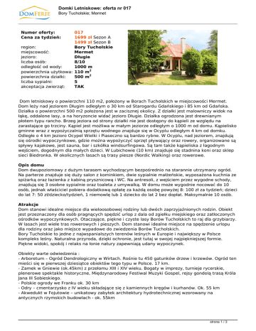 Domki Letniskowe: oferta nr 017 Bory Tucholskie; Mermet Numer oferty: Cena za tydzień: 017 1699 zł Sezon A 1499 zł Sezon B region: Bory Tucholskie miejscowość: Mermet jezioro: Długie liczba osób: 8/10 odległość od wody: 1000 m powierzchnia użytkowa: 110 m2 powierzchnia działki: 500 m2 liczba sypialni: 5 akceptacja zwierząt: TAK Dom letniskowy o powierzchni 110 m2, położony w Borach Tucholskich w miejscowości Mermet. Dom leży nad jeziorem Długim odległym o 30 km od Starogardu Gdańskiego i 85 km od Gdańska. Działka o powierzchni 500 m2 położona jest w zacisznej okolicy. Z działki jest malowniczy widok na łąkę, oddalone lasy, a na horyzoncie widać jezioro Długie. Działka ogrodzona jest drewnianym płotem typu rancho. Brzeg jeziora od strony działki nie jest dostępny do kąpieli ze względu na zarastające go trzciny. Kąpiel jest możliwa w małym jeziorze odległym o 1000 m od domu. Kąpielisko gminne wraz z wypożyczalnią sprzętu wodnego znajduje się w Ocyplu odległym 4 km od domku. Odległe o 4 km Jezioro Ocypel Wielki i Piaseczno są bardzo rybne. W Ocyplu, nad jeziorem, znajdują się ośrodki wypoczynkowe, gdzie można wypożyczyć sprzęt pływający oraz rowery, organizowane są spływy kajakowe, jest sauna, bar i szkółka windsurfingowa. Są tam także kąpieliska z łagodnym wejściem, dogodnym dla małych dzieci. W Lubichowie (10 km) znajduje się stadnina koni oraz sklep sieci Biedronka. W okolicznych lasach są trasy piesze (Nordic Walking) oraz rowerowe. Opis domu Dom dwupoziomowy z dużym tarasem wychodzącym bezpośrednio na starannie utrzymany ogród. Na parterze znajduje się duży salon z kominkiem, dwie sypialnie małżeńskie, wyposażona kuchnia ze spiżarką oraz łazienka z kabiną prysznicową i WC. Na antresoli, z wejściem przez wygodne schody, znajdują się 3 osobne sypialnie oraz toaleta z umywalką. W domu może wygodnie nocować do 10 osób, jednak właściciel pobiera dodatkową opłatę za każdą osobę powyżej 8: 100 zł za tydzień; dzieci do lat 7: 50 zł/dziecko/tydzień, 1 niemowlę lub 1 dziecko do lat 2 bez dopłat. Maksymalnie 10 osób. Atrakcje Dom stanowi idealne miejsce dla wieloosobowej rodziny lub dwóch zaprzyjaźnionych rodzin. Obiekt jest przeznaczony dla osób pragnących spędzić urlop z dala od zgiełku miejskiego oraz zatłoczonych ośrodków wypoczynkowych. Otaczające, piękne i czyste lasy Borów Tucholskich to raj dla grzybiarzy. W lasach jest wiele tras rowerowych i pieszych. Dom stanowi idealne miejsce na spędzenie urlopu dla rodziny oraz jako miejsce wypadowe do zwiedzenia Borów Tucholskich. Bory Tucholskie to jedne z najwspanialszych terenów leśnych w Europie i największy w Polsce kompleks leśny. Naturalna przyroda, dzięki ochronie, jest tutaj w swojej najpiękniejszej formie. Piękne widoki, spokój i relaks na łonie natury zapewniają udany wypoczynek. Obiekty warte odwiedzenia : - Arboretum – Ogród Dendrologiczny w Wirtach. Rośnie tu 450 gatunków drzew i krzewów. Ogród ten mieści się w pierwszej dziesiątce obiektów tego typu w Polsce. 17 km. - Zamek w Gniewie (ok.45km) z przełomu XIII i XIV wieku. Bogaty w imprezy, turnieje rycerskie, plenerowe spektakle historyczne, Międzynarodowy Festiwal Muzyki Gospel, rejsy gondolą trasą Króla Jana III Sobieskiego. - Polskie ogrody we Franku ok. 30 km - Odry – cmentarzysko z IV wieku składające się z kamiennych kręgów i kurhanów. Ok. 55 km - Akwedukt w Fojutowie – unikatowy zabytek architektury hydrotechnicznej wzorowany na antycznych rzymskich budowlach - ok. 55km strona 1 / 3 Domki Letniskowe: oferta nr 017 Bory Tucholskie; Mermet - Malbork z największym zamkiem Krzyżackim – 70 km - Trójmiasto – 90 km Charakterystyka obiektu: - Maksymalna liczba osób: 8/10* - 1 Sypialnia: łóżko małżeńskie: parter - 2 Sypialnia: łóżko małżeńskie: parter - 3 Sypialnia: 2 tapczany 1 os.: antresola - 4 Sypialnia: 2 tapczany 1 os.: antresola - 5 Sypialnia: 2 tapczany 1 os.: antresola - Bielizna pościelowa: odpłatnie - Salon z kominkiem: parter - Kuchnia: parter - Kuchenka 4 płyty z piekarnikiem.: elektryczna - Czajnik: tak - Łazienka z prysznicem + WC: parter - WC z umywalką: antresola - Lodówka/zamrażarka: tak Charakterystyka obiektu, c.d.: - Ciepła woda: tak - Ogrzewanie: elektryczne - TV 4 programy krajowe: tak - Meble ogrodowe: tak - Zwierzęta domowe: tak - Grill stacjonarny: tak - Grill stacjonarny: tak - Kąpiel w jeziorze: 1000 m - Przystań, wypożyczalnia: 4 km - Wędkowanie: wykup zezwolenia - Restauracja: 4 km - Lekarz, ośr. zdrowia: 10 km - Sklep spożywczy: 4 km - Stadnina koni: 6 km - Gminne kąpielisko: 4 km * DOPŁATA ZA KAŻDĄ OSOBĘ POWYŻEJ 8: 100 zł ZA TYDZIEŃ; dzieci do lat 7: 50 zł/dziecko/tydzień, 1 niemowlę lub 1 dziecko do lat 2 bez dopłat.Maksymalnie 10 osób. CENNIK: Podana poniżej i wyróżniona na pomarańczowo cena jest całkowitą ceną wynajmu domu na 1 tydzień - od soboty do soboty (zawiera w sobie kwotę rezerwacji i zaliczki). Dodatkowo dolicza się podane niżej opłady obowiązkowe i/lub nieobowiązkowe. wynajem za 1 tydzień w tym: Sezon A Sezon B TYLKO Weekendy: 25.06. - 20.08.2011. Poza sezonem A 29.04 - 03.05 (4 doby) 1699 zł/tydz (8 osób) 1499 zł/tydz (8 osób) 1100 zł za 3 doby 1350 zł za 4 doby - rezerwacja 299 zł/tydz 299 zł/tydz 350 zł/pobyt - zaliczka 200 zł/tydz 200 zł/tydz 200 zł/pobyt OPŁATY DODATKOWE: 1. Zużycie energii elekt. wg wskazań licznika; koszt 70 gr. za 1 kWh. 2. Dopłata za każdą osobę powyżej 8: 100 zł za tydzień; dzieci do lat 7: 50 zł/tydzień, 1 niemowlę lub 1 dziecko do lat 2 bez dopłat. Maksymalnie 10 osób. 3. Sprzątanie domu po zakończeniu turnusu 100 zł jeżeli najemca nie chce sam wykonać tej pracy 4. Drewno do kominka wiązka 30 zł 5. Bielizna pościelowa: 15 zł/osoba strona 2 / 3 Domki Letniskowe: oferta nr 017 Bory Tucholskie; Mermet 6. Każde zwierzę 50 zł/tydzień KAUCJA 300 zł Kaucja, pobi