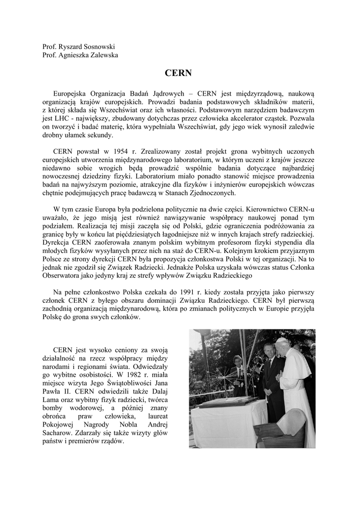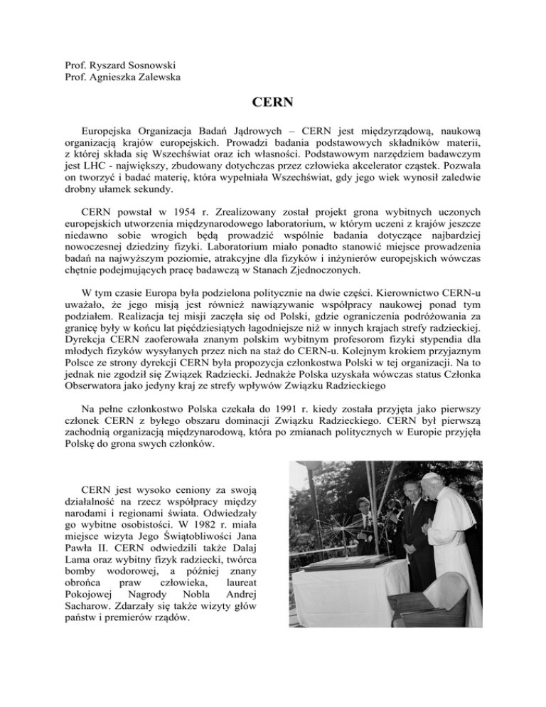 Prof. Ryszard Sosnowski Prof. Agnieszka Zalewska CERN Europejska Organizacja Badań Jądrowych – CERN jest międzyrządową, naukową organizacją krajów europejskich. Prowadzi badania podstawowych składników materii, z której składa się Wszechświat oraz ich własności. Podstawowym narzędziem badawczym jest LHC - największy, zbudowany dotychczas przez człowieka akcelerator cząstek. Pozwala on tworzyć i badać materię, która wypełniała Wszechświat, gdy jego wiek wynosił zaledwie drobny ułamek sekundy. CERN powstał w 1954 r. Zrealizowany został projekt grona wybitnych uczonych europejskich utworzenia międzynarodowego laboratorium, w którym uczeni z krajów jeszcze niedawno sobie wrogich będą prowadzić wspólnie badania dotyczące najbardziej nowoczesnej dziedziny fizyki. Laboratorium miało ponadto stanowić miejsce prowadzenia badań na najwyższym poziomie, atrakcyjne dla fizyków i inżynierów europejskich wówczas chętnie podejmujących pracę badawczą w Stanach Zjednoczonych. W tym czasie Europa była podzielona politycznie na dwie części. Kierownictwo CERN-u uważało, że jego misją jest również nawiązywanie współpracy naukowej ponad tym podziałem. Realizacja tej misji zaczęła się od Polski, gdzie ograniczenia podróżowania za granicę były w końcu lat pięćdziesiątych łagodniejsze niż w innych krajach strefy radzieckiej. Dyrekcja CERN zaoferowała znanym polskim wybitnym profesorom fizyki stypendia dla młodych fizyków wysyłanych przez nich na staż do CERN-u. Kolejnym krokiem przyjaznym Polsce ze strony dyrekcji CERN była propozycja członkostwa Polski w tej organizacji. Na to jednak nie zgodził się Związek Radziecki. Jednakże Polska uzyskała wówczas status Członka Obserwatora jako jedyny kraj ze strefy wpływów Związku Radzieckiego Na pełne członkostwo Polska czekała do 1991 r. kiedy została przyjęta jako pierwszy członek CERN z byłego obszaru dominacji Związku Radzieckiego. CERN był pierwszą zachodnią organizacją międzynarodową, która po zmianach politycznych w Europie przyjęła Polskę do grona swych członków. CERN jest wysoko ceniony za swoją działalność na rzecz współpracy między narodami i regionami świata. Odwiedzały go wybitne osobistości. W 1982 r. miała miejsce wizyta Jego Świątobliwości Jana Pawła II. CERN odwiedzili także Dalaj Lama oraz wybitny fizyk radziecki, twórca bomby wodorowej, a później znany obrońca praw człowieka, laureat Pokojowej Nagrody Nobla Andrej Sacharow. Zdarzały się także wizyty głów państw i premierów rządów. Różne aspekty uczestnictwa Polski w CERN Naukowy CERN jest obecnie największym światowym laboratorium w dziedzinie fizyki cząstek; które liczy ok. 6700 zarejestrowanych użytkowników z krajów europejskich i ok. 3700 spoza Europy oraz zatrudnia ok. 2900 fizyków, inżynierów, techników i specjalistów innych dziedzin. Użytkowników z Polski jest ok. 260, a zatrudnionych na etatach (nie tylko naukowych i technicznych) w CERN-ie jest około 90 Polaków (z czego 32 na pozycjach dla osób niedługo po doktoracie). W ostatnich latach w eksperymentach przeprowadzanych w CERN (w tym w czterech wielkich eksperymentach przy akceleratorze LHC) bierze udział ok. 60% polskich fizyków cząstek, a publikacje z udziałem polskich autorów, wynikające z badań prowadzonych w CERN, stanowią większość publikacji w dziedzinie fizyki i astrofizyki cząstek. Polscy naukowcy są widoczni w CERN: prof. E. Rondio jest członkiem Biura Dyrekcji CERN, dr Andrzej Siemko jest kierownikiem ważnej grupy inżynieryjnej, a dr Tadeusz Kurtyka pełni funkcję „ambasadora” CERN w kontaktach z nienależącymi do CERN krajami Europy wschodniej, Rosją i krajami Azji Środkowej. Profesor M. Gaździcki jest rzecznikiem eksperymentu NA61, a prof. K. Meissner współrzecznikiem eksperymentu OSQAR. W ubiegłych latach prof. R.Sosnowski był z-cą przewodniczącego Rady CERN, a prof. M. Turala dyrektorem jednego z oddziałów CERN; profesorowie. A. K. Wróblewski, K. Rybicki i A. Zalewska byli członkami SPC czyli Rady Polityki Naukowej (składającej się z około 20-tu wybitnych fizykow z całego świata); profesorowie H. Białkowska, J. Nassalski, S. Pokorski, M. Turała i A. Zalewska byli członkami tematycznych komitetów naukowych CERN; szereg osób uczestniczyło i nadal uczestniczy w rożnych ciałach kierowniczych eksperymentów, przede wszystkim przy LHC; prof. A. Zalewska była członkiem 10osobowego komitetu d/s wyboru obecnego dyrektora CERN oraz przewodniczyła 6osobowemu panelowi SPC d/s przyszłości europejskiej fizyki neutrin. Polityczny „CERN – mała Europa”, był i jest modelem dobrej współpracy międzynarodowej. Obecnie o przyjęcie do CERN starają się nowe kraje europejskie: Cypr, Serbia i Słowenia, a z krajów pozaeuropejskich Izrael i Turcja. Prowadzone są rozmowy w sprawie statusu kraju stowarzyszonego z Brazylią, Chinami, Japonią, Indiami, Kanadą, Koreą, Rosją i USA. Edukacyjny CERN prowadzi specjalne programy edukacyjne dla studentów i młodych naukowców w dziedzinach nauk stosowanych, które obejmują kilkumiesięczne studia letnie, staże dyplomowe i studia doktoranckie. Aktualnie na stażach dyplomowych i doktoranckich przebywa 47 polskich stażystów, a każdego roku latem jest 3-4 polskich studentów – przede wszystkim fizyki. Od wielu lat CERN prowadzi szkolenia dla nauczycieli fizyki, przy czym od czterech lat tygodniowe kursy w językach ojczystych. W 12 kursach zorganizowanych w latach 2007 – 2010 uczestniczyło łącznie ok. 500 polskich nauczycieli fizyki. Dla uczestników kursów organizowane też są warsztaty w kraju (http://cern.codn.edu.pl/). Opiekę nad programem dla polskich nauczycieli sprawuje dr Andrzej Siemko. Prowadzone są Coroczne Międzynarodowe Warsztaty Fizyki Cząstek dla uczniów szkół średnich, w których uczestniczy ponad 4000 uczniów z całego świata, w tym z Polski. N