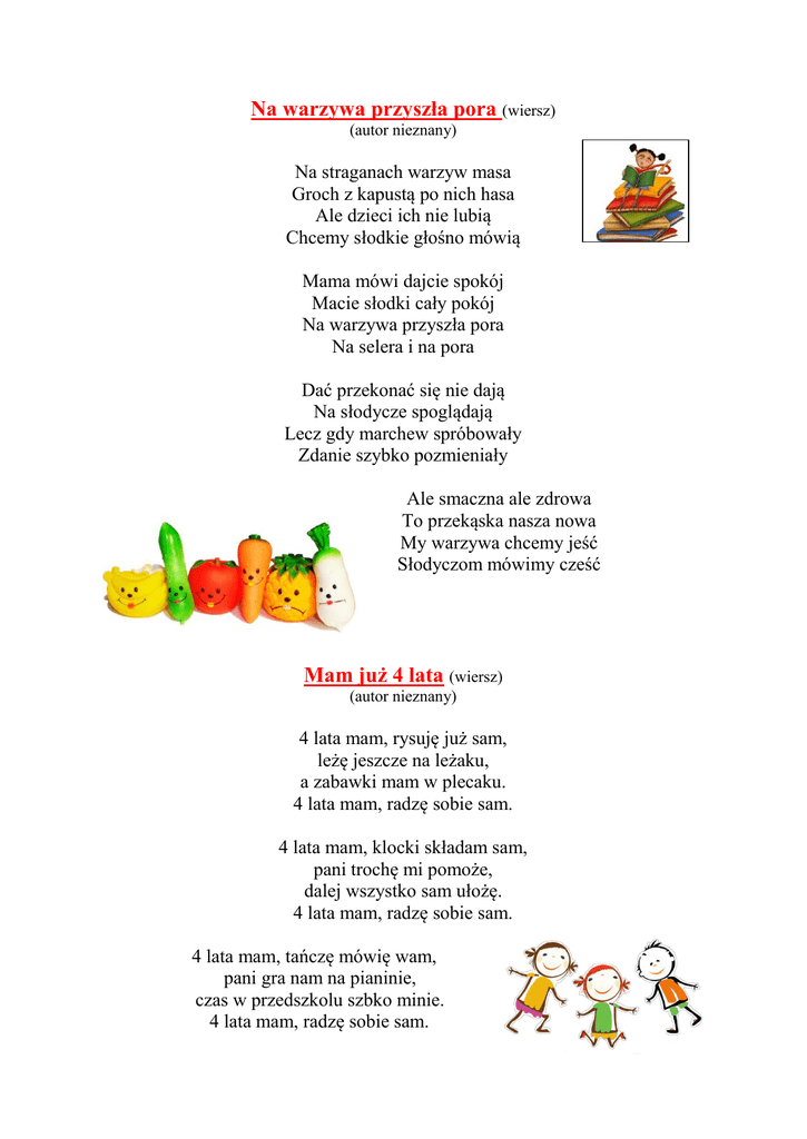 Na warzywa przyszła pora (wiersz) (autor nieznany) Na straganach warzyw masa Groch z kapustą po nich hasa Ale dzieci ich nie lubią Chcemy słodkie głośno mówią Mama mówi dajcie spokój Macie słodki cały pokój Na warzywa przyszła pora Na selera i na pora Dać przekonać się nie dają Na słodycze spoglądają Lecz gdy marchew spróbowały Zdanie szybko pozmieniały Ale smaczna ale zdrowa To przekąska nasza nowa My warzywa chcemy jeść Słodyczom mówimy cześć Mam już 4 lata (wiersz) (autor nieznany) 4 lata mam, rysuję już sam, leżę jeszcze na leżaku, a zabawki mam w plecaku. 4 lata mam, radzę sobie sam. 4 lata mam, klocki składam sam, pani trochę mi pomoże, dalej wszystko sam ułożę. 4 lata mam, radzę sobie sam. 4 lata mam, tańczę mówię wam, pani gra nam na pianinie, czas w przedszkolu szbko minie. 4 lata mam, radzę sobie sam.