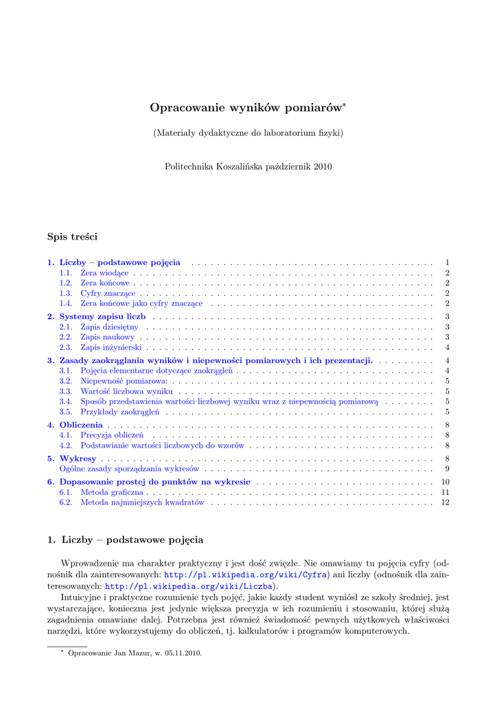Opracowanie wyników pomiarów* (Materiały dydaktyczne do laboratorium fizyki) Politechnika Koszalińska październik 2010 Spis treści 1. Liczby – podstawowe pojęcia . . . 1.1. Zera wiodące . . . . . . . . . . . . 1.2. Zera końcowe . . . . . . . . . . . . 1.3. Cyfry znaczące . . . . . . . . . . . 1.4. Zera końcowe jako cyfry znaczące . . . . . . . . . . . . . . . . . . . . . . . . . . . . . . . . . . . . . . . . . . . . . . . . . . . . . . . . . . . . . . . . . . . . . . . . . . . . . . . . . . . . . . . . . . . . . . . . . . . . . . . . . . . . . . . . . . . . . . . . . . . . . . . . . . . . . . . . . . . . . . . . . . . . . . . . . . . . . . . . . . . . . . . . . . . . . . . 1 2 2 2 2 2. Systemy zapisu liczb 2.1. Zapis dziesiętny . 2.2. Zapis naukowy . . 2.3. Zapis inżynierski . . . . . . . . . . . . . . . . . . . . . . . . . . . . . . . . . . . . . . . . . . . . . . . . . . . . . . . . . . . . . . . . . . . . . . . . . . . . . . . . . . . . . . . . . . . . . . . . . . . . . . . . . . . . . . . . . . . . . . . . . . . . . . . . . . . . . . . . . . . . . 3 3 3 4 3. Zasady zaokrąglania wyników i niepewności pomiarowych i ich prezentacji. . 3.1. Pojęcia elementarne dotyczące zaokrągleń . . . . . . . . . . . . . . . . . . . . . . . 3.2. Niepewność pomiarowa: . . . . . . . . . . . . . . . . . . . . . . . . . . . . . . . . . 3.3. Wartość liczbowa wyniku . . . . . . . . . . . . . . . . . . . . . . . . . . . . . . . . 3.4. Sposób przedstawienia wartości liczbowej wyniku wraz z niepewnością pomiarową 3.5. Przykłady zaokrągleń . . . . . . . . . . . . . . . . . . . . . . . . . . . . . . . . . . . . . . . . . . . . . . . . . . . . . . . . . . . . . . . . . . . . . . . . . . . . . . . . . . 4 4 5 5 5 5 4. Obliczenia . . . . . . . . . . . . . . . . . . . . . . . . . . . . . . . . . . . . . . . . . . . . . . . . . . . 4.1. Precyzja obliczeń . . . . . . . . . . . . . . . . . . . . . . . . . . . . . . . . . . . . . . . . . . . . 4.2. Podstawianie wartości liczbowych do wzorów . . . . . . . . . . . . . . . . . . . . . . . . . . . . . 8 8 8 5. Wykresy . . . . . . . . . . . . . . . . . . . . . . . . . . . . . . . . . . . . . . . . . . . . . . . . . . . . Ogólne zasady sporządzania wykresów . . . . . . . . . . . . . . . . . . . . . . . . . . . . . . . . . . . . 8 9 6. Dopasowanie prostej do punktów na wykresie . . . . . . . . . . . . . . . . . . . . . . . . . . . . 6.1. Metoda graficzna . . . . . . . . . . . . . . . . . . . . . . . . . . . . . . . . . . . . . . . . . . . . . 6.2. Metoda najmniejszych kwadratów . . . . . . . . . . . . . . . . . . . . . . . . . . . . . . . . . . . 10 11 12 . . . . . . . . . . . . . . . . . . . . . . . . . . . . . . . . . . . . 1. Liczby – podstawowe pojęcia Wprowadzenie ma charakter praktyczny i jest dość zwięzłe. Nie omawiamy tu pojęcia cyfry (odnośnik dla zainteresowanych: http://pl.wikipedia.org/wiki/Cyfra) ani liczby (odnośnik dla zainteresowanych: http://pl.wikipedia.org/wiki/Liczba). Intuicyjne i praktyczne rozumienie tych pojęć, jakie każdy student wyniósł ze szkoły średniej, jest wystarczające, konieczna jest jedynie większa precyzja w ich rozumieniu i stosowaniu, której służą zagadnienia omawiane dalej. Potrzebna jest również świadomość pewnych użytkowych właściwości narzędzi, które wykorzystujemy do obliczeń, tj. kalkulatorów i programów komputerowych. * Opracowanie Jan Mazur, w. 05.11.2010. 2 Rys. 1. Przykład zer wiodących, końcowych i cyfr znaczących 1.1. Zera wiodące 1. Jest to ciąg zer z lewej strony liczby, poprzedzający pierwszą cyfrę różną od zera (patrz rys. 1). Należy zwrócić uwagę, że liczba zer wiodących zmieni się, jeśli zmienimy jednostkę (np. masę elektronu na rys. 1 przedstawimy w gramach), lub jeśli z liczby wyłączymy czynnik 10n i przedstawimy liczbę w postaci iloczynowej. 2. Ponieważ ilość zer wiodących może się zmieniać, zatem zera wiodące nie mogą być cyframi znaczącymi. 1.2. Zera końcowe 1. Jest to ciąg zer położony w prawej części liczby bezpośrednio za ostatnią cyfrą różną od zera. Liczba zer końcowych, podobnie jak i wiodących może być różna, z tych samych powodów jak wyżej. Jest jednak jedna istotna różnica między nimi. 2. Część (a nawet wszystkie), licząc od lewej strony, zer końcowych mogą być cyframi znaczącymi. Zależy to od znaczenia poszczególnych zer końcowych, a zatem od znaczenia liczby. 1.3. Cyfry znaczące 1. Na podstawie powyższego można powiedzieć, że cyfry znaczące to ciąg cyfr znajdujący się pomiędzy zerami wiodącymi a zerami końcowymi. 2. Część ciągu zer końcowych (a nawet wszystkie) biorąc z lewej strony, może być cyframi znaczącymi. 1.4. Zera końcowe jako cyfry znaczące 1. Na rys. 1, w liczbie określającej masę Ziemi żadne z zer końcowych nie jest cyfrą znaczącą, gdyż masa Ziemi jest tu podana z dokładnością do pierwszych 5 cyfr. Inny przykład: jeśli wygrana w Lotka wyniosła około 1 000 000 zł (czyli mogła wynieść np. 960 000 lub 1 200 000, każda z tych liczb zaokrąglona do 1 mln daje 1 mln czyli 1 000 000) to żadne z zer końcowych nie jest znaczące (tzn. nie jest cyfrą znaczącą). Jeśli jednak wygrana wyniosła dokładnie 1 000 000 to wszystkie zera końcowe są znaczące. 3 2. Sytuacja kiedy możemy w zapisie liczby uwzględnić zera końcowe lub nie, występuje dla liczb mających separator dziesiętny, np. jeśli podajemy jakąś wartość równą np. 1,12500 to rozumiemy, że dwa zera na końcu są cyframi znaczącymi. Gdyby nie były, to powinniśmy zapisać 1,125. 3. W liczbach mających część dziesiętną możemy stosować zasadę, że jeśli znajdują się w niej zera końcowe to znaczy, że zostały umieszczone tam celowo dla zaznaczenia, że są one cyframi znaczącymi. Czyli ogólnie, że ostatnia cyfra po przecinku jest ostatnią cyfrą znaczącą liczby, nawet jeśli ta cyfra jest zerem. 4. W liczbach całkowitych