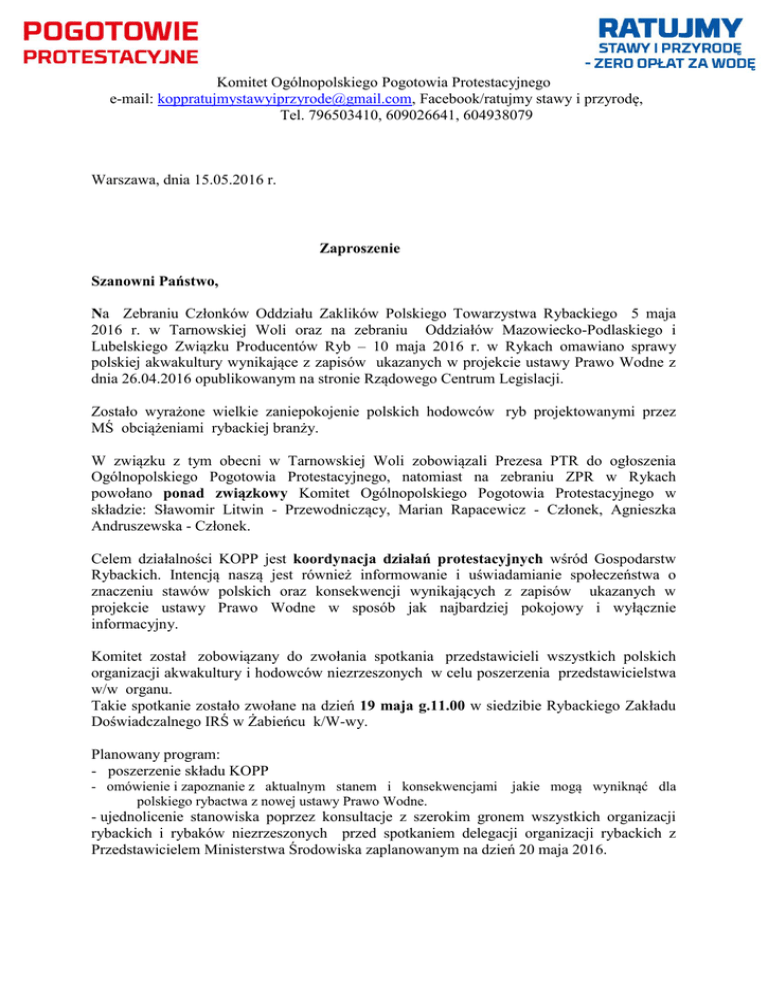 Komitet Ogólnopolskiego Pogotowia Protestacyjnego e-mail: [email protected], Facebook/ratujmy stawy i przyrodę, Tel. 796503410, 609026641, 604938079 Warszawa, dnia 15.05.2016 r. Zaproszenie Szanowni Państwo, Na Zebraniu Członków Oddziału Zaklików Polskiego Towarzystwa Rybackiego 5 maja 2016 r. w Tarnowskiej Woli oraz na zebraniu Oddziałów Mazowiecko-Podlaskiego i Lubelskiego Związku Producentów Ryb – 10 maja 2016 r. w Rykach omawiano sprawy polskiej akwakultury wynikające z zapisów ukazanych w projekcie ustawy Prawo Wodne z dnia 26.04.2016 opublikowanym na stronie Rządowego Centrum Legislacji. Zostało wyrażone wielkie zaniepokojenie polskich hodowców ryb projektowanymi przez MŚ obciążeniami rybackiej branży. W związku z tym obecni w Tarnowskiej Woli zobowiązali Prezesa PTR do ogłoszenia Ogólnopolskiego Pogotowia Protestacyjnego, natomiast na zebraniu ZPR w Rykach powołano ponad związkowy Komitet Ogólnopolskiego Pogotowia Protestacyjnego w składzie: Sławomir Litwin - Przewodniczący, Marian Rapacewicz - Członek, Agnieszka Andruszewska - Członek. Celem działalności KOPP jest koordynacja działań protestacyjnych wśród Gospodarstw Rybackich. Intencją naszą jest również informowanie i uświadamianie społeczeństwa o znaczeniu stawów polskich oraz konsekwencji wynikających z zapisów ukazanych w projekcie ustawy Prawo Wodne w sposób jak najbardziej pokojowy i wyłącznie informacyjny. Komitet został zobowiązany do zwołania spotkania przedstawicieli wszystkich polskich organizacji akwakultury i hodowców niezrzeszonych w celu poszerzenia przedstawicielstwa w/w organu. Takie spotkanie zostało zwołane na dzień 19 maja g.11.00 w siedzibie Rybackiego Zakładu Doświadczalnego IRŚ w Żabieńcu k/W-wy. Planowany program: - poszerzenie składu KOPP - omówienie i zapoznanie z aktualnym stanem i konsekwencjami polskiego rybactwa z nowej ustawy Prawo Wodne. jakie mogą wyniknąć dla - ujednolicenie stanowiska poprzez konsultacje z szerokim gronem wszystkich organizacji rybackich i rybaków niezrzeszonych przed spotkaniem delegacji organizacji rybackich z Przedstawicielem Ministerstwa Środowiska zaplanowanym na dzień 20 maja 2016. Komitet Ogólnopolskiego Pogotowia Protestacyjnego e-mail: [email protected], Facebook/ratujmy stawy i przyrodę, Tel. 796503410, 609026641, 604938079 Informuję także, że zaproszenie na w/w spotkanie przesyłam do Ministra Gospodarki Morskiej i Żeglugi Śródlądowej Pana Marka Gróbarczyka z prośba o oddelegowanie obserwatora i doradcy w naszej rybackiej sprawie związanej z ustawą PW. Organizacje rybackie i kolegów hodowców niezrzeszonych proszę o mailowe potwierdzenie uczestnictwa w w/w spotkaniu. [email protected]. Z rybackim pozdrowieniem, Sławomir Litwin – Przewodniczący KOPP