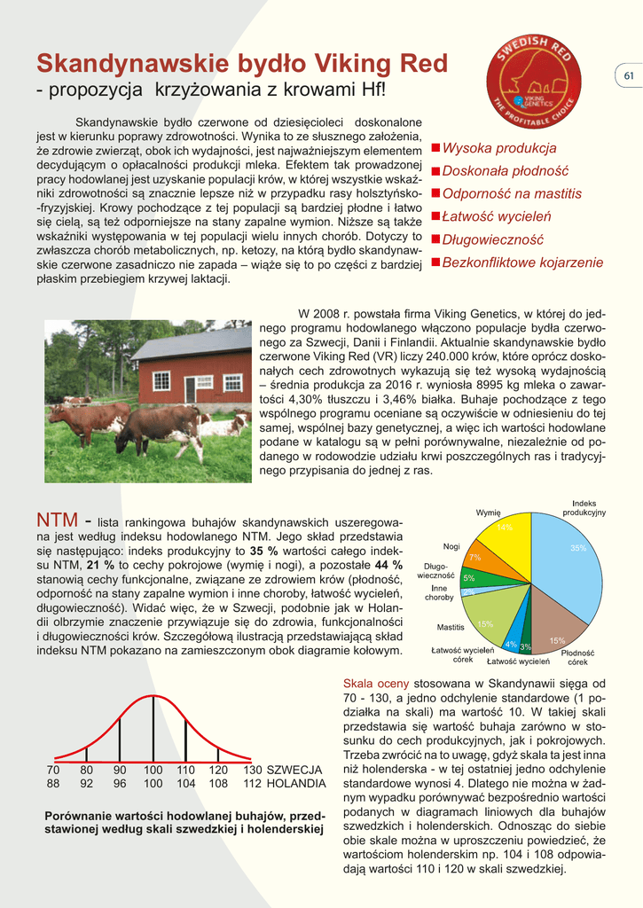 Skandynawskie bydło Viking Red 61 - propozycja krzyżowania z krowami Hf! Skandynawskie bydło czerwone od dziesięcioleci doskonalone jest w kierunku poprawy zdrowotności. Wynika to ze słusznego założenia, że zdrowie zwierząt, obok ich wydajności, jest najważniejszym elementem decydującym o opłacalności produkcji mleka. Efektem tak prowadzonej pracy hodowlanej jest uzyskanie populacji krów, w której wszystkie wskaźniki zdrowotności są znacznie lepsze niż w przypadku rasy holsztyńsko-fryzyjskiej. Krowy pochodzące z tej populacji są bardziej płodne i łatwo się cielą, są też odporniejsze na stany zapalne wymion. Niższe są także wskaźniki występowania w tej populacji wielu innych chorób. Dotyczy to zwłaszcza chorób metabolicznych, np. ketozy, na którą bydło skandynawskie czerwone zasadniczo nie zapada – wiąże się to po części z bardziej płaskim przebiegiem krzywej laktacji. Wysoka produkcja Doskonała płodność Odporność na mastitis Łatwość wycieleń Długowieczność Bezkonfliktowe kojarzenie W 2008 r. powstała firma Viking Genetics, w której do jednego programu hodowlanego włączono populacje bydła czerwonego za Szwecji, Danii i Finlandii. Aktualnie skandynawskie bydło czerwone Viking Red (VR) liczy 240.000 krów, które oprócz doskonałych cech zdrowotnych wykazują się też wysoką wydajnością – średnia produkcja za 2016 r. wyniosła 8995 kg mleka o zawartości 4,30% tłuszczu i 3,46% białka. Buhaje pochodzące z tego wspólnego programu oceniane są oczywiście w odniesieniu do tej samej, wspólnej bazy genetycznej, a więc ich wartości hodowlane podane w katalogu są w pełni porównywalne, niezależnie od podanego w rodowodzie udziału krwi poszczególnych ras i tradycyjnego przypisania do jednej z ras. NTM - lista rankingowa buhajów skandynawskich uszeregowana jest według indeksu hodowlanego NTM. Jego skład przedstawia się następująco: indeks produkcyjny to 35 % wartości całego indeksu NTM, 21 % to cechy pokrojowe (wymię i nogi), a pozostałe 44 % stanowią cechy funkcjonalne, związane ze zdrowiem krów (płodność, odporność na stany zapalne wymion i inne choroby, łatwość wycieleń, długowieczność). Widać więc, że w Szwecji, podobnie jak w Holandii olbrzymie znaczenie przywiązuje się do zdrowia, funkcjonalności i długowieczności krów. Szczegółową ilustracją przedstawiającą skład indeksu NTM pokazano na zamieszczonym obok diagramie kołowym. 70 88 80 92 90 96 100 100 110 104 120 108 130 SZWECJA 112 HOLANDIA Porównanie wartości hodowlanej buhajów, przedstawionej według skali szwedzkiej i holenderskiej 14% 35% 7% 5% 2% 15% 4% 3% 15% Skala oceny stosowana w Skandynawii sięga od 70 - 130, a jedno odchylenie standardowe (1 podziałka na skali) ma wartość 10. W takiej skali przedstawia się wartość buhaja zarówno w stosunku do cech produkcyjnych, jak i pokrojowych. Trzeba zwrócić na to uwagę, gdyż skala ta jest inna niż holenderska - w tej ostatniej jedno odchylenie standardowe wynosi 4. Dlatego nie można w żadnym wypadku porównywać bezpośrednio wartości podanych w diagramach liniowych dla buhajów szwedzkich i holenderskich. Odnosząc do siebie obie skale można w uproszczeniu powiedzieć, że wartościom holenderskim np. 104 i 108 odpowiadają wartości 110 i 120 w skali szwedzkiej.
