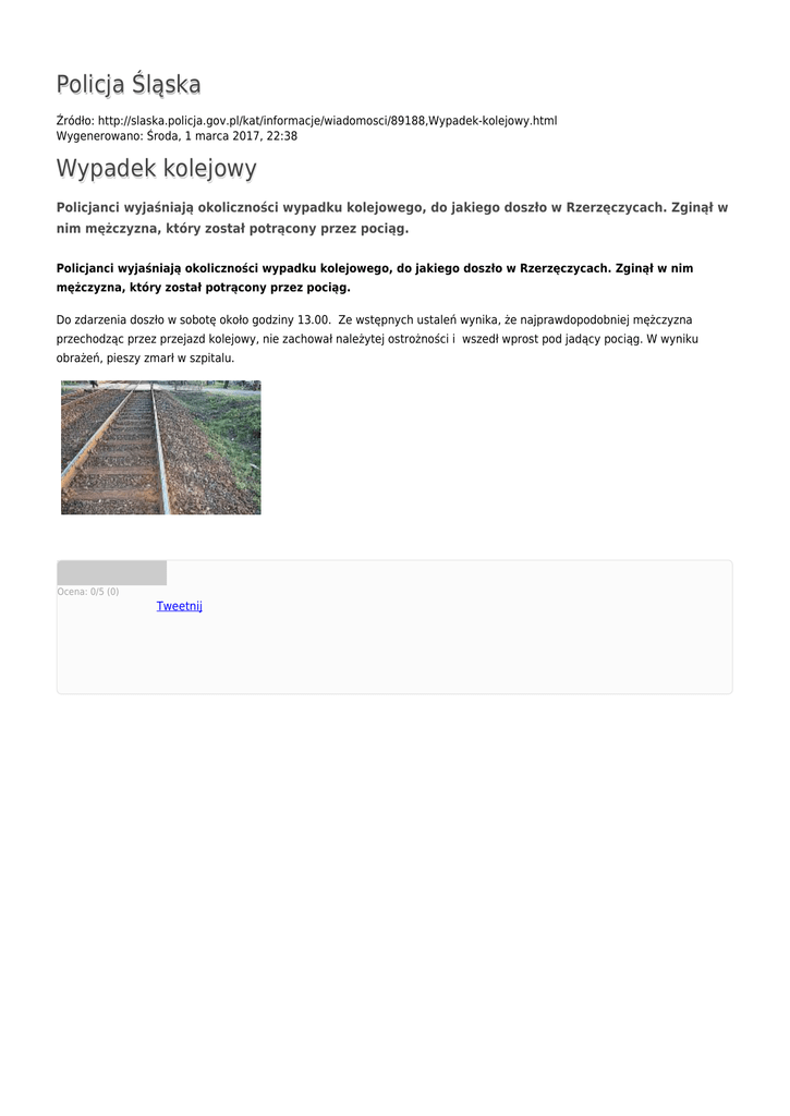 Policja Śląska Źródło: http://slaska.policja.gov.pl/kat/informacje/wiadomosci/89188,Wypadek-kolejowy.html Wygenerowano: Środa, 1 marca 2017, 22:38 Wypadek kolejowy Policjanci wyjaśniają okoliczności wypadku kolejowego, do jakiego doszło w Rzerzęczycach. Zginął w nim mężczyzna, który został potrącony przez pociąg. Policjanci wyjaśniają okoliczności wypadku kolejowego, do jakiego doszło w Rzerzęczycach. Zginął w nim mężczyzna, który został potrącony przez pociąg. Do zdarzenia doszło w sobotę około godziny 13.00. Ze wstępnych ustaleń wynika, że najprawdopodobniej mężczyzna przechodząc przez przejazd kolejowy, nie zachował należytej ostrożności i wszedł wprost pod jadący pociąg. W wyniku obrażeń, pieszy zmarł w szpitalu. Ocena: 0/5 (0) Tweetnij