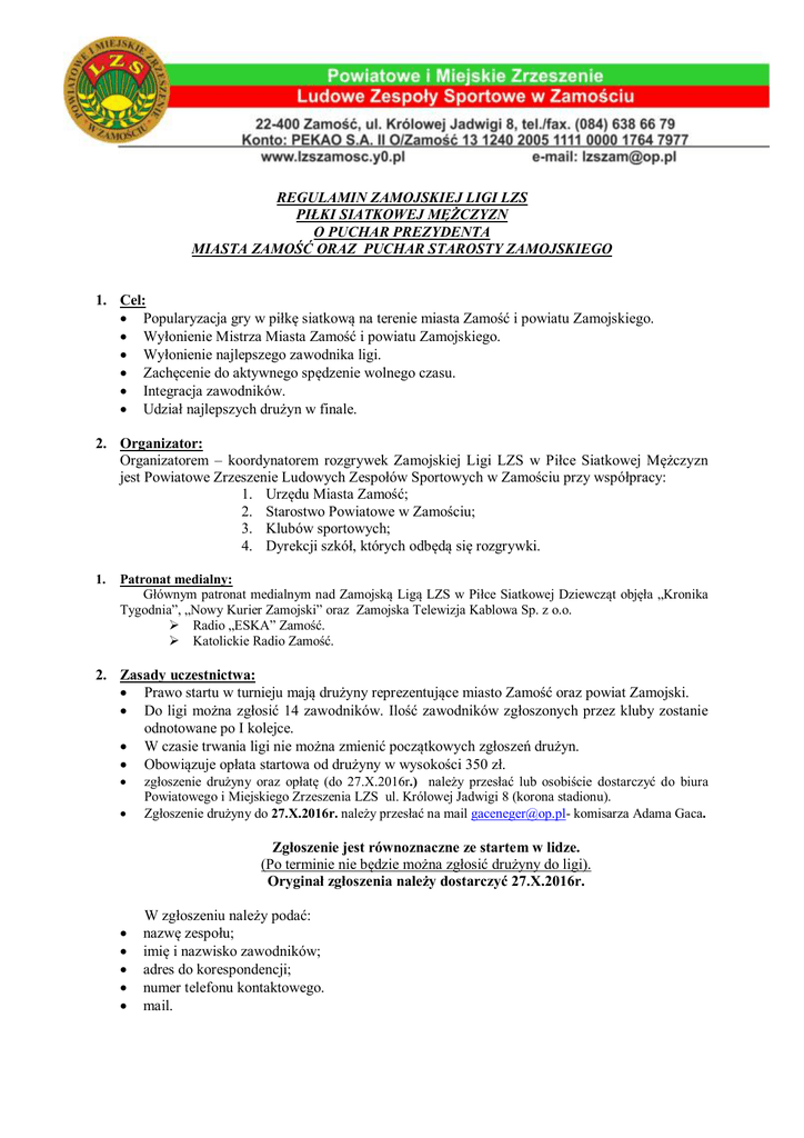 REGULAMIN ZAMOJSKIEJ LIGI LZS PIŁKI SIATKOWEJ MĘŻCZYZN O PUCHAR PREZYDENTA MIASTA ZAMOŚĆ ORAZ PUCHAR STAROSTY ZAMOJSKIEGO 1. Cel: Popularyzacja gry w piłkę siatkową na terenie miasta Zamość i powiatu Zamojskiego. Wyłonienie Mistrza Miasta Zamość i powiatu Zamojskiego. Wyłonienie najlepszego zawodnika ligi. Zachęcenie do aktywnego spędzenie wolnego czasu. Integracja zawodników. Udział najlepszych drużyn w finale. 2. Organizator: Organizatorem – koordynatorem rozgrywek Zamojskiej Ligi LZS w Piłce Siatkowej Mężczyzn jest Powiatowe Zrzeszenie Ludowych Zespołów Sportowych w Zamościu przy współpracy: 1. Urzędu Miasta Zamość; 2. Starostwo Powiatowe w Zamościu; 3. Klubów sportowych; 4. Dyrekcji szkół, których odbędą się rozgrywki. 1. Patronat medialny: Głównym patronat medialnym nad Zamojską Ligą LZS w Piłce Siatkowej Dziewcząt objęła „Kronika Tygodnia”, „Nowy Kurier Zamojski” oraz Zamojska Telewizja Kablowa Sp. z o.o. Radio „ESKA” Zamość. Katolickie Radio Zamość. 2. Zasady uczestnictwa: Prawo startu w turnieju mają drużyny reprezentujące miasto Zamość oraz powiat Zamojski. Do ligi można zgłosić 14 zawodników. Ilość zawodników zgłoszonych przez kluby zostanie odnotowane po I kolejce. W czasie trwania ligi nie można zmienić początkowych zgłoszeń drużyn. Obowiązuje opłata startowa od drużyny w wysokości 350 zł. zgłoszenie drużyny oraz opłatę (do 27.X.2016r.) należy przesłać lub osobiście dostarczyć do biura Powiatowego i Miejskiego Zrzeszenia LZS ul. Królowej Jadwigi 8 (korona stadionu). Zgłoszenie drużyny do 27.X.2016r. należy przesłać na mail [email protected] komisarza Adama Gaca. Zgłoszenie jest równoznaczne ze startem w lidze. (Po terminie nie będzie można zgłosić drużyny do ligi). Oryginał zgłoszenia należy dostarczyć 27.X.2016r. W zgłoszeniu należy podać: nazwę zespołu; imię i nazwisko zawodników; adres do korespondencji; numer telefonu kontaktowego. mail. Odpowiedzialni za ligę: Komisarz ligi: - Adam Gaca tel. 606 703 349 V-ce Przewodniczący Rady Powiatowej i Miejskiej LZS w Zamościu: - Krzysztof Pszenniak tel. 663 741 458 3. System rozgrywek: liga rozgrywana będzie systemem „każdy z każdym” z finałem; mecze sędziują sędziowie zgodnie z przepisami PZPS. 4. Zasady klasyfikacji: Ocena wyników we wszystkich spotkaniach jest następująca: za wygrany mecz 2-0 zespół otrzymuje 3 (trzy) punkty, za wygrany mecz 2-1 zespół otrzymuje 2 (dwa) punkt, za mecz przegrany 1-2 zespół otrzymuje 1 (jeden) punktów, za mecz przegrany 0-2 zespół otrzymuje 0 (zero) punktów, za mecz oddany walkowerem zespołowi zostanie odjęty 1 (jeden) punkt. Zespół, który odda w rozgrywkach 3 (trzy) walkowery zostaje automatycznie wycofany z rozgrywek. O kolejności miejsc w tabeli rozgrywek decydują zdobyte duże punkty. Zespół, który zdobył większą ilość punktów zajmuje wyższe miejsce w tabeli rozgrywek.. W przypadku uzyskania przez dwa lub więcej zespołów równej ilości dużych punktów o kolejności miejsc w tabeli rozgrywek decydują kolejno: stosunek pomiędzy ogólną liczbą zdobytych i straconych setów we wszystkich rozegranych spotkaniach, stosunek pomiędzy ogólną liczbą zdobytych i straconych małych punktów we wszystkich rozegranych setach w spotkaniach, wynik bezpośredniego spotkania. Za korzystniejszy uznawany jest zawsze ten ze stosunków, który jest liczbowo większy. 5. Nagrody: Trzy pierwsze drużyny otrzymają okolicznościowe medale. Za miejsca I-VI w finale zostaną wręczone puchary, medale oraz nagrody rzeczowe. Wszystkie zespoły otrzymają pamiątkowe dyplomy. Nagrodzony będzie również Najlepszy Zawodnik Zamojskiej Ligi Siatkówki Mężczyzn, oraz najmłodszy i najstarszy zawodnik ligi. 6. Inne postanowienia: każdy zawodnik jest zobowiązany do zapoznania się z regulaminem; każdy zespół musi posiadać strój sportowy oraz zmienione obuwie; osoby przebywające na hali sportowej mają obowiązek zmiany obuwia na sportowy; do rozgrzewki drużyny muszą posiadać własne piłki; zawodnicy przygotowują się do spotkań poza wydzielonymi boiskami; przed meczem drużyna ma prawo do 10 minutowej rozgrzewki na boisku; za rzeczy zgubione podczas zawodów organizator nie odpowiada; organizatorzy zastrzegają sobie prawo do dokonywania zmian oraz ostatecznej interpretacji regulaminu i zasad gry; organizator zastrzega sobie prawo interpretacji wszystkich kwestii spornych; rozgrywki Zamojskiej Ligi LZS w Piłce Siatkowej są ubezpieczone. Serdecznie Zapraszamy Organizatorzy