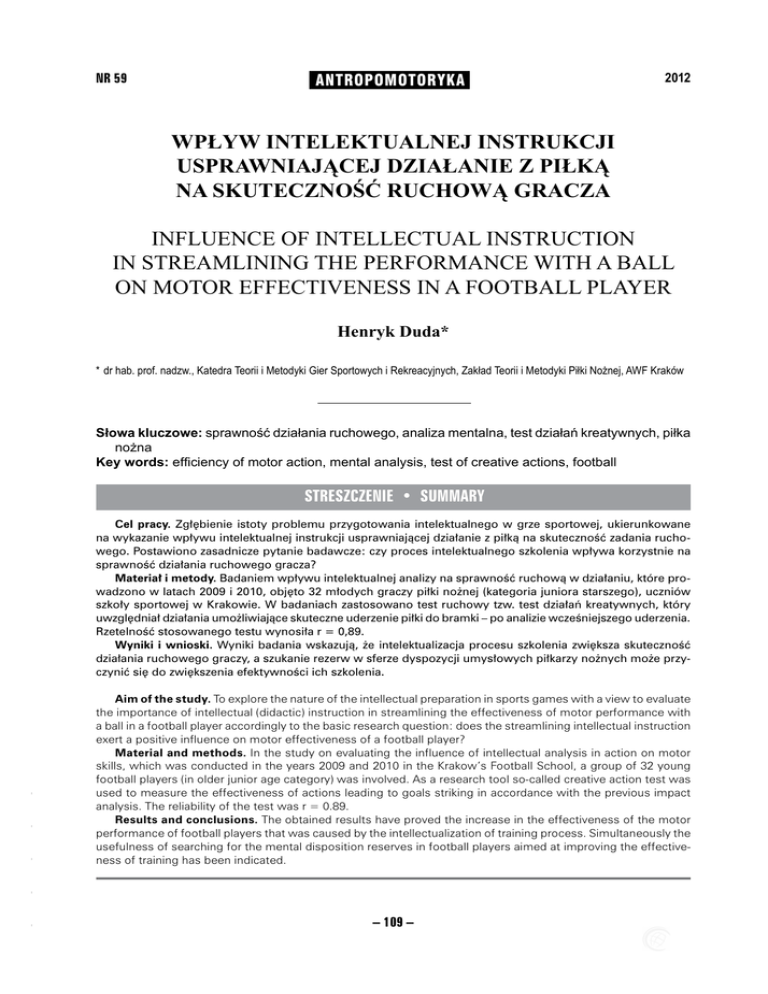 NR 59 ANT ROP OM OT OR YK A 2012 WPŁYW INTELEKTUALNEJ INSTRUKCJI USPRAWNIAJĄCEJ DZIAŁANIE Z PIŁKĄ NA SKUTECZNOŚĆ RUCHOWĄ GRACZA INFLUENCE OF INTELLECTUAL INSTRUCTION IN STREAMLINING THE PERFORMANCE WITH A BALL ON MOTOR EFFECTIVENESS IN A FOOTBALL PLAYER Henryk Duda* **dr hab. prof. nadzw., Katedra Teorii i Metodyki Gier Sportowych i Rekreacyjnych, Zakład Teorii i Metodyki Piłki Nożnej, AWF Kraków Słowa kluczowe: sprawność działania ruchowego, analiza mentalna, test działań kreatywnych, piłka nożna Key words: efficiency of motor action, mental analysis, test of creative actions, football STRESZCZENIE • SUMMARY Aim of the study. To explore the nature of the intellectual preparation in sports games with a view to evaluate the importance of intellectual (didactic) instruction in streamlining the effectiveness of motor performance with a ball in a football player accordingly to the basic research question: does the streamlining intellectual instruction exert a positive influence on motor effectiveness of a football player? Material and methods. In the study on evaluating the influence of intellectual analysis in action on motor skills, which was conducted in the years 2009 and 2010 in the Krakow’s Football School, a group of 32 young football players (in older junior age category) was involved. As a research tool so-called creative action test was used to measure the effectiveness of actions leading to goals striking in accordance with the previous impact analysis. The reliability of the test was r = 0.89. Results and conclusions. The obtained results have proved the increase in the effectiveness of the motor performance of football players that was caused by the intellectualization of training process. Simultaneously the usefulness of searching for the mental disposition reserves in football players aimed at improving the effectiveness of training has been indicated. - - - - - Cel pracy. Zgłębienie istoty problemu przygotowania intelektualnego w grze sportowej, ukierunkowane na wykazanie wpływu intelektualnej instrukcji usprawniającej działanie z piłką na skuteczność zadania ruchowego. Postawiono zasadnicze pytanie badawcze: czy proces intelektualnego szkolenia wpływa korzystnie na sprawność działania ruchowego gracza? Materiał i metody. Badaniem wpływu intelektualnej analizy na sprawność ruchową w działaniu, które prowadzono w latach 2009 i 2010, objęto 32 młodych graczy piłki nożnej (kategoria juniora starszego), uczniów szkoły sportowej w Krakowie. W badaniach zastosowano test ruchowy tzw. test działań kreatywnych, który uwzględniał działania umożliwiające skuteczne uderzenie piłki do bramki – po analizie wcześniejszego uderzenia. Rzetelność stosowanego testu wynosiła r = 0,89. Wyniki i wnioski. Wyniki badania wskazują, że intelektualizacja procesu szkolenia zwiększa skuteczność działania ruchowego graczy, a szukanie rezerw w sferze dyspozycji umysłowych piłkarzy nożnych może przyczynić się do zwiększenia efektywności ich szkolenia. – 109 – Henryk Duda Wstęp - - - Sprawne działania w grze sportowej są oparte nie tylko na uaktywnianiu sfery fizycznej i ruchowej gracza, ale przede wszystkim na mentalizacji jego działań, co podkreśla już sama definicja gry sportowej wskazująca, iż „gra sportowa to sytuacja przeciwstawnych interesów, w której uczestnicy świadomie lub podświadomie dokonują wyboru celów i sposobów ich realizacji w zależności od posiadanej dyspozycyjnej i sytuacyjnej możliwości działania. Głównym celem gry sportowej jest wykazanie czasowej przewagi nad przeciwnikiem zgodnie z przyjętymi regułami. Cel ten osiągany jest przez realizację celów pośrednich w ofensywie i defensywie” [1, s. 73]. Ze szczegółowej analizy gry wynika, iż ze względu na rodzaj sytuacji zarówno indywidualne, jak i grupowe działania wykonywane są zgodnie z celem gry, do którego realizacji gracz musi się zaangażować umysłowo, ruchowo i fizycznie. Stąd też działanie gracza zdeterminowane jest przez sytuacyjną i dyspozycyjną możność działania (ryc. 1). Pojęcie „dyspozycyjna możność dzia- łania” odnosi się do potencjału gracza rozumianego jako możliwości. „Sytuacyjna możność działania” dotyczy natomiast okoliczności, w jakich działa gracz. Działania w grze obfitują w liczne dynamiczne okoliczności, które Tomaszewski [3] określa za pomocą terminu „sytuacje”; są to sytuacje proste lub złożone, pewne lub ryzykowne (ryc. 2) i aby je rozwiązać, gracz musi stale dokonywać percepcji składowych gry i podejmować decyzje o wyborze sposobu działania. Złożony charakter sytuacyjnego działania gracza wymaga od niego nie tylko sprawnego wykonywania czynności ruchowych, ale także – a nawet przede wszystkim – myślenia, które ma charakter reproduktywny, czyli polega na zastosowaniu uprzednio zdobytej wiedzy. Skuteczność działania gracza zależy więc od działania wewnętrznego (zdolności umysłowych) i zewnętrznego (celowego wykonania czynności ruchowych) [4]. Jak stąd wynika, sytuacyjne warunki gry wymagają od gracza odpowiedniego poziomu rozwoju i optymalnej aktywizacji procesów orientacyjno-poznawczych. To one decydują bowiem o poprawności odbioru i spraw- - - Rycina 1. Elementy warunkujące działania gracza wg Naglaka [2] Figure 1. Elements conditioning the operations of a player according to Naglak [2] – 110 – Wpływ intelektualnej instrukcji usprawniającej działanie z piłką na skuteczność ruchową gracza Rycina 2. Charakterystyka dyspozycyjnej możliwości działania w grze wg Panfila [1] - - - - - Figure 2. The profile of accessible possibility of action in the game according to Panfil [1] ności przetwarzania wszelkich informacji związanych z projektowaniem i przewidywaniem rozwoju sytuacji w grze. Zdobyta w tym procesie wiedza o celach, warunkach i prawdopodobnych efektach działania, a także o własnych możliw