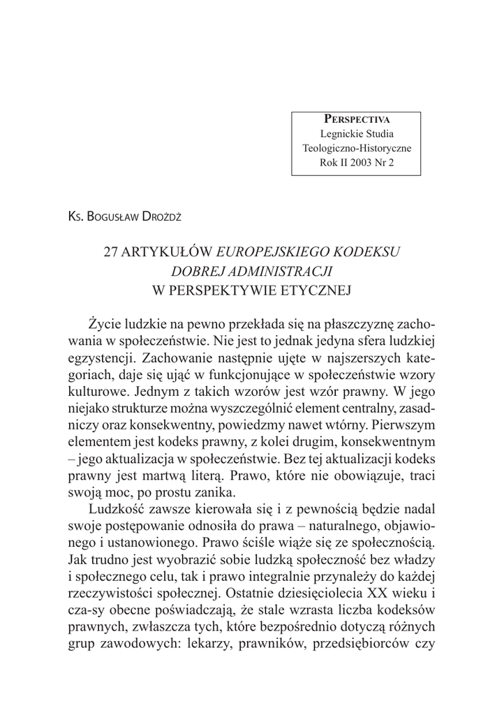 Ks. Bogusław Drożdż 142 Perspectiva Legnickie Studia Teologiczno-Historyczne Rok II 2003 Nr 2 Ks. Bogusław Drożdż 27 artykułów Europejskiego Kodeksu Dobrej Administracji w perspektywie etycznej Życie ludzkie na pewno przekłada się na płaszczyznę zachowania w społeczeństwie. Nie jest to jednak jedyna sfera ludzkiej egzystencji. Zachowanie następnie ujęte w najszerszych kategoriach, daje się ująć w funkcjonujące w społeczeństwie wzory kulturowe. Jednym z takich wzorów jest wzór prawny. W jego niejako strukturze można wyszczególnić element centralny, zasadniczy oraz konsekwentny, powiedzmy nawet wtórny. Pierwszym elementem jest kodeks prawny, z kolei drugim, konsekwentnym – jego aktualizacja w społeczeństwie. Bez tej aktualizacji kodeks prawny jest martwą literą. Prawo, które nie obowiązuje, traci swoją moc, po prostu zanika. Ludzkość zawsze kierowała się i z pewnością będzie nadal swoje postępowanie odnosiła do prawa – naturalnego, objawionego i ustanowionego. Prawo ściśle wiąże się ze społecznością. Jak trudno jest wyobrazić sobie ludzką społeczność bez władzy i społecznego celu, tak i prawo integralnie przynależy do każdej rzeczywistości społecznej. Ostatnie dziesięciolecia XX wieku i cza-sy obecne poświadczają, że stale wzrasta liczba kodeksów prawnych, zwłaszcza tych, które bezpośrednio dotyczą różnych grup zawodowych: lekarzy, prawników, przedsiębiorców czy 27 artykułów Europejskiego Kodeksu Dobrej Administracji 143 pracowników. Są to kodeksy najczęściej określane jako etyczne, chociaż niejednokrotnie zazębiają się z kodeksami prawnymi, co oznacza, że dosięgają ich skutki prawne. Poniżej przyjrzyjmy się pokrótce Europejskiemu Kodeksowi Dobrej Administracji jako interesującej propozycji, która na pewno zasługuje na zauważenie, jeśli nie nawet na uznanie. 1. Powstanie Europejskiego Kodeksu Dobrej Administracji. Europejski Kodeks Dobrej Administracji1 został uchwalony 6 września 2001 r. przez Parlament Europejski. Został on opracowany przez Ombudsmana Unii Europejskiej Jacoba Södermanna, byłego ombudsmana Finlandii. Jednakże jego inicjatorem był Roy Perry – deputowany do Parlamentu Europejskiego. We wrześniu 2001 r. Parlament Europejski zalecił stosowanie Kodeksu w organach i instytucjach Unii. Na pewno niebagatelnym kontekstem warunkującym powstanie tego Kodeksu jest zawarte w Karcie Praw Podstawowych Unii Europejskiej, prawo do dobrej administracji (art. 41). Karta ta została przyjęta 7 grudnia 2000 roku2. Wspomnijmy, że składa się ona z preambuły oraz 54 artykułów. Są one ujęte w siedem rozdziałów o następujących tytułach: 1) Godność; 2) Wolności; 1 Dalej skrót: EKDA. Pełna nazwa oryginału brzmi: Europejski Kodeks Dobrej Praktyki Administracyjnej. 2 Projekt Karty Praw Podstawowych UE został przygotowany przez specjalny powołany do tego Konwent. Składał się on z 15 przedstawicieli głów państw i szefów rządów państw członkowskich, przedstawiciela Przewodniczącego Komisji Europejskiej, 16 deputowanych do Parlamentu Europejskiego, 30 członków parlamentów krajowych (po dwóch z każdego państwa). Przewodniczącym Konwentu został prezydent Niemiec Roman Herzog. Dodajmy, że jako obserwatorzy w pracach brali udział dwaj sędziowie Europejskiego Trybunału Sprawiedliwości i dwaj przed- 144 Ks. Bogusław Drożdż 3) Równość; 4) Solidarność; 5) Prawa obywatelskie; 6) Wymiar sprawiedliwości; 7) Postanowienia ogólne. Rozdział piąty (art. 3946) mówi o prawie do głosowania i kandydowania w wyborach do Parlamentu Europejskiego, prawie do głosowania i kandydowania w wyborach samorządowych, prawie do dobrej administracji, prawie dostępu do dokumentów unijnych, prawie składania skarg do Rzecznika Praw Obywatelskich, prawie składania petycji do Parlamentu, prawie przemieszczania się i osiedlania oraz prawie do ochrony dyplomatycznej i konsularnej3. Interesujący nas artykuł 41 w Karcie Praw Podstawowych, brzmi następująco: „1. Każda osoba ma prawo do bezstronnego i rzetelnego załatwienia swojej sprawy w rozsądnym czasie przez instytucje i organy Unii. 2. Prawo to obejmuje: – prawo każdej osoby do bycia wysłuchanym, zanim zostaną podjęte jakiekolwiek indywidualne działania, które mogą na nią negatywnie wpłynąć; – prawo każdej osoby do dostępu do dotyczących jej dokumen tów, przy równoczesnym poszanowaniu legalnych zasad po ufności oraz tajemnicy zawodowej i handlowej; – obowiązek uzasadniania przez administrację jej decyzji. 3. Każda osoba ma prawo do otrzymania od Wspólnoty odszkodowania z tytułu strat spowodowanych przez instytucje bądź jej urzędników przy wykonywaniu ich obowiązków służbowych, stawiciele Rady Europy. 7 grudnia przedłożony projekt został podpisany przez Przewodniczącego Parlamentu Europejskiego (Nicole Fontaine), Przewodniczącego Komisji Europejskiej (Romano Prodi) oraz przewodniczącego obradom Rady Ministrów (Hubert Védrine) i następnie proklamowany w obecności głów państw i szefów rządów państw członkowskich jako Karta Praw Podstawowych Unii Europejskiej. A. Wyrozumska. Jednostka w Unii Europejskiej. W: Prawo Unii Europejskiej. Zagadnienia systemowe. Red. J. Barcz. Warszawa 2002 s. 344. 27 artykułów Europejskiego Kodeksu Dobrej Administracji 145 zgodnie z ogólnymi zasadami wspólnymi dla systemów prawnych państw członkowskich. 4. Każda osoba może napisać do instytucji Unii w jednym z języków, w których sporządzono traktaty, i musi w tym samym języku otrzymać odpowiedź”4. Europejski Kodeks Dobrej Administracji znany jest również w Polsce. Szczególne zasługi w jego rozpowszechnianiu w warunkach polskich należy przypisać instytucji Rzecznika Praw Obywatelskich. Osobowo łączyć je trzeba z prof. Andrzejem Zollem – Rzecznikiem Praw Obywatelskich oraz doktorem hab. Jerzym Świątkiewiczem – Zastępcą Rzecznika Prawa Obywatels