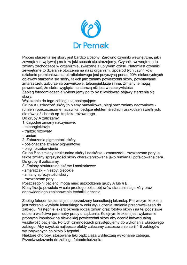 Proces starzenia się skóry jest bardzo złożony. Zarówno czynniki wewnętrzne, jak i zewnętrzne wpływają na to w jaki sposób się starzejemy. Czynniki wewnętrzne to zmiany zachodzące w organizmie, związane z upływem czasu. Natomiast czynniki zewnętrzne to działanie otoczenia na nasz organizm. Spośród tych czynników działanie promieniowania ultrafioletowego jest przyczyną ponad 90% niekorzystnych objawów starzenia się skóry, takich jak: zmiany powierzchni skóry, powstawanie zmarszczek, zaburzenia barwnikowe, teleangiektazje i inne. Zmiany te mogą powodować, że skóra wygląda na starszą niż jest w rzeczywistości. Zabieg fotoodmładzania wykonujemy po to by zlikwidować objawy starzenia się skóry. Wskazania do tego zabiegu są następujące: Grupa A uszkodzeń skóry to plamy barwnikowe, piegi oraz zmiany naczyniowe rumień i porozszerzane naczynka, będące efektem średnich uszkodzeń świetlnych, ale również chorób np. trądzika różowatego. Do grupy A zaliczamy: 1. Łagodne zmiany naczyniowe: - teleangiektazje - trądzik różowaty - rumień 2. Zaburzenia pigmentacji skóry: - posłoneczne zmiany pigmentowe - piegi, przebarwienia Grupa B to zmiany strukturalne skóry i naskórka - zmarszczki, rozszerzone pory, a także zmiany sprężystości skóry charakteryzowane jako rumiana i pofałdowana cera. Do grupy B zaliczamy: 3. Zmiany strukturalne skórne i naskórkowe: - zmarszczki - niezbyt głębokie - zmiany sprężystości skóry - rozszerzone pory. Poszczególni pacjenci mogą mieć uszkodzenia grupy A lub /i B. Klasyfikacja powstała w celu prostego opisu objawów starzenia się skóry oraz odpowiedniego zaplanowania techniki leczenia. Zabieg fotoodmładzania jest poprzedzony konsultacją lekarską. Pierwszym krokiem jest zebranie wywiadu lekarskiego w celu wykluczenia istnienia przeciwwskazań do zabiegu. Następnie lekarz określa rodzaj zmian oraz fototyp skóry i na tej podstawie dobiera właściwe parametry pracy urządzenia. Kolejnym krokiem jest wykonanie próbnych impulsów na niewielkiej powierzchni skóry aby ocenić indywidualną wrażliwość pacjenta. Po tych czynnościach przystępujemy do wykonania właściwego zabiegu. Aby uzyskać najlepsze efekty zalecamy zastosowanie serii 1-5 zabiegów wykonywanych co około 6 tygodni. Niektóre choroby, stosowane leki bądź ciąża wykluczają wykonanie zabiegu. Przeciwwskazania do zabiegu fotoodmładzania: 1. Ciąża. 2. Opalona skóra lub planowane opalanie. 3. Bardzo ciemna karnacja. 4. Stosowanie niektórych leków (retinol, antybiotyki) i ziół (dziurawiec, nagietek). 5. Zaburzenia krzepnięcia lub stosowanie leków przeciwkrzepliwych. 6. Bielactwo, łuszczyca. 7. Cukrzyca. 8. Aktywna opryszczka. 9. Infekcje skóry. 10. Alkohol spożyty w ciągu 24 godzin przed zabiegiem. Zabieg fotoodmładzania nie wymaga wcześniejszych przygotowań, warto jednak pamiętać o kilku elementach przed zabiegiem które pozwolą na jego bezpieczne i szybkie wykonanie. Przed zabiegiem fotoodmładzania: 1. Skóra nie może być opalona - solarium, samoopalacze należy odstawić na 4 tygodnie przed zabiegiem. 2. Skóra powinna być przed zabiegiem dokładnie oczyszczona, nie powinno się używać żadnych kremów i kosmetyków w dzień zabiegu. Powierzchnia poddana zabiegowi zostaje naświetlana krótkimi impulsami światła, które powoduje delikatne, chwilowe pieczenie. Bezpośrednio po zabiegu skóra może być lekko zaczerwieniona, zaczerwienienie to ustępuje w ciągu około 3 dni, lekko obrzęknięta, co ustępuje w ciągu doby. Piegi i przebarwienia mogą ściemnieć, objaw ten ustępuje w ciągu tygodnia. Po zabiegu fotoodmładzania: 1. Nie opalać się. Bezwzględnie chronić skórę przed słońcem minimum przez 4 tygodnie po zabiegu. 2. Stosować kremy z filtrami przeciwsłonecznymi o faktorze 50 lub więcej. 3. Około dwóch tygodni po zabiegu nie stosować peelingów i innych preparatów złuszczających. 4. Nie stosować środków higieny (np. dezedoranty, perfumy) opartych o alkohol lub inne drażniące skórę substancje na obszarach poddanych zabiegowi. 5. Przez kilka dni 2-3 razy dziennie stosować krem Alantan, Solcoseryl lub Bepanten. 6. Nie używać mydła, zastąpić go preparatem myjącym bez mydła i bez alkoholu. 7. Delikatnie wycierać się po kąpieli w miejscach poddanych zabiegowi. 8. Nie zażywać leków i ziół fotouczulających przez kilka dni. 9. Ewentualne zaczerwienienia skóry można przykryć makijażem. Na kontrolę po zabiegu i ocenę jego efektów zapraszamy po trzech-sześciu tygodniach. Może się zdarzyć, że u niektórych pacjentów (zwłaszcza z dużymi zmianami naczyniowymi) będzie konieczne wykonanie następnych zabiegów. Efekty fotoodmładzania utrzymują się przez lata, jednak proces starzenia skóry jest procesem ciągłym więc zabiegi wymagają okresowego powtarzania w celu podtrzymania uzyskanych efektów. W razie wystąpienia jakichkolwiek niepokojących objawów proszę skontaktować się niezwłocznie z lekarzem wykonującym zabieg.