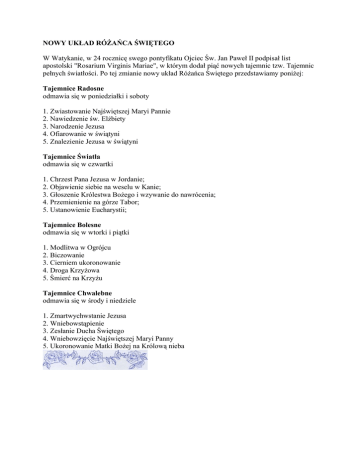 NOWY UKŁAD RÓŻAŃCA ŚWIĘTEGO W Watykanie, w 24 rocznicę swego pontyfikatu Ojciec Św. Jan Paweł II podpisał list apostolski "Rosarium Virginis Mariae", w którym dodał piąć nowych tajemnic tzw. Tajemnic pełnych światłości. Po tej zmianie nowy układ Różańca Świętego przedstawiamy poniżej: Tajemnice Radosne odmawia się w poniedziałki i soboty 1. Zwiastowanie Najświętszej Maryi Pannie 2. Nawiedzenie św. Elżbiety 3. Narodzenie Jezusa 4. Ofiarowanie w świątyni 5. Znalezienie Jezusa w świątyni Tajemnice Światła odmawia się w czwartki 1. Chrzest Pana Jezusa w Jordanie; 2. Objawienie siebie na weselu w Kanie; 3. Głoszenie Królestwa Bożego i wzywanie do nawrócenia; 4. Przemienienie na górze Tabor; 5. Ustanowienie Eucharystii; Tajemnice Bolesne odmawia się w wtorki i piątki 1. Modlitwa w Ogrójcu 2. Biczowanie 3. Cierniem ukoronowanie 4. Droga Krzyżowa 5. Śmierć na Krzyżu Tajemnice Chwalebne odmawia się w środy i niedziele 1. Zmartwychwstanie Jezusa 2. Wniebowstąpienie 3. Zesłanie Ducha Świętego 4. Wniebowzięcie Najświętszej Maryi Panny 5. Ukoronowanie Matki Bożej na Królową nieba LIST APOSTOLSKI OJCA ŚWIĘTEGO - ROSARIUM VIRGINIS MARIAE (fragmenty dotyczące wprowadzenia czwartej części- Tajemnic światła) 1. Różaniec Najświętszej Maryi Panny (Rosarium Virginis Mariae), który pod tchnieniem Ducha Bożego rozwinął się stopniowo w drugim tysiącleciu, to modlitwa umiłowana przez licznych świętych, a Urząd Nauczycielski Kościoła często do niej zachęca. W swej prostocie i głębi pozostaje ona również w obecnym trzecim tysiącleciu, które dopiero co się zaczęło, modlitwą o wielkim znaczeniu, przynoszącą owoce świętości. Jest ona dobrze osadzona w duchowości chrześcijaństwa, które - po dwóch tysiącach lat - nic nie straciło ze swej pierwotnej świeżości i czuje, że Duch Boży pobudza je do " wypłynięcia na głębię " (Duc in altum), by opowiadać światu, a nawet „wołać” o Chrystusie jako Panu i Zbawicielu, jako " drodze, prawdzie i życiu " (J 14,6), jako" celu historii ludzkiej, punkcie, ku któremu zwracają się pragnienia historii i cywilizacji ". Różaniec bowiem, choć ma charakter maryjny, jest modlitwą o sercu chrystologicznym. (...) 3. Dlatego, po rozważaniach podjętych w Liście apostolskim "Novo millennio ineunte", w którym wezwałem Lud Boży, by po doświadczeniach jubileuszowych " na nowo rozpoczynać od Chrystusa ", odczuwam potrzebę rozwinięcia refleksji o różańcu, dając tamtemu Listowi apostolskiemu niejako maryjne ukoronowanie, by zachęcić do kontemplowania oblicza Chrystusa w towarzystwie i w szkole Jego Najświętszej Matki. Odmawiać różaniec bowiem to nic innego, jak kontemplować z Maryją oblicze Chrystusa. By bardziej uwydatnić tę zachętę, korzystając z okazji zbliżającej się sto dwudziestej rocznicy ogłoszenia wspomnianej Encykliki Leona XIII, pragnę, by tę modlitwę przez cały rok w szczególny sposób proponowano i ukazywano jej wartość w różnych wspólnotach chrześcijańskich. Ogłaszam zatem okres od tegorocznego października do października roku 2003 Rokiem Różańca. Powierzam to wskazanie duszpasterskie inicjatywie poszczególnych wspólnot kościelnych. Uważam jednak, że aby rozwinąć chrystologiczny wymiar różańca, stosowne byłoby uzupełnienie, które - pozostawione swobodnemu wyborowi jednostek i wspólnot pozwoliłoby objąć także tajemnice życia publicznego Chrystusa między chrztem w Jordanie a męką. W tych właśnie tajemnicach kontemplujemy ważne aspekty Osoby Chrystusa jako Tego, kto definitywnie objawił Boga. On jest Tym, który - ogłoszony przy chrzcie umiłowanym Synem Ojca - zwiastuje nadejście Królestwa, świadczy o nim swymi czynami, obwieszcza jego wymogi. To w latach życia publicznego misterium Chrystusa objawia się ze specjalnego tytułu jako tajemnica światła: "Jak długo jestem na świecie, jestem światłością świata "(J 9,5). Aby różaniec w pełniejszy sposób można było nazwać „streszczeniem Ewangelii”, jest zatem stosowne, żeby po przypomnieniu Wcielenia i ukrytego życia Chrystusa (tajemnice radosne), a przed zatrzymaniem się nad cierpieniami męki ( tajemnice bolesne) i nad triumfem zmartwychwstania (tajemnice chwalebne) rozważać również pewne momenty życia publicznego o szczególnej wadze (tajemnice światła). To uzupełnienie o nowe tajemnice, w niczym nie szkodząc żadnemu z istotnych aspektów tradycyjnego układu tej modlitwy, ma sprawić, że będzie ona przeżywana w duchowości chrześcijańskiej z nowym zainteresowaniem jako rzeczywiste wprowadzenie w głębię Serca Jezusa Chrystusa, oceanu radości i światła, boleści i chwały. (...) Tajemnice światła 21. Przechodząc od dzieciństwa i życia w Nazarecie do życia publicznego Jezusa kontemplacja prowadzi nas do tych tajemnic, które ze specjalnego tytułu nazwać można „tajemnicami światła”. W rzeczywistości całe misterium Chrystusa jest światłem. On jest " światłością świata " (J 8, 12). Jednak ten wymiar wyłania się szczególnie w latach życia publicznego, kiedy głosi On Ewangelię Królestwa. Pragnąc wskazać wspólnocie chrześcijańskiej pięć znamiennych momentów - tajemnic „pełnych światłości” - tej fazy życia Chrystusa, uważam, że słusznie można by za nie uznać: 1. Jego chrzest w Jordanie; 2. objawienie siebie na weselu w Kanie; 3. głoszenie Królestwa Bożego i wzywanie do nawrócenia; 4. przemienienie na górze Tabor; 5. ustanowienie Eucharystii, będącej sakramentalnym wyrazem misterium paschalnego. Każda z tych tajemnic jest objawieniem Królestwa, które już nadeszło w samej Osobie Jezusa. Tajemnicą światła jest przede wszystkim chrzest w Jordanie. Tutaj, gdy Jezus schodzi do wody -jako niewinny, który czyni siebie „grzechem” za nas (por. 2 Kor 5,21)- otwierają się niebiosa i głos Ojca ogłasza Go Synem umiłowanym (por. Mt 3, 1