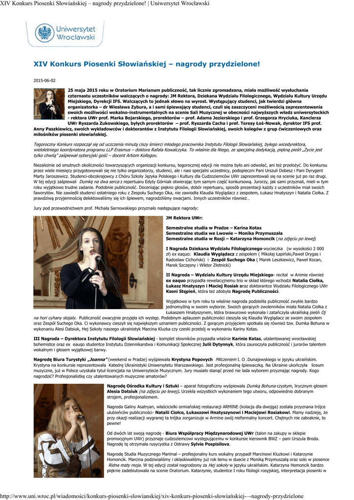 XIV Konkurs Piosenki Słowiańskiej – nagrody przydzielone! | Uniwersytet Wrocławski XIV Konkurs Piosenki Słowiańskiej – nagrody przydzielone! 2015-06-02 25 maja 2015 roku w Oratorium Marianum publiczność, tak licznie zgromadzona, miała możliwość wysłuchania czternastu uczestników walczących o nagrody: JM Rektora, Dziekana Wydziału Filologicznego, Wydziału Kultury Urzędu Miejskiego, Dyrekcji IFS. Walczących to jednak słowo na wyrost. Występujący studenci, jak twierdzi główna organizatorka – dr Wiesława Zybura, a i sami śpiewający studenci, czuli się zaszczyceni możliwością zaprezentowania swoich możliwości wokalno-instrumentalnych na scenie Sali Muzycznej w obecności najwyższych władz uniwersyteckich - rektora UWr prof. Marka Bojarskiego, prorektorów – prof. Adama Jezierskiego i prof. Grzegorza Hryciuka, Kanclerza UWr Ryszarda Zukowskiego, byłych prorektorów – prof. Ryszarda Cacha i prof. Teresy Łoś-Nowak, dyrektor IFS prof. Anny Paszkiewicz, swoich wykładowców i doktorantów z Instytutu Filologii Słowiańskiej, swoich kolegów z grup ćwiczeniowych oraz miłośników piosenki słowiańskiej. Tegoroczny Konkurs rozpoczął się od uczczenia minutą ciszy śmierci młodego pracownika Instytutu Filologii Słowiańskiej, byłego wicedyrektora, wieloletniego koordynatora programu LLP Erasmus – doktora Rafała Kowalczyka. To właśnie dla Niego, ze specjalną dedykacją, piękną pieśń „Życie jest tylko chwilą” zaśpiewał syberyjski gość – docent Artiom Kollegov. Niezależnie od smutnych okoliczności towarzyszących organizacji konkursu, tegorocznej edycji nie można było ani odwołać, ani też przełożyć. Do konkursu przez wiele miesięcy przygotowywali się nie tylko organizatorzy, studenci, ale i nasi specjalni uczestnicy, podopieczni Pani Urszuli Dobesz i Pani Dyrygent Marty Jaroszewicz. Studenci-obcokrajowcy z Chóru Szkoły Języka Polskiego i Kultury dla Cudzoziemców UWr zaprezentowali się na scenie już po raz drugi. W tej edycji zaśpiewali Dumkę na dwa serca z repertuaru Edyty Górniak otwierając tym samym część konkursową. Jurorzy, jak sami przyznali, mieli w tym roku wyjątkowo trudne zadanie. Podobnie publiczność. Doceniając piękno głosów, dobór repertuaru, sposób prezentacji każdy z uczestników miał swoich faworytów. Nie zawiedli studenci ostatniego roku z Zespołu Suchego Oka, nie zawiodła Klaudia Wyglądacz z zespołem, Łukasz Hnatyszyn i Natalia Ciołka. Z prawdziwą przyjemnością delektowaliśmy się ich śpiewem, nagrodziliśmy owacjami. Innych uczestników również… Jury pod przewodnictwem prof. Michała Sarnowskiego przyznało następujące nagrody: JM Rektora UWr: Semestralne studia w Pradze – Karina Kotas Semestralne studia we Lwowie – Monika Przymuszała Semestralne studia w Rosji – Katarzyna Homoncik (na zdjęciu po lewej) I Nagroda Dziekana Wydziału Filologicznego-wycieczka (w wysokości 2 000 zł) ex eaquo: Klaudia Wyglądacz z zespołem ( Mikołaj Łapiński,Paweł Drygas i Radosław Cichoński) i Zespół Suchego Oka ( Marek Leszkiewicz, Paweł Kocan, Marek Szczęsny i Wiktor Złotnicki) II Nagroda – Wydziału Kultury Urzędu Miejskiego- recital w Animie również ex eaquo przypadła rewelacyjnemu trio w skład którego wchodzi Natalia Ciołka, Łukasz Hnatyszyn i Maciej Rosiak oraz doktorantce Wydziału Filologicznego UWr Kseni Stępień, która też zdobyła Nagrodę Publiczności. Wyjątkowo w tym roku ta właśnie nagroda podzieliła publiczność zwykle bardzo jednomyślną w swoim wyborze. Swoich gorących zwolenników miała Natalia Ciołka z Łukaszem Hnatyszynem, która brawurowo wykonała i zatańczyła ukraińską pieśń Oj na hori cyhany stojaly. Publiczność owacyjnie przyjęła ich występ. Podobnym aplauzem publiczności cieszyła się Klaudia Wyglądacz ze swoim zespołem oraz Zespół Suchego Oka. Ci wykonawcy cieszyli się największym uznaniem publiczności. Z gorącym przyjęciem spotkała się również tzw. Dumka Bohuna w wykonaniu Alesi Datsiuk, Hej Sokoły naszego ukrainistyk Marcina Kluzka czy czeski przebój w wykonaniu Kariny Kotas. III Nagroda – Dyrektora Instytutu Filologii Słowiańskiej - komplet słowników przypadła właśnie Karinie Kotas, utalentowanej wrocławskiej bohemistce oraz ex eauqo studentce Instytutu Dziennikarstwa i Komunikacji Społecznej Julii Dytynnyk, która zauroczyła publiczność i jurorów talentem wokalnym i głosem wyjątkowej barwy. Nagrodę Biura Turystyki „Joanna” (weekend w Pradze) wyśpiewała Krystyna Popovych Milczeniem І. О .Dunajewskiego w języku ukraińskim. Krystyna na konkursie reprezentowała Katedrę Ukrainistyki Uniwersytetu Warszawskiego. Jest profesjonalną śpiewaczką. Na Ukrainie ukończyła liceum muzyczne, już w Polsce uzyskała tytuł licencjata na Uniwersytecie Muzycznym. Jury musiało stanąć przed nie lada wyborem przyznając nagrody. Kogo nagrodzić? Profesjonalistkę czy utalentowanych muzycznie amatorów? Nagrodę Ośrodka Kultury i Sztuki – aparat fotograficzny wyśpiewała Dumką Bohuna czystym, lirycznym głosem Alesia Datsiuk (na zdjęciu po lewej). Urzekła wszystkich wykonaniem tego utworu, odpowiednio dobranym strojem, profesjonalizmem. Nagroda Galiny Asatryan, właścicielki ormiańskiej restauracji ARMINE (kolacja dla dwojga) została przyznana trójce ulubieńców publiczności- Natalii Ciołce, Łukaszowi Hnatyszynowi i Maciejowi Rosiakowi. Mamy nadzieję, że przy okazji realizacji wygranej ta trójka zorganizuje w Armine swój nieformalny koncert. Chętnych nie zabraknie, to pewne! Od dwóch lat swoją nagrodę - Biura Współpracy Międzynarodowej UWr (talon na zakupy w sklepie promocyjnym UWr) przyznaje cudzoziemcowi występującemu w konkursie kierownik BWZ – pani Urszula Broda. Nagrodę tę otrzymała rusycystka z Ostrawy Sylvie Pospisilova. Nagrodę Studia Muzycznego Marimal – profesjonalny kurs wokalny przypadł Marcinowi Kluzkowi i Kat