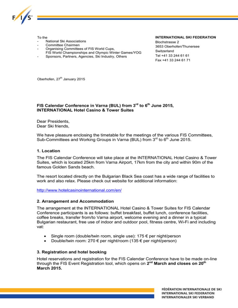 To the National Ski Associations Committee Chairmen Organising Committees of FIS World Cups, FIS World Championships and Olympic Winter Games/YOG Sponsors, Partners, Agencies, Ski Industry, Others INTERNATIONAL SKI FEDERATION Blochstrasse 2 3653 Oberhofen/Thunersee Switzerland Tel +41 33 244 61 61 Fax +41 33 244 61 71 th Oberhofen, 27 January 2015 FIS Calendar Conference in Varna (BUL) from 3rd to 6th June 2015, INTERNATIONAL Hotel Casino & Tower Suites Dear Presidents, Dear Ski friends, We have pleasure enclosing the timetable for the meetings of the various FIS Committees, Sub-Committees and Working Groups in Varna (BUL) from 3rd to 6th June 2015. 1. Location The FIS Calendar Conference will take place at the INTERNATIONAL Hotel Casino & Tower Suites, which is located 25km from Varna Airport, 17km from the city and within 90m of the famous Golden Sands beach. The resort located directly on the Bulgarian Black Sea coast has a wide range of facilities to work and also relax. Please check out website for additional information: http://www.hotelcasinointernational.com/en/ 2. Arrangement and Accommodation The arrangement at the INTERNATIONAL Hotel Casino & Tower Suites for FIS Calendar Conference participants is as follows: buffet breakfast, buffet lunch, conference facilities, coffee breaks, transfer from/to Varna airport, welcome evening and a dinner in a typical Bulgarian restaurant, free use of indoor and outdoor pool, fitness centre, Wi-Fi and including vat: Single room (double/twin room, single use): 175 € per night/person Double/twin room: 270 € per night/room (135 € per night/person) 3. Registration and hotel booking Hotel reservations and registration for the FIS Calendar Conference have to be made on-line through the FIS Event Registration tool, which opens on 2nd March and closes on 20th March 2015. Please note that travel information will be mandatory in order to arrange airport transportation. Instructions for the FIS Event Registration Tool are enclosed. 4. Travel arrangements and visa information FIS Travel Service is able to arrange flights from a wide variety of destinations at competitive prices. Please contact Caroline Ris directly to discuss your requirements (phone: +41 33 244 14 14 or [email protected]). The timetable is enclosed with this email and is also available for download on the FIS Website under the following link: http://www.fis-ski.com/inside-fis/events-and-services/fis-meetings/ Bulgaria is not part of the Schengen area (only for customs). It is necessary for you to check the entry formalities required for visitors from your country to Bulgaria (visas, validity of passport, other special provisions, etc.). Please check your requirements under the following link. http://www.mfa.bg/en/pages/109/index.html 5. Social activities Wednesday, 3rd June 2015 Friday, 5th June 2015 Welcome Cocktail & Dinner Dinner at a typical Bulgarian restaurant If you have any further questions, please do not hesitate to contact the FIS Office. We are looking forward to welcoming you at the Golden Sands beach in Varna (BUL). Kind regards, INTERNATIONALER SKI VERBAND Sarah Lewis Generalsekretärin (per e-mail verschickt, ohne Unterschrift) 2