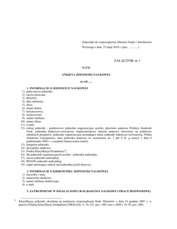 Załączniki do rozporządzenia Ministra Nauki i Szkolnictwa Wyższego z dnia 25 maja 2010 r. (poz. ……….) ZAŁĄCZNIK nr 1 WZÓR ANKIETA JEDNOSTKI NAUKOWEJ za rok ..... 1) 2) 3) 4) 5) 6) 7) 8) 9) 10) 11) 12) 13) 14) 15) 16) 17) 18) 19) 1) 2) 3) 4) 1. INFORMACJE O JEDNOSTCE NAUKOWEJ pełna nazwa jednostki; nazwa skrócona; REGON; data założenia; ulica; numer domu; kod pocztowy; miejscowość; numer telefonu; numer faksu; e-mail; rodzaj jednostki - podstawowa jednostka organizacyjna uczelni, placówka naukowa Polskiej Akademii Nauk, jednostka badawczo-rozwojowa, międzynarodowy instytut naukowy utworzony na podstawie odrębnych przepisów, jednostka organizacyjna posiadająca status jednostki badawczo-rozwojowej, Polska Akademia Umiejętności, inna jednostka naukowa (w rozumieniu art. 2 pkt 9 lit. g ustawy z dnia 8 października 2004 r. o zasadach finansowania nauki); kategoria jednostki; dyscypliny naukowe; Polska Klasyfikacja Działalności1); dla jednostek organizacyjnych uczelni - jednostka nadrzędna; nazwa jednostki nadrzędnej; REGON jednostki nadrzędnej; organ sprawujący nadzór nad jednostką (jeżeli dotyczy). 2. INFORMACJE O KIEROWNIKU JEDNOSTKI NAUKOWEJ nazwisko i imię; stanowisko służbowe; numer telefonu służbowego; e-mail. 3. ZATRUDNIENIE W DZIAŁALNOŚCI B+R (BADANIA NAUKOWE I PRACE ROZWOJOWE) 1) Klasyfikacja jednostki określona na podstawie rozporządzenia Rady Ministrów z dnia 24 grudnia 2007 r. w sprawie Polskiej Klasyfikacji Działalności (PKD) (Dz. U. Nr 251, poz. 1885 oraz z 2009 r. Nr 59, poz. 489). Liczba osób, dla których jednostka jest podstawowym miejscem pracy, zatrudnionych na podstawie stosunku pracy (w tym liczba kobiet), bez przeliczenia na pełny wymiar czasu pracy2), oraz zatrudnionych w przeliczeniu na pełny wymiar czasu pracy i w przeliczeniu na ekwiwalenty pełnego wymiaru czasu pracy EPC 3), w tym zatrudnionych na stanowiskach: 1) profesora, profesora zwyczajnego, profesora nadzwyczajnego, profesora wizytującego; 2) docenta; 3) adiunkta; 4) asystenta; 5) głównego specjalisty badawczo-technicznego; 6) starszego specjalisty badawczo-technicznego; 7) specjalisty badawczo-technicznego; 8) innych stanowiskach. 4. OGÓLNA LICZBA OSÓB, DLA KTÓRYCH JEDNOSTKA JEST PODSTAWOWYM MIEJSCEM PRACY 1) 2) 3) 4) 1) 2) 3) 4) 5) 2) 3) 4) 5) 5. WARUNKI LOKALOWE powierzchnia terenu własnego 4) [ha]; powierzchnia użytkowanego terenu stanowiącego własność innych podmiotów [ha]; powierzchnia terenu przekazanego do użytkowania innym podmiotom w celu uzyskania przychodów [ha]; powierzchnia pomieszczeń: a) będących własnością jednostki [m2], b) wynajmowanych od innych podmiotów [m2], c) wynajmowanych innym podmiotom w celu uzyskania przychodów [m2]. 6. DANE O BAZIE BIBLIOTECZNEJ5) liczba jednostek bibliotecznych z wyłączeniem dokumentów elektronicznych / cyfrowych zdalnego dostępu i czasopism elektronicznych; liczba tytułów czasopism drukowanych w prenumeracie na bieżący rok akademicki; liczba książek będących dokumentami elektronicznymi zdalnego dostępu, pozyskanych na własność przez biblioteki i udostępnianych zgodnie z zapisami w księgach inwentarzowych i katalogu; liczba unikatowych tytułów wydawnictw ciągłych udostępnianych w postaci elektronicznej według tytułów lub zagregowanych w obrębie baz pełnotekstowych; liczba baz danych bibliograficznych, abstraktowych, faktograficznych lub pełnotekstowych; Należy podać liczbę osób, dla których jednostka jest podstawowym miejscem pracy, zatrudnionych na podstawie stosunku pracy, bez przeliczenia na pełny wymiar czasu pracy. Podstawowe miejsce pracy ustala się na podstawie składanego pracodawcy pisemnego oświadczenia pracownika. Liczbę osób zatrudnionych w pracach B+R należy podać w przeliczeniu na pełny wymiar czasu pracy oraz w przeliczeniu na ekwiwalenty pełnego wymiaru czasu pracy EPC. EPC (ekwiwalent pełnego wymiaru czasu pracy) - są to jednostki przeliczeniowe służące do ustalenia faktycznego zatrudnienia przy realizacji prac B+R. Konieczność wprowadzenia tego miernika wynika z faktu, że wiele osób związanych z działalnością B+R część swojego czasu pracy przeznacza na zajęcia inne niż związane z realizacją prac B+R, np. na zajęcia dydaktyczne, prace administracyjne itp., a część osób pracuje w wymiarze mniejszym niż pełny wymiar czasu pracy lub pracuje w danej jednostce niepełny rok. Jeden ekwiwalent osoby zatrudnionej w pełnym wymiarze czasu pracy oznacza jeden osoborok poświęcony wyłącznie na działalność B+R. Zatrudnienie w działalności B+R w ekwiwalentach pełnego wymiaru czasu pracy należy ustalić na podstawie proporcji czasu przepracowanego przez poszczególnych pracowników w ciągu roku sprawozdawczego przy realizacji prac B+R do pełnego wymiaru czasu pracy obowiązującego na danym stanowisku. Podstawowe jednostki organizacyjne uczelni podają użytkowaną powierzchnię terenu oraz użytkowaną powierzchnię pomieszczeń. Podstawowe jednostki organizacyjne uczelni podają dane o materiałach bibliotecznych będących do dyspozycji jednostki w obrębie uczelnianego systemu biblioteczno-informacyjnego. 6) czy jednostka zasila repozytorium / bibliotekę cyfrową prowadzoną w obrębie uczelni (pow. 100 poz. wkładu) – TAK - NIE. 7. UPRAWNIENIA DO NADAWANIA STOPNI 1) liczba uprawnień do nadawania stopni naukowych doktora lub stopni doktora sztuki; 2) liczba uprawnień do nadawania stopni naukowych doktora habilitowanego lub stopni doktora habilitowanego sztuki; 3) opis zakresów nadawanych stopni naukowych doktora lub stopni doktora sztuki; 4) opis zakresów nadawanych stopni naukowych doktora habilitowanego lub stopni doktora habilitowanego sztuki; 5) liczba stopni naukowych doktora lub stopni doktora sztuki uzyskanych w ostatnim roku przez pracowników jednostki (w tym przez kobiety); 6) liczba stopni naukowych doktora habilitowanego lub stopni doktora habilitowanego sztuki uzyskanych w ostatni