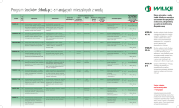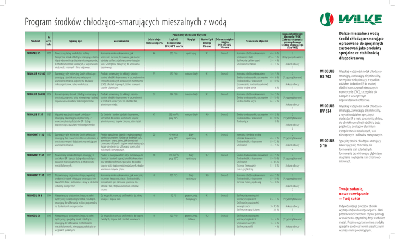 Program środków chłodząco-smarujących mieszalnych z wodą Produkt Nr artykułu WICOPAL HS 1101 WICOLUB HS 500 1113 WICOLUB 360 BS 1134 WICOLUB 1137 1137 WICOSYNT 1130 1130 WICOSYNT 1165 1165 WICOSYNT 1150 1150 WICOSOL SK 8 WICOSOL S1 1144 1143 Typowy opis Zastosowanie Parametry chemiczno-fizyczne Udział oleju Lepkość Wygląd Wartość pH Ochrona antykorozyjna mineralnego % koncentratu Emulsja DIN 51360/2 2 20°C/40°C mm /s 5%-owa 3%-owa Nowoczesny, łatwy w obsłudze, stabilny biologicznie środek chłodząco-smarujący, o daleko idącej odporności na działanie mikroorganizmów, z inhibitorami metali kolorowych, z ulepszaczami właściwości smarnych i filmu olejowego. Normalna obróbka skrawaniem, jak: wiercenie, toczenie, frezowanie, jak również obróbka szlifierska żeliwa szarego i stopów stali. Szczególnie nadaje się do szlifowania bezkłowego. 44 Zawierający olej mineralny środek chłodzącosmarujący z dodatkami poprawiającymi właściwości smarne, odporny na działanie mikroorganizmów, łatwy w obsłudze. Produkt uniwersalny do lekkiej i średniotrudnej obróbki skrawaniem, w szczególności w centrach obróbczych sterowanych numerycznie (CNC), do stali stopowych, żeliwa szarego i stopów aluminium. 55 Konwencjonalny środek chłodząco-smarujący o wysokiej zawartości oleju mineralnego i dobrej odporności na działanie mikroorganizmów. Produkt uniwersalny do lekkiej i średniotrudnej obróbki skrawaniem, w szczególności w centrach obróbczych. Do obróbki stali, aluminium miedzi. 57 Wysokiej wydajności środek chłodzącosmarujący, zawierający olej mineralny, z wyważoną ilością dodatków EP i dobrą odpornością na działanie mikroorganizmów. Do średniej i trudnej obróbki skrawaniem, specjalnie do obróbki aluminium, stopów aluminium oraz stopów chromu, niklu i stali. 47 Zawierający olej mineralny środek chłodzącosmarujący, bez zawartości chloru i sulfonianu, z wysokoaktywnymi dodatkami poprawiającymi właściwości smarne. Produkt specjalny do średnich i trudnych operacji obróbki skrawaniem. Nadaje się do obróbki stali, aluminium i tytanu, żeliwa, jak również stali chromowo-niklowych i stopów metali nieżelaznych. Nadaje się również do szlifowania powierzchni walcowych i wewnętrznych. 20 Nowoczesny środek chłodząco-smarujący z dodatkami EP i bardzo dobrą odpornością na działanie mikroorganizmów, z inhibitorami metali kolorowych. Produkt o małej zawartości oleju mineralnego do średnich i trudnych operacji obróbki skrawaniem oraz obróbki szlifierskiej, specjalnie do obróbki stopów stali, stopów metali nieżelaznych, stopów aluminium i stopów tytanu. 10 Niezawierający oleju mineralnego, wysokiej wydajności środek chłodząco-smarujący, bez zawartości boru i sulfonianu. Łatwy w obsłudze i stabilny biologicznie. Normalna obróbka skrawaniem, jak: wiercenie, toczenie, frezowanie, cięcie. Trudna obróbka skrawaniem, jak: nacinanie gwintów, Do obróbki stali, stopów aluminium i stopów tytanu. 0 Niezawierający oleju mineralnego, w pełni syntetyczny, niskopieniący środek chłodzącosmarujący do szlifowania, z dobrą odpornością na działanie mikroorganizmów. Do wszystkich operacji szlifierskich, do żeliwa szarego i stopów stali. 0 Niezawierający oleju mineralnego, w pełni syntetyczny, specjalny środek chłodzącosmarujący do szlifowania, z inhibitorami metali kolorowych, nie rozpuszcza kobaltu w węglikach spiekanych. Do wszystkich operacji szlifierskich, do stopów twardych, stopów stali i metali kolorowych. 203 / 74 150 / 60 194 / 80 opalizujący mleczno-biały mleczno-biały 9,1 9,1 9,1 Ocena 0 Ocena 0 Ocena 0 Stosowane stężenie Normalna obróbka skrawaniem Szlifowanie (stal) Szlifowanie (żeliwo szare) Szlifowanie bezkłowe 4– 6% 2,5 – 3 % 3– 4% 3– 4% 2 (Przyxporządkowanie) Normalna obróbka skrawaniem 3– 5% Średnio-trudna obróbka skrawaniem 4 – 6 % Trudna obróbka skrawaniem 8 – 10 % (rozwiercanie, nacinanie gwintów) średnio-trudne cięcie 6% 2 (Przyporządkowanie) Normalna obróbka skrawaniem 3– 5% Średnio-trudna obróbka skrawaniem 5 – 10 % Średnio-trudne cięcie 6– 7% 2 (Przyporządkowanie) Arkusz roboczy 1 mleczno-biały 9,0 Ocena 0 Średnio-trudna obróbka skrawaniem 4 – 5 % Trudna obróbka skrawaniem 8 – 10 % Trudne cięcie 8% WICOLUB HS 702 Wysokiej wydajności środek chłodzącosmarujący, zawierający olej mineralny, szczególnie niskopieniący, z wysokim udziałem dodatków EP, do trudnej obróbki na maszynach sterowanych numerycznie (CNC), szczególnie do narzędzi z wewnętrznym doprowadzeniem chłodziwa. WICOLUB HV 624 Wysokiej wydajności środek chłodzącosmarujący, zawierający olej mineralny, z wysokim udziałem specjalnych dodatków EP, z małą zawartością chloru, do obróbki normalnej i obróbki z dużą prędkością, do stopów aluminium i stopów metali nieżelaznych, stali niestopowych i odlewów maszynowych. WICOLUB S 16 Specjalny środek chłodząco-smarujący, zawierający olej mineralny, do formowania stali szlachetnych, formowania bezwiórowego, głębokiego ciągnienia i wybijania stali chromowoniklowych. Arkusz roboczy 1 Arkusz roboczy 1 252 mm2/s przy 20°C Dalsze mieszalne z wodą środki chłodząco-smarujące opracowane do specjalnych zastosowań jako produkty specjalne ze stabilnością długookresową Klasa szkodliwości dla wody (WGK) Zakres stosowania przemysłowego środka smarującego (Typ VKIS) 2 (Przyporządkowanie) Arkusz roboczy 2 40 mm2/s przy 20°C 170 mm2/s przy 20°C 160 / 75 biały opalizujący biały opalizujący biały opalizujący 9,1 9,2 9,0 Ocena 0 Ocena 0 Ocena 0 Normalna i średnio-trudna obróbka skrawaniem Trudna obróbka skrawaniem Szlifowanie 4– 7% 8 – 12 % 3– 5% 2 (Przyporządkowanie) Arkusz roboczy 2 Średnio-trudna obróbka skrawaniem Trudna obróbka skrawaniem Szlifowanie Toczenie (frezowanie) z dużą prędkością 4– 5% 8 – 10 % 3 – 3,5 % 5– 8% 2 (Przyporządkowan