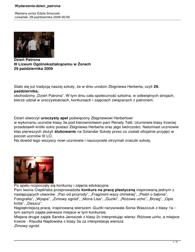 Wydarzenia-dzien_patrona Wpisany przez Edyta Smyczek czwartek, 29 października 2009 00:00 Dzień Patrona III Liceum Ogólnokształcącemu w Żorach 29 października 2009 Stało się już tradycją naszej szkoły, że w dniu urodzin Zbigniewa Herberta, czyli 29. października, obchodzimy „Dzień Patrona”. W tym dniu cała społeczność szkolna, w odświętnych strojach, bierze udział w uroczystościach, konkursach i zajęciach związanych z patronem. Dzień otworzył uroczysty apel poświęcony Zbigniewowi Herbertowi w wykonaniu uczniów klasy 3a pod kierownictwem pani Renaty Tetli. Uczniowie klasy trzeciej przedstawili krótki szkic postaci Zbigniewa Herberta oraz jego twórczości. Natomiast uczniowie klas pierwszych złożyli ślubowanie na Sztandar Szkoły przez co zostali oficjalnie przyjęci w poczet uczniów III LO. Na dowód tego wszyscy nowi uczniowie i nauczyciele otrzymali znaczki szkoły. Po apelu rozpoczęły się konkursy i zajęcia edukacyjne. Pani Iwona Cieplińska przeprowadziła konkurs na pracę plastyczną inspirowaną jednym z następujących utworów: „Pan od przyrody”, „Fragment wazy chińskiej”, „Pieśń o bębnie”, Fotografia”, „Wyspa”, „Zimowy ogród”, „Mona Lisa”, „Guziki”, „Różowe ucho”, „Brzeg”, „Opis króla”, „Deszcz”. Najpiękniejszą pracę, inspirowaną wierszem Guziki narysowała Sonia Waszczuk z klasy 1a – tym samym zajęła pierwsze miejsce w tym konkursie. Miejsce drugie zajęła Sandra Janoszek z klasy 2c interpretując wiersz Różowe ucho, a miejsce trzecie - Klaudia Najdowska z klasy 3a za interpretację wiersza Zimowy ogród. 1/5 Wydarzenia-dzien_patrona Wpisany przez Edyta Smyczek czwartek, 29 października 2009 00:00 Serdecznie gratulujemy . W podziemiach szkoły powstała w tym dniu scena i widownia. Tam, w niesamowitym nastroju, przy świecach, widzowie wysłuchali konkursowych recytacji wierszy Zbigniewa Herberta w języku angielskim. Oglądali również biorące udział w konkursie prezentacje multimedialne dotyczące życia Poety oraz wysłuchali wyróżnionych prac literackich zainspirowanych twórczością Herberta w wykonaniu swoich nauczycieli języka angielskiego. Wszystko oczywiście po angielsku. Konkursy te przygotowały i przeprowadziły panie uczące języka angielskiego: Katarzyna Bąkowska, Sabina Konsek i Justyna Kosztyła. Zwycięzcy w konkursach angielskojęzycznych to: - w konkursie recytatorskim, pierwsze miejsce zajęła Edyta Adamczyk z klasy 1c, drugie miejsce – Katarzyna Nowak z klasy 1 b, a trzecie – Romina Szala również z klasy 1 b, - w konkursie na utwór literacki inspirowany poezją Zbigniewa Herberta, pierwsze miejsce zajęły ex aequo Julia Koperska i Kinga Kania z klasy 3a, - w konkursie na prezentację multimedialną pierwsze miejsce zajęła prezentacja na temat Młod ość i wiek dojrzały Zbigniewa Herberta autorstwa grupy uczniów z klasy 2a w składzie: Monika Zbrzeźna, Monika Ber, Andżelika Chmielowska, Marta Śmietana, Patrycja Siwek, Karolina Sromek, Angelika Surma, Joanna Maniura. Miejsce drugie zajęła prezentacja pt.: Jesień życia Zbigniewa Herberta w wykonaniu grupy uczniów z klasy 2b w składzie: Anna Janeta, Ewa Szatanik, Natalia Andrzejewska, Aneta Pągowska, Aleksandra Gorzawska i Katarzyna Świeczka. Miejsce trzecie zajęła prezentacja: Młodość i wiek dojrzały Zbigniewa Herberta , którą przygotowali następujący uczniowie klasy 2c: Izabela Szymańska, Dominika Grosz, Sylwia Konik, Patrycja Podżorska, Marcin Jokiel, Przemek Pokorski, Jakub Brzezina. 2/5 Wydarzenia-dzien_patrona Wpisany przez Edyta Smyczek czwartek, 29 października 2009 00:00 Wszyscy laureaci otrzymali pamiątkowe dyplomy. Nagrodą dla zdobywców pierwszych miejsc w każdym z konkursów angielskojęzycznych jest wyjazd do Katowickiego Teatru Korez na przedstawienie w języku angielskim pt.: I love Schakespeare. Nagrodzone prace literackie i prezentacje multimedialne znajdują się na naszej stronie. W tym samym czasie odbywały się w szkole zajęcia edukacyjne związane z postacią i twórczością Zbigniewa Herberta. Tematy tych zajęć to: Zbigniew Herbert - szkic postaci (pani Edyta Smyczek) , Herbertowska interpretacja wątków mitologicznych (pani Renata Tetla) , Podróże Zbigniewa Herberta (pani Katarzyna Foltys), „Uczniowie Pana Cogito”- projekcja reportażu (pani Agnieszka Fajkier), „Wykład dr Opackiej-Walasek” – projekcja fragmentów (pani Bogumiła Kajzerek) , Analiza i interpretacja wybranego utworu poetyckiego (pani Grażyna Klimiuk) , Warsztaty ze znajomości eseju Zbigniewa Herberta „Labirynt nad morzem” (pani Irena Krzywoń). Dzień Patrona to wyraz pamięci o niezwykłym człowieku, możliwość zgłębienia wiedzy o nim, zanurzenia się w nastrój poezji ale również miła odmiana szarej, szkolnej codzienności ... 3/5 Wydarzenia-dzien_patrona Wpisany przez Edyta Smyczek czwartek, 29 października 2009 00:00 Dzień Patrona III Liceum Ogólnokształcącemu w Żorach 29 października 2008 W dn. 29.10.2008 r. w 84-tą rocznicę urodzin Zbigniewa Herberta uroczyście w naszej szkole obchodziliśmy Dzień Patrona. Patronalne święto obchodziliśmy już po raz ósmy. Szkolne świętowanie rozpoczęliśmy uroczystym apelem w czasie którego młodzież klas pierwszych złożyła ślubowanie. Program artystyczny przygotowany został przez panią mgr Grażynę Klimiuk i uzdolnioną artystycznie młodzież naszej szkoły. Następnie uczniowie udali się na zajęcia edukacyjne związane z patronem szkoły. Program tych zajęć przedstawiał się następująco: - Zbigniew Herbert- szkic postaci - Herbertowska interpretacja wątków mitologicznych - Brewiarz- rozważania o cierpieniu - Podróże Zbigniewa Herberta - "Uczniowie Pana Cogito"- projekcja reportażu - Wykład dr D. Opackiej- Walasek- Projekcja fragmentów - Analiza i interpretacja wybranego utworu poetyckiego na podstawie wierszy "Kamyk", "Siódmy anioł" 4/5 Wydarzeni