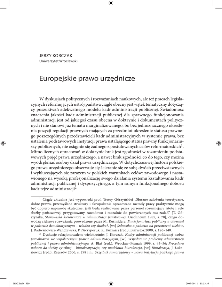 JERZY KORCZAK Uniwersytet Wrocławski Europejskie prawo urzędnicze W dyskusjach politycznych i rozważaniach naukowych, ale też pracach legislacyjnych reformujących ustrój państwa ciągle obecny jest wątek tematyczny dotyczący poszukiwań adekwatnego modelu kadr administracji publicznej. Świadomość znaczenia jakości kadr administracji publicznej dla sprawnego funkcjonowania administracji jest od jakiegoś czasu obecna w doktrynie i dokumentach politycznych i nie stanowi już tematu marginalizowanego, bo bez jednoznacznego określenia pozycji regulacji prawnych mających za przedmiot określenie statusu prawnego poszczególnych przedstawicieli kadr administracyjnych w systemie prawa, bez ustalenia podstawowych instytucji prawa ustalającego status prawny funkcjonariuszy publicznych, nie osiągnie się żadnego z postulowanych celów reformatorskich1. Mimo licznych opracowań w doktrynie brak jest zgodności w rozumieniu podstawowych pojęć prawa urzędniczego, a nawet brak zgodności co do tego, czy można wyodrębniać osobny dział prawa urzędniczego. W dotychczasowej historii polskiego prawa urzędniczego obserwuje się ścieranie się ze sobą dwóch przeciwstawnych i wykluczających się zarazem w polskich warunkach celów: zawodowego i nastawionego na wysoką profesjonalizację swego działania systemu kształtowania kadr administracji publicznej i dyspozycyjnego, a tym samym funkcjonalnego doboru kadr tejże administracji2. 1 Ciągle aktualna jest wypowiedź prof. Teresy Górzyńskiej „Słuszne założenia teoretyczne, dobre prawo, przemyślane struktury i skrupulatnie opracowane metody pracy praktycznie mogą być dopiero naprawdę skuteczne, jeśli będą realizowane przez personel rozumiejący istotę i cele służby państwowej, przygotowany zawodowo i moralnie do powierzonych mu zadań” [T. Górzyńska, Stanowiska kierownicze w administracji państwowej, Ossolineum 1985, s. 70], czego dowodzą ciekawe rozważania prowadzone przez M. Kuśmidera, Funkcjonariusz publiczny a obywatel w państwie demokratycznym – władza czy służba?, [w:] Jednostka a państwo na przestrzeni wieków, J. Radwanowicz-Wanczewska, P. Niczyporuk, K. Kuźmicz (red.), Białystok 2008, s. 126–140. 2 Dyskusje relacjonowałem wielokrotnie: J. Korczak, Kadry administracji publicznej wobec przeobrażeń we współczesnym prawie administracyjnym, [w:] Współczesne problemy administracji publicznej i prawa administracyjnego, A. Błaś (red.), Wrocław–Poznań 1999, s. 43–56; Procedura naboru do służby cywilnej – biurokratyzacja, czy modelowa biurokracja, [w:] Biurokracja, J. Łukasiewicz (red.), Rzeszów 2006, s. 298 i n.; Urzędnik samorządowy – nowa instytucja polskiego prawa BOC.indb 359 2009-09-11 11:53:39 360 JERZY KORCZAK Dla prowadzonych rozważań pomocne może być odniesienie się do rozwiązań stosowanych w innych krajach, zwłaszcza krajach europejskich3, a już szczególnym kryterium byłoby oczywiście odniesienie się do krajów członkowskich Unii Europejskiej. Skoro bowiem ma ona tworzyć europejską przestrzeń administracyjną4, to obok elementów strukturalnych (wspólne instytucje, ale też podobieństwo instytucji krajowych), materialnoprawnych (europeizacja prawa administracyjnego jest już w zasadzie stanem faktycznym) i proceduralnych (obok procedur komitologicznych5, na razie krajowe procedury administracyjne wykazują jeszcze dużą swoistość6) należy oczekiwać powstania europejskiego prawa urzędniczego, tym bardziej że dwa wiodące w Unii kraje – Francja i Niemcy, to zarazem kraje o najdłuższej tradycji nie tylko doktrynalnej koncepcji, ale pozytywnoprawnych rozwiązań prawa urzędniczego7, które wywierały duży wpływ na rozwój tego prawa w pozostałych krajach europejskich8, chociaż zdaniem J. Czaputowicza brak wspólnotowego prawa administracyjnego i urzędniczego to wynik zasady suwerenności państw członkowskich, które zgodnie z zasadą subsydiarności samodzielnie kształtują swoją administrację i w tym struktury służby cywilnej, a własne wizje służby cywilnej wynikają z odrębnej tradycji, kultury i historii9. Mimo to można już mówić o pewnej standaryzacji służb cywilnych w krajach członkowskich, a tym samym przy nadal dużej różnorodności systemów przyjętych w posamorządowego, [w:] E. Ura (red.), Sprawność działania administracji samorządowej, Rzeszów 2006, s. 272 i n. 3 Jednego z najszerszych badań komparatystycznych dokonała w doktrynie prawa urzędniczego T. Górzyńska w cytowanej już monografii. Drugiej takiej próby podjęła się trzynaście lat później B. Kudrycka, Neutralność polityczna urzędników, Warszawa 1998, chociaż ze względu na temat monografii, zakres tych badań był węższy i bardziej ukierunkowany na zagadnienie profesjonalizacji i zawodowości, a politycznych wpływów na korpusy urzędnicze w wybranych krajach europejskich i anglosaskich. Równie cenne spojrzenie prawnoporównawcze zawierają materiały z konferencji zorganizowanej z okazji 6-lecia KSAP w 1996 r. [Służba cywilna a etyka w życiu publicznym, J. Jacki (red.), Warszawa 1996]. 4 Zob. J. Supernat, Europejska przestrzeń administracyjna (zarys problematyki), [w:] Europeizacja polskiego prawa administracyjnego, Z. Janku, Z. Leoński, M. Szewczyk, M. Waligórski, K. Wojtczak (red.), Wrocław 2005, s. 78–86. 5 Zob. A. Michoński, A. Nowak-Far, Udział administracji krajów członkowskich Unii Europejskiej w komitologii, „Służba Cywilna” 2005, nr 9, s. 55–68; R. Pedler, G. Schaefer (eds), Shaping European Law and Policy: The Role of Committees and Comitology in the Political Process, European Institute of Public Administration, Maastricht 1999; G. Heibach, Council Decision 199/468 – A New Comitology Decision for the 21st Century?, EIPASCOPE 1999/3. 6 Zob. Z. Niewiadomski, Kodeks Dobrej Administracji a polska procedura administracyjna, [w:] Jakość administracji publicznej. Międzynarodowa konf