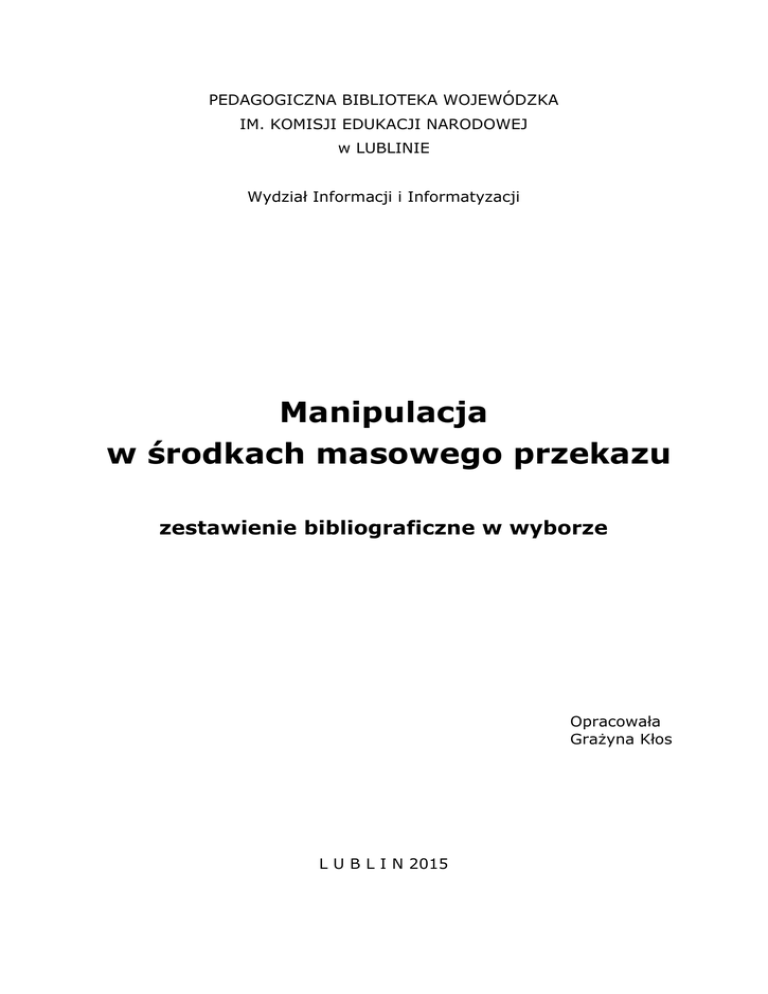 PEDAGOGICZNA BIBLIOTEKA WOJEWÓDZKA IM. KOMISJI EDUKACJI NARODOWEJ w LUBLINIE Wydział Informacji i Informatyzacji Manipulacja w środkach masowego przekazu zestawienie bibliograficzne w wyborze Opracowała Grażyna Kłos L U B L I N 2015 Wydawnictwa zwarte 1. Agresja, przemoc i terror w telewizyjnych programach informacyjnych w Polsce / Bartłomiej Łódzki // W: Media masowe w demokratyzujących się systemach politycznych : w drodze do wolności słowa i mediów / pod red. Bogusławy Dobek-Ostrowskiej. Wrocław : Wydaw. Uniwersytetu Wrocławskiego, 2006. - S. 165-180 2. Człowiek a polityka : zarys psychologii politycznej / Krystyna Skarżyńska. - Warszawa : "Scholar", 2005. - S. 306-341: Media: czy i jak wpływają na przekonania, postawy i zachowania polityczne 3. Czy media kłamią? / Michał Kozłowski // W: Media i władza : demokracja, wolność przekazu i publiczna debata w warunkach globalizacji mediów / red. Piotr Żuk. - Warszawa : "Scholar", 2006. S. 294-300 4. Doświadczenia polskiego marketingu politycznego - o roli mediów w sukcesie wyborczym / Grzegorz Wilk-Jakubowski // W: Środki przekazu : informacja czy manipulacja / red. Adam Balicki, Tadeusz Guz, Wojciech Lis ; Katolicki Uniwersytet Lubelski Jana Pawła II. Wydział Zamiejscowy Nauk Prawnych i Ekonomicznych KUL w Tomaszowie Lubelskim. - Stan prawny w dniu 31 października 2008 r. - Lublin : Wydaw. KUL, 2008. - S. 81-94 5. Działalność mediów a wolność religijna / Marek Bielecki // W: Środki przekazu : informacja czy manipulacja / red. Adam Balicki, Tadeusz Guz, Wojciech Lis ; Katolicki Uniwersytet Lubelski Jana Pawła II. Wydział Zamiejscowy Nauk Prawnych i Ekonomicznych KUL w Tomaszowie Lubelskim. - Stan prawny w dniu 31 października 2008 r. - Lublin : Wydaw. KUL, 2008. - S. 155-175 6. Dzieci i młodzież jako "decydenci" i "eksperci" w sprawach rodzinnych zakupów czyli Jakie wzorce zachowań dzieci i młodzieży sugerują reklamy telewizyjne / Ewa Konefał-Racińska // W: Rodzina w kontekście współczesnych problemów wychowania / red. nauk. Bożena Muchacka. - Kraków : Wydaw. Naukowe Papieskiej Akademii Teologicznej, 2008. -S. 349-358 7. Edukacyjne aspekty manipulacji w cyberprzestrzeni / Józef Bednarek // W: Manipulacja - media - edukacja / red. Bronisław Siemieniecki. - Toruń : Wydaw. Adam Marszałek, 2007. - S. 359-369 8. Efekt Lolity : wizerunek nastolatek we współczesnych mediach i jak sobie z nim radzić / Meenakshi Durham ; przeł. [z ang.] Mikołaj Gliński. - Warszawa : Prószyński i S-ka, 2010. – 238 s. 9. Elementy manipulacji językowej w mass mediach / Justyna Góźdź // W: Wartości - interesy - struktury społeczne : uwarunkowania ludzkiej kreatywności i partycypacji w życiu publicznym / red. Jan Szymczyk ; Katolicki Uniwersytet Lubelski Jana Pawła II. Instytut Socjologii. Katedra Socjologii Makrostruktur i Ruchów Społecznych. - Lublin : "Norbertinum", 2010. - S. 207-220 10. Granice wolności mediów / Wisława Piątkowska-Stepaniak // W: Media a demokracja / pod red. Lidii Pokrzyckiej i Włodzimierza Micha. - Lublin : Wydaw. Uniwersytetu Marii Curie-Skłodowskiej, 2007. – S. 143-154 11. Gry językowe w tekstach publicystycznych : kreacja czy manipulacja? / Jolanta Kowalewska-Dąbrowska // W: Kreowanie światów w języku mediów / pod red. Pawła Nowaka, Ryszarda Tokarskiego. - Lublin : Wydaw. Uniwersytetu Marii CurieSkłodowskiej, 2007. - S. 87-105 12. Gry reklamy: rola dziecka w postmodernistycznej wizji konsumpcji masowej / Natalia Krzyżanowska // W: Współtworzenie edukacji : szkoła - rodzina - społeczeństwo / pod red. nauk. Mirosławy NyczajDrąg i Michała Głażewskiego ; Uniwersytet Zielonogórski w Zielonej Górze. - Kraków : "Impuls", 2005. – S. 179-191 13. Iluzoryczność wzorców proponowanych młodzieży w mass mediach / Dorota Bis // W: Problemy współczesnej młodzieży w ujęciu nauk społecznych / pod red. Franciszki Wandy Wawro ; Katolicki Uniwersytet Lubelski Jana Pawła II. Wydział Nauk Społecznych. Katedra Socjologii Społecznej. - Wyd. 2. - Lublin : Wydaw. Katolickiego Uniwersytetu Lubelskiego, 2007. - S. 195-217 14. Jad medialny / Piotr Legutko. - Kraków : "Arcana", 2005. – 167 s. 15. Jak chronić przed manipulacją reklamową? / Dariusz Kufta // W: (Bez)radność wychowania...? / pod red. Zbigniewa Marka i Magdaleny Madej-Babuli. - Kraków : "Ignatianum" : Wydaw. WAM, 2007. - S. 235-245 16. Językowa przemoc mediów / Aleksandra Koś // W: Media i władza : demokracja, wolność przekazu i publiczna debata w warunkach globalizacji mediów / red. Piotr Żuk. - Warszawa : "Scholar", 2006. -S. 187-197 17. Kidnaping : jak marketerzy kontrolują umysł twojego dziecka / Acuff Daniel S., Reiher Robert H. ; [tł z ang. Monika Lipiec-Szafarczyk, Joanna Sugiero]. - Warszawa : "Helion", 2006. – 425 s. 18. Komunikacja, manipulacja, edukacja / Marek Graszewicz // W: Manipulacja - media - edukacja / red. Bronisław Siemieniecki. - Toruń : Wydaw. Adam Marszałek, 2007. - S. 287-294 19. Konserwatyzm czy liberalizm? : obraz demokracji lansowany w Radiu Maryja i "Tygodniku Powszechnym" / Katarzyna Bernat // W: Media a demokracja / pod red. Lidii Pokrzyckiej i Włodzimierza Micha. - Lublin : Wydaw. Uniwersytetu Marii Curie-Skłodowskiej, 2007. - S. 131-139 20. Kreowanie wizerunku homoseksualisty jako stylisty we współczesnych mediach / Agnieszka Kida // W: Stereotypy - walka z wiatrakami? / red. Anna Bujnowska, Joanna Szadura. - Lublin :Wydaw. Uniwersytetu Marii Curie-Skłodowskiej, 2011. - S. 183-190 21. Kryptoreklama a praktyka dziennikarska / Maciej Miżejewski // W: Media a demokracja / pod red. Lidii Pokrzyckiej i Włodzimierza Micha. - Lublin : Wydaw. Uniwersytetu Marii Curie-Skłodowskiej, 2007. - S. 179-182 22. Krzywe zwierciadło : o manipulacji w mediach /Maciej Iłowiecki. - Lublin : "Gaudium", 2003. – 232 s. 23. Kształcenie pedagogów i nauczycieli @ media / Maciej Tanaś // W: Manipulacja - media - edukacja / red. Bronisław 