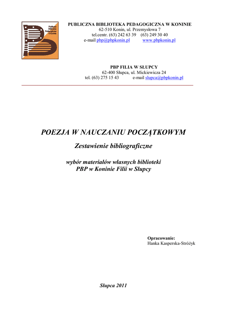 PUBLICZNA BIBLIOTEKA PEDAGOGICZNA W KONINIE 62-510 Konin, ul. Przemysłowa 7 tel.centr. (63) 242 63 39 (63) 249 30 40 e-mail [email protected] www.pbpkonin.pl PBP FILIA W SŁUPCY 62-400 Słupca, ul. Mickiewicza 24 tel. (63) 275 15 43 e-mail [email protected] ___________________________________________________________________________ POEZJA W NAUCZANIU POCZĄTKOWYM Zestawienie bibliograficzne wybór materiałów własnych biblioteki PBP w Koninie Filii w Słupcy Opracowanie: Hanka Kasperska-Stróżyk Słupca 2011 WSTĘP Wiersz jest jednym z pierwszych utworów literackich , które dziecko poznaje. Wiersz nie jest zatem dla dziecka zjawiskiem nowym w okresie nauczania początkowego. Edukacja literacka na szczeblu wczesnoszkolnym ma do spełnienia wiele zadań, między innymi powinna wprowadzić uczniów w świat literatury, rozwijać ich osobowość, kształtować postawę twórczą, a także wychowywać. Nauczanie poezji w klasach początkowych jest przede wszystkim źródłem przeżyć i wzruszeń. Poza tym, pozwala realizować cele takie jak: uczenie języka i płynności mowy, budzenie wrażliwości słuchowej na rym i rytm (melodykę wiersza), budzenie wrażliwości na piękno słowa, piękno języka polskiego, budzenie wyobraźni dziecka, kształtowanie uwagi i pamięci, umiejętności wyrazistego czytania i recytowania. Nowoczesna koncepcja oswajania dzieci z literaturą, zakłada przejście od biernego słuchania utworu, do takiego kontaktu z utworem, który pozwoli odczytywać sens utworu, rozbudzi wrażliwość i sprawność intelektualną ucznia oraz sprawi mu przyjemność. Prezentujemy zestawienie bibliograficzne, wykaz literatury przedmiotu na temat: „Poezja w nauczaniu początkowym”. Obejmuje ono pozycje dostępne w zbiorach Publicznej Biblioteki Pedagogicznej w Koninie Filii w Słupcy. Po każdym opisie bibliograficznym wydawnictwa zwartego znajdą Państwo jego sygnaturę. WYDAWNICTWA ZWARTE 1. CZYTA, nie czyta... : (o dziecku literackim) / Baluch Alicja. – Kraków : Wydawnictwo Edukacyjne, 1998 Sygn.: 25170 2. DZIECKO i świat przedstawiony czyli tajemnice dziecięcej lektury / Baluch Alicja. – Warszawa : Instytut Wydawniczy "Nasza Księgarnia", 1987 Sygn.: 19078 3. FUNKCJE śmiechu we współczesnej poezji dla dzieci / Wachowiak Regina // W: Sztuka dla dzieci szkolnych : teoria – recepcja – oddziaływanie : praca zbiorowa / red. Tyszkowa Maria. – Warszawa ; Poznań : Państwowe Wydawnictwo Naukowe, 1979. – s. 133-145 Sygn.: 13768 4. LEKTURA szkolna w klasach 1-3 : przewodnik metodyczny dla nauczyciela / Laskowska Regina, Szymańska Maria Alicja. – Łódź : Wydawnictwo "Juka", 1993 Sygn.: 21984 5. METODYKA języka polskiego w klasach 1-3 szkoły podstawowej / Baczyńska Halina. – Warszawa : Wydawnictwa Szkolne i Pedagogiczne, 1985 Sygn.: 17330, 17331, 17237, 17238 6. OSWAJANIE ze sztuką słowa : początki edukacji literackiej / Żuchowska Wiesława. – Warszawa : Wydawnictwa Szkolne i Pedagogiczne, 1992 Sygn.: 21316 2 7. POEZJA w wierszach dla dzieci / Żurakowski Bogusław // W: Sztuka dla dzieci szkolnych : teoria – recepcja – oddziaływanie : praca zbiorowa / red. Tyszkowa Maria. – Warszawa ; Poznań : Państwowe Wydawnictwo Naukowe, 1979. – s. 109-128 Sygn.: 13768 8. POEZJA współczesna w szkole podstawowej / Baluch Alicja. – Warszawa : Wydawnictwa Szkolne i Pedagogiczne, 1984 Sygn.: 16835, 16836 9. POGADUSZKI do poduszki : (o literaturze dla najmłodszych) / Baluch Alicja. – Kraków : Wydawnictwo Edukacyjne, 1996. Sygn.: 25171 10. PEDAGOGICZNE aspekty obcowania dziecka z literaturą / Starorypińska Elżbieta // W: Sztuka dla dzieci szkolnych : teoria – recepcja – oddziaływanie : praca zbiorowa / red. Tyszkowa Maria. – Warszawa ; Poznań : Państwowe Wydawnictwo Naukowe, 1979. – s. 167-177 Sygn.: 13768 11. WIELKA zabawa : folklor dziecięcy, wyobraźnia dziecka, wiersze dla dzieci / Cieślikowski Jerzy. – [Wyd. 2]. – Wrocław : Zakład Narodowy im. Ossolińskich – Wydawnictwo, 1985 Sygn.: 17606 12. WYOBRAŹNI można uczyć : sprawozdanie z eksperymentu szkolnego [na podstawie „Analiza pozawerbalna. Przygotowanie do odbioru poezji współczesnej w szkole”] / Baluch Alicja // W: Sztuka dla dzieci szkolnych : teoria – recepcja – oddziaływanie : praca zbiorowa / red. Tyszkowa Maria. – Warszawa ; Poznań : Państwowe Wydawnictwo Naukowe, 1979. – s. 149-162 Sygn.: 13768 ARTYKUŁY Z CZASOPISM 1. DZIECKO jako odbiorca fikcji literackiej i muzycznej / Zbróg Zuzanna // Nauczanie Początkowe. – 1999/2000, z. 4, s. 104-113 2. ETAPY opracowania tekstu poetyckiego / Domin Halina // Nauczanie Początkowe. – 1996/1997, z. 6, s. 104-111 3. JAK rozmawiać z dzieckiem o poezji, czyli o przygotowaniu do odbioru dzieła literackiego? / Brzezińska Anna , Stasiakiewicz Maria // Życie Szkoły. – 1981, nr 1, s. 3034 4. „PSOTKI i Śmieszki” J. Porazińskiej / Borowiec Barbara // Nauczanie Początkowe. – 1992/93, nr 6, s. 116-110 5. LITERATURA dziecięca w edukacji wczesnoszkolnej : bibliografia w wyborze za lata 2000-2006 / Łojek Anna // Nauczanie Początkowe. – 2006/2007, nr 2, s. 99-102 6. LIRYKA dziecięca w edukacji : polisensoryczne interpretowanie metafory / Krasoń Katarzyna // Życie Szkoły. – 2002, nr 10, s. 579-584 3 7. MIEJSCE tekstu poetyckiego w początkowym kształceniu literackim / Cybulska Halina // Nauczanie Początkowe. – 1996/1997, z. 6, s. 72-86 8. MOJE doświadczenia w pracy z tekstem wierszowanym w klasach I-III / Gawęda Janina // Życie Szkoły. – 1990, nr 5/6, s. 254-259 9. O aktywności edukacyjnej dzieci młodszych związanej z wierszem / Lenartowska Krystyna, Świętek Wacława // Wychowanie na co Dzień. – 2006, nr 4/5, Wkładka Metodyczna, s. I-V 10. OBCOWANIE z wierszem / Lenartowska Krystyna, Świętek Wacława // Życie Szkoły. – 2009, nr 8, s. 27-31 11. POEZJA w nauczaniu początkowym / Kośnik Regina, Tarasiewicz Irena // Życie Szkoły. – 1988, nr 3, s. 158-166 1