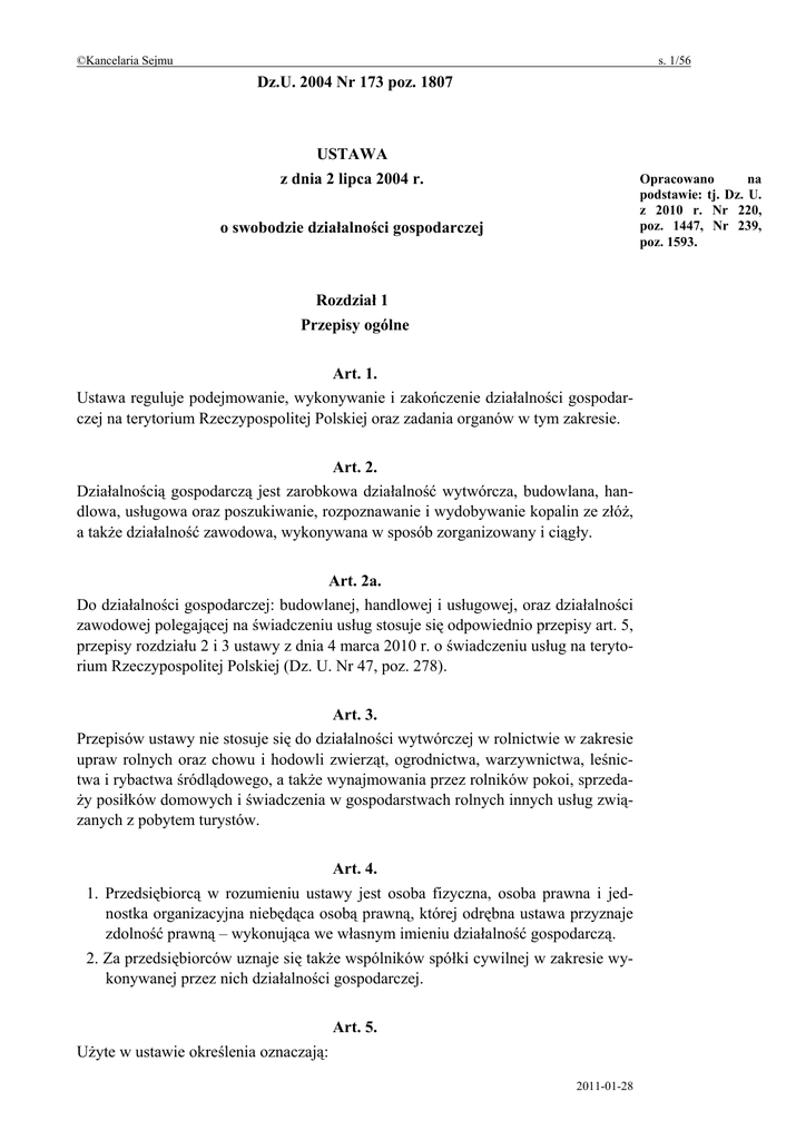 ©Kancelaria Sejmu s. 1/56 Dz.U. 2004 Nr 173 poz. 1807 USTAWA z dnia 2 lipca 2004 r. Opracowano na podstawie: tj. Dz. U. z 2010 r. Nr 220, poz. 1447, Nr 239, poz. 1593. o swobodzie działalności gospodarczej Rozdział 1 Przepisy ogólne Art. 1. Ustawa reguluje podejmowanie, wykonywanie i zakończenie działalności gospodarczej na terytorium Rzeczypospolitej Polskiej oraz zadania organów w tym zakresie. Art. 2. Działalnością gospodarczą jest zarobkowa działalność wytwórcza, budowlana, handlowa, usługowa oraz poszukiwanie, rozpoznawanie i wydobywanie kopalin ze złóż, a także działalność zawodowa, wykonywana w sposób zorganizowany i ciągły. Art. 2a. Do działalności gospodarczej: budowlanej, handlowej i usługowej, oraz działalności zawodowej polegającej na świadczeniu usług stosuje się odpowiednio przepisy art. 5, przepisy rozdziału 2 i 3 ustawy z dnia 4 marca 2010 r. o świadczeniu usług na terytorium Rzeczypospolitej Polskiej (Dz. U. Nr 47, poz. 278). Art. 3. Przepisów ustawy nie stosuje się do działalności wytwórczej w rolnictwie w zakresie upraw rolnych oraz chowu i hodowli zwierząt, ogrodnictwa, warzywnictwa, leśnictwa i rybactwa śródlądowego, a także wynajmowania przez rolników pokoi, sprzedaży posiłków domowych i świadczenia w gospodarstwach rolnych innych usług związanych z pobytem turystów. Art. 4. 1. Przedsiębiorcą w rozumieniu ustawy jest osoba fizyczna, osoba prawna i jednostka organizacyjna niebędąca osobą prawną, której odrębna ustawa przyznaje zdolność prawną – wykonująca we własnym imieniu działalność gospodarczą. 2. Za przedsiębiorców uznaje się także wspólników spółki cywilnej w zakresie wykonywanej przez nich działalności gospodarczej. Art. 5. Użyte w ustawie określenia oznaczają: 2011-01-28 ©Kancelaria Sejmu s. 2/56 1) organ koncesyjny – organ administracji publicznej upoważniony na podstawie ustawy do udzielania, odmowy udzielania, zmiany i cofania koncesji; 2) osoba zagraniczna: a) osobę fizyczną nieposiadającą obywatelstwa polskiego, b) osobę prawną z siedzibą za granicą, c) jednostkę organizacyjną niebędącą osobą prawną posiadającą zdolność prawną, z siedzibą za granicą; 3) przedsiębiorca zagraniczny – osobę zagraniczną wykonującą działalność gospodarczą za granicą; 4) oddział – wyodrębnioną i samodzielną organizacyjnie część działalności gospodarczej, wykonywaną przez przedsiębiorcę poza siedzibą przedsiębiorcy lub głównym miejscem wykonywania działalności; 5) działalność regulowana – działalność gospodarczą, której wykonywanie wymaga spełnienia szczególnych warunków, określonych przepisami prawa; 6) właściwy organ – właściwy w sprawach podejmowania, wykonywania lub zakończenia działalności gospodarczej organ administracji publicznej, samorządu zawodowego oraz inny organ władzy publicznej; 7) nadrzędny interes publiczny – nadrzędny interes publiczny w rozumieniu art. 2 ust. 1 pkt 7 ustawy z dnia 4 marca 2010 r. o świadczeniu usług na terytorium Rzeczypospolitej Polskiej. Art. 6. 1. Podejmowanie, wykonywanie i zakończenie działalności gospodarczej jest wolne dla każdego na równych prawach, z zachowaniem warunków określonych przepisami prawa. 2. Właściwy organ nie może żądać ani uzależniać swojej decyzji w sprawie podjęcia, wykonywania i zakończenia działalności gospodarczej przez zainteresowaną osobę od spełnienia przez nią dodatkowych warunków, w szczególności od przedłożenia dokumentów lub ujawnienia danych, nieprzewidzianych przepisami prawa. 3. Właściwy organ, z wyłączeniem sądu powszechnego, nie może żądać ani uzależnić swoich rozstrzygnięć w sprawie podjęcia, wykonywania lub zakończenia działalności gospodarczej od przedłożenia dokumentów w formie oryginału, poświadczonej kopii lub poświadczonego tłumaczenia, chyba że obowiązek taki jest przewidziany przepisami ustaw szczególnych z uwagi na nadrzędny interes publiczny lub wynika z bezpośrednio stosowanych przepisów powszechnie obowiązującego prawa wspólnotowego albo ratyfikowanych umów międzynarodowych. Art. 7. Państwo udziela przedsiębiorcom pomocy publicznej na zasadach i w formach określonych w odrębnych przepisach, z poszanowaniem zasad równości i konkurencji. 2011-01-28 ©Kancelaria Sejmu s. 3/56 Art. 8. 1. Organy administracji publicznej wspierają rozwój przedsiębiorczości, tworząc korzystne warunki do podejmowania i wykonywania działalności gospodarczej, w szczególności wspierają mikroprzedsiębiorców oraz małych i średnich przedsiębiorców. 2. Organy administracji publicznej, które wdrażają programy pomocowe w rozumieniu przepisów o postępowaniu w sprawach dotyczących pomocy publicznej, przekazują drogą elektroniczną informacje o warunkach i formach pomocy udzielanej przedsiębiorcom do Polskiej Agencji Rozwoju Przedsiębiorczości, która je gromadzi i udostępnia na stronie internetowej. 3. Informacje, o których mowa w ust. 2, przekazywane są w terminie 30 dni od dnia ustanowienia programu pomocowego, nie później niż na 14 dni przed wyznaczonym terminem składania wniosków o udzielenie pomocy. Art. 9. Wykonując swoje zadania, w szczególności w zakresie nadzoru i kontroli, właściwy organ działa wyłącznie na podstawie i w granicach prawa, z poszanowaniem uzasadnionych interesów przedsiębiorcy. Art. 9a. Właściwy organ, dokonując oceny spełnienia wymogów niezbędnych do podjęcia i wykonywania działalności gospodarczej na terytorium Rzeczypospolitej Polskiej, uznaje wymogi, jakie spełnił przedsiębiorca mający siedzibę na terytorium jednego z państw, o których mowa w art. 13 ust. 1, aby na terytorium tego państwa mógł podjąć lub wykonywać działalność gospodarczą, w szczególności uznaje certyfikaty, zaświadczenia lub inne dokumenty wydane przez właściwy organ państwa, o których mowa w art. 13 ust. 1, 
