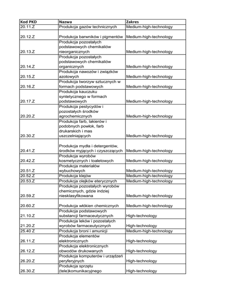 Kod PKD Nazwa Zakres 20.11.Z Produkcja gazów technicznych Medium-high-technology 20.12.Z Produkcja barwników i pigmentów Produkcja pozostałych podstawowych chemikaliów nieorganicznych Produkcja pozostałych podstawowych chemikaliów organicznych Produkcja nawozów i związków azotowych Produkcja tworzyw sztucznych w formach podstawowych Produkcja kauczuku syntetycznego w formach podstawowych Produkcja pestycydów i pozostałych środków agrochemicznych Produkcja farb, lakierów i podobnych powłok, farb drukarskich i mas uszczelniających Medium-high-technology 20.13.Z 20.14.Z 20.15.Z 20.16.Z 20.17.Z 20.20.Z 20.30.Z 20.41.Z 20.42.Z 20.51.Z 20.52.Z 20.53.Z 20.59.Z 20.60.Z 21.10.Z 21.20.Z 25.40 Z 26.11.Z 26.12.Z 26.20.Z 26.30.Z Produkcja mydła i detergentów, środków myjących i czyszczących Produkcja wyrobów kosmetycznych i toaletowych Produkcja materiałów wybuchowych Produkcja klejów Produkcja olejków eterycznych Produkcja pozostałych wyrobów chemicznych, gdzie indziej niesklasyfikowana Produkcja włókien chemicznych Produkcja podstawowych substancji farmaceutycznych Produkcja leków i pozostałych wyrobów farmaceutycznych Produkcja broni i amunicji Produkcja elementów elektronicznych Produkcja elektronicznych obwodów drukowanych Produkcja komputerów i urządzeń peryferyjnych Produkcja sprzętu (tele)komunikacyjnego Medium-high-technology Medium-high-technology Medium-high-technology Medium-high-technology Medium-high-technology Medium-high-technology Medium-high-technology Medium-high-technology Medium-high-technology Medium-high-technology Medium-high-technology Medium-high-technology Medium-high-technology Medium-high-technology High-technology High-technology Medium-high-technology High-technology High-technology High-technology High-technology 26.80.Z Produkcja elektronicznego sprzętu powszechnego użytku Produkcja instrumentów i przyrządów pomiarowych, kontrolnych i nawigacyjnych Produkcja zegarków i zegarów Produkcja urządzeń napromieniowujących, sprzętu elektromedycznego i elektroterapeutycznego Produkcja instrumentów optycznych i sprzętu fotograficznego Produkcja magnetycznych i optycznych niezapisanych nośników informacji 27.11.Z Produkcja elektrycznych silników, prądnic i transformatorów 27.12.Z Produkcja aparatury rozdzielczej i sterowniczej energii elektrycznej Medium-high-technology 27.20.Z Produkcja baterii i akumulatorów Medium-high-technology 27.31.Z Produkcja kabli światłowodowych Produkcja pozostałych elektronicznych i elektrycznych przewodów i kabli Medium-high-technology Medium-high-technology 27.40.Z Produkcja sprzętu instalacyjnego Produkcja elektrycznego sprzętu oświetleniowego 27.51.Z Produkcja elektrycznego sprzętu gospodarstwa domowego 26.40.Z 26.51.Z 26.52.Z 26.60.Z 26.70.Z 27.32.Z 27.33.Z High-technology High-technology High-technology High-technology High-technology High-technology Medium-high-technology Medium-high-technology Medium-high-technology Medium-high-technology 27.90.Z Produkcja nieelektrycznego sprzętu gospodarstwa domowego Medium-high-technology Produkcja pozostałego sprzętu elektrycznego Medium-high-technology 28.11.Z Produkcja silników i turbin, z wyłączeniem silników lotniczych, samochodowych i motocyklowych Medium-high-technology 27.52.Z 28.12.Z 28.13.Z Produkcja sprzętu i wyposażenia do napędu hydraulicznego i pneumatycznego Produkcja pozostałych pomp i sprężarek Medium-high-technology Medium-high-technology 28.14.Z 28.15.Z 28.21.Z 28.22.Z 28.23.Z 28.24.Z 28.25.Z 28.29.Z 28.30.Z 28.41.Z 28.49.Z 28.91.Z 28.92.Z 28.93.Z 28.94.Z 28.95.Z 28.96.Z 28.99.Z 29.10.A Produkcja pozostałych kurków i zaworów Produkcja łożysk, kół zębatych, przekładni zębatych i elementów napędowych Produkcja pieców, palenisk i palników piecowych Produkcja urządzeń dźwigowych i chwytaków Produkcja maszyn i sprzętu biurowego, z wyłączeniem komputerów i urządzeń peryferyjnych Produkcja narzędzi ręcznych mechanicznych Produkcja przemysłowych urządzeń chłodniczych i wentylacyjnych Produkcja pozostałych maszyn ogólnego przeznaczenia, gdzie indziej niesklasyfikowana Produkcja maszyn dla rolnictwa i leśnictwa Produkcja maszyn do obróbki metalu Produkcja pozostałych narzędzi mechanicznych Produkcja maszyn dla metalurgii Produkcja maszyn dla górnictwa i do wydobywania oraz budownictwa Produkcja maszyn stosowanych w przetwórstwie żywności, tytoniu i produkcji napojów Produkcja maszyn dla przemysłu tekstylnego, odzieżowego i skórzanego Produkcja maszyn dla przemysłu papierniczego Produkcja maszyn do obróbki gumy lub tworzyw sztucznych oraz wytwarzania wyrobów z tych materiałów Produkcja pozostałych maszyn specjalnego przeznaczenia, gdzie indziej niesklasyfikowana Produkcja silników do pojazdów samochodowych (z wyłączeniem motocykli) oraz do ciągników rolniczych Medium-high-technology Medium-high-technology Medium-high-technology Medium-high-technology Medium-high-technology Medium-high-technology Medium-high-technology Medium-high-technology Medium-high-technology Medium-high-technology Medium-high-technology Medium-high-technology Medium-high-technology Medium-high-technology Medium-high-technology Medium-high-technology Medium-high-technology Medium-high-technology Medium-high-technology 29.10.B 29.10.C 29.10.D Produkcja samochodów osobowych Produkcja autobusów Produkcja pojazdów samochodowych przeznaczonych do przewozu towarów 29.32.Z Produkcja pozostałych pojazdów samochodowych, z wyłączeniem motocykli Produkcja nadwozi do pojazdów silnikowych; produkcja przyczep i naczep Produkcja wyposażenia elektrycznego i elektronicznego do pojazdów silnikowych Produkcja pozostałych części i akcesoriów do pojazdów silnikowych, z wyłączeniem motocykli 30.20.Z Produkcja lokomotyw kolejowych oraz taboru szynowego 29.10.E 29.20.Z 29.31.Z 30.30.Z 30.40.Z 30.91.Z 30.92.Z 30.99.Z Produkcja statków powietrznych, statków kosmicznych i podobnych maszyn Produkcja w