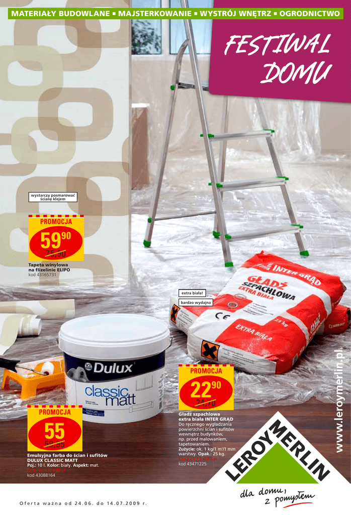 MATERIAŁY BUDOWLANE n MAJSTERKOWANIE n WYSTRÓJ WNĘTRZ n OGRODNICTWO F ES TI W AL D OM U wystarczy posmarować ścianę klejem PROMOCJA 59 90 75,90 Tapeta winylowa na flizelinie ELIPO kod 43165731 extra biała! PROMOCJA 22 PROMOCJA 55 59,95 Emulsyjna farba do ścian i sufitów DULUX CLASSIC MATT Poj.: 10 l. Kolor: biały. Aspekt: mat. Cena za 1 l: 5,50 zł. kod 43088164 O f e r t a w a ż n a o d 2 4 . 0 6 . d o 1 4 . 0 7. 2 0 0 9 r. 90 24,70 Gładź szpachlowa extra biała INTER GRĄD Do ręcznego wygładzania powierzchni ścian i sufitów wewnątrz budynków, np. przed malowaniem, tapetowaniem. Zużycie: ok. 1 kg/1 m2/1 mm warstwy. Opak.: 25 kg. Cena za 1 l: 0,92 zł. kod 43471225 www.leroymerlin.pl bardzo wydajna farby i emalie ´ SZY! NAJTAN KORZYSTNY! ZNAKOMITY! ekologiczna bardzo dobre krycie dobrze kryjąca antyalergiczna łatwe zmywanie i nanoszenie PROMOCJA 15 98 Emulsyjna farba akrylowa do ścian i sufitów IRISS Poj.: 10 l. Kolor: biały. Cena za 1 l: 1,60 zł. kod 42560231 27 95 Emulsyjna farba do wnętrz NOBIMAL Poj. 10 l. Kolor: biały. Aspekt: mat. Cena za 1 l: 2,80 zł. kod 41487355 PROMOCJA PROMOCJA 33 6895 34,50 9990 Emulsyjna farba lateksowa do wnętrz ŚNIEŻKA MAX Poj.: 10 l. Kolor: biały. Aspekt: mat. Cena za 1 l: 6,90 zł. kod 42786562 110,50 Emulsyjna farba lateksowa do ścian wewnętrznych BONDEX SUPER WALL Poj.: 10 l. Kolor: biały. Aspekt: mat. Cena za 1 l: 9,99 zł. kod 42295925 PROMOCJA PROMOCJA 75 4995 Lateksowa emulsja podkładowa do wnętrz ŚNIEŻKA GRUNT Poj.: 15 l. Cena za 1 l: 5 zł. kod 42824992 72 Akrylowa farba do wnętrz SILVER ACRYL Poj.: 10 l. Kolor: biały. Cena za 1 l: 3,30 zł. kod 43526161 85 79 Emulsyjna farba lateksowa do ścian i sufitów BECKERS DESIGNER Poj.: 10 l. Kolor: biały. Aspekt: pełen mat. Cena za 1 l: 23,20 zł. kod 42891814 Dostępna również wersja półmat 249 kod 42891975 Emulsyjna farba akrylowa do ścian i sufitów DEKORAL Poj.: 10 l. Kolor: biały. Cena za 1 l: 5,25 zł. kod 42847336 PROMOCJA Emulsyjna farba akrylowa do wnętrz TIKKURILA PURE WHITE Poj.: 10 l. Kolor: biały. Aspekt: mat. Cena za 1 l: 8,50 zł. kod 42443492 2 52,50 PROMOCJA 95,50 232 49 67,90 Emalia ftalowa CIESZYNKA PLUS Poj.: 5 l. Kolor: biały. Aspekt: połysk. Cena za 1 l: 9,99 zł. kod 41678525 PROMOCJA 5995 79,99 Drabina 4-stopniowa aluminiowa kod 42778071 1850 Zestaw malarski PROMO KIJ TELESKOP + WAŁEK Dł. teleskopu: 2 m. Szer. wałka: 180 mm. kod 43294321 i xxxx FESTIWALxxxdomu ´ SZY! NAJTAN KORZYSTNY! ZNAKOMITY! jednowarstwowa odporna na zmywanie wyjątkowa przyczepność dobrze kryjąca odporna na zmywanie 35 modnych kolorów! PROMOCJA 15 50 Farba emulsyjna do wnętrz DRAGON Poj.: 2,5 l. Kolor: promienie słońca. Aspekt: mat. Dostępna w 5 kolorach. Cena za 1 l: 6,20 zł. kod 43526266 36 5995 50 61,50 Lateksowa emulsja do ścian i sufitów LUXENS Poj.: 2,5 l. Kolor: dachy Asyżu. Aspekt: mat. Dostępna w 34 kolorach + biały. Cena za 1 l: 14,60 zł. kod 43502564 Jednowarstwowa emulsja lateksowa do wnętrz MAGNAT Poj.: 2,5 l. Kolor: zwycięski aleksandryt. Aspekt: mat. Dostępna w 40 kolorach + biały. Cena za 1 l: 23,98 zł. kod 42871010 PROMOCJA PROMOCJA PROMOCJA 2990 8495 64 32,50 Emulsyjna farba akrylowa do wnętrz DEKORAL Poj.: 2,5 l. Kolor: zieleń aloesu. Aspekt: mat. Dostępna w 25 kolorach. Cena za 1 l: 11,96 zł. kod 43257823 88 Emulsyjna farba lateksowa do wnętrz BONDEX SUPER WALL Poj.: 5 l. Kolor: anturium. Aspekt: mat. Dostępna w 25 kolorach. Cena za 1 l: 16,99 zł. kod 43086932 78,40 Emulsyjna farba lateksowa do wnętrz DULUX KUCHNIA & ŁAZIENKA Poj.: 2,5 l. Kolor: soczysta brzoskwinia. Aspekt: mat. Dostępna w 12 kolorach + biały. Cena za 1 l: 25,60 zł. kod 43164674 kolor na życzenie, farba z mieszalnika PROMOCJA 6 99 10,50 Emalia olejno-ftalowa ŚNIEŻKA EFEKTA* Poj.: 0,5 l. Kolor: brązowy. Aspekt: połysk. Dostępna w 20 kolorach. Cena za 1 l: 13,98 zł. kod 42810530 *Do wyczerpania zapasów. PROMOCJA 35 39,90 Emalia akrylowa ACRYLIC ENAMEL Poj.: 0,75 l. Kolor: aksamitka. Aspekt: półmat. Dostępna w 17 kolorach. Cena za 1 l: 46,67 zł. kod 43292522 PROMOCJA 85 98,80 Strukturalna farba emulsyjna MAXI BARANEK Poj.: 10 l. Kolor: biały. Aspekt: mat. Cena za 1 l: 8,50 zł. kod 42504301 153 Wewnętrzny tynk dekoracyjny FOX PIASKOWIEC RUSTYKALNY Poj.: 25 kg. Cena za 1 kg: 6,12 zł. kod 42945903 PROMOCJA 225 246 Emulsyjna farba lateksowa do wnętrz OPTIVA 5 Poj.: 9 l. Aspekt: mat. Dostępna również o poj.: 0,9 i 2,7 l. Cena za 1 l: 25 zł. kod 42038941 3990 Dekoracyjny werniks metaliczny FOX Poj.: 0,7 l. Kolor: złoty. Dostępny również w kolorach: srebro i miedź. Cena za 1 l: 57 zł. kod 43536976 artykuły budowlane płytka do wnętrz i na zewnątrz płytka do wnętrz i na zewnątrz nie wymaga fugowania nie wymaga fugowania PROMOCJA 38 /opak. 45,90 Kamień elewacyjny LIMBURG Opak.: 0,62 m2. Cena za 1 m2: 61,29 zł. kod 43221745 PROMOCJA 38 /opak. 48,50 Kamień elewacyjny ROMA SAHARA Opak.: 0,62 m2. Cena za 1 m2: 61,29 zł. kod 42837102 PROMOCJA PROMOCJA 59 50 /opak. 63,50 Gont bitumiczny KARPIÓWKA Wym.: 33,3 x 100 cm. Kolor: czerwony. Opak.: 3 m2. kod 42960813 do wszelkich płytek elewacyjnych! Papa asfaltowa wierzchniego krycia W400/1200 Rolka: 15 m2. kod 43523270 łatwa w obróbce, wodoi mrozoodporna idealnie imituje starą zaprawę wapienną PROMOCJA PROMOCJA PROMOCJA PROMOCJA 2960 1520 1150 560 33,95 Zaprawa klejąca do płytek elewacyjnych Opak.: 25 kg. Cena za 1 kg: 1,18 zł. kod 42280266 16,80 Zaprawa klejowa do siatki i styropianu TERMOFIX 2 Do przyklejania płyt styropianowych i zatapiania siatki stosowana w metodzie dociepleń „lekkiej-mokrej”. Opak.: 25 kg. Cena za 1 kg: 0,61 zł. kod 42050092 Dostępna również: zaprawa klejowa do siatki TERMOFIX 1 11,30 Opak.: 25 kg. Cena za 1 kg: 0,45 zł. kod 42050085 14,10 6,40 Klej gipsowy do przyklejania płyt gipsowo-kartonowych GIPSOFIX Opak.: 20 kg. Cena za 1 kg: 0,57 zł. kod 43213905 Uniwersalna zaprawa murarska MURFIX Opak.: 25 kg. Cena za 1 kg: 0,22 