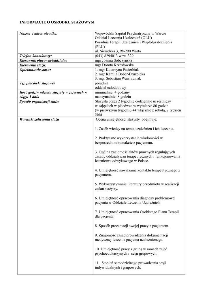 INFORMACJE O OŚRODKU STAŻOWYM Nazwa i adres ośrodka: Telefon kontaktowy: Kierownik placówki/oddziału: Kierownik stażu: Opiekunowie stażu: Typ placówki stażowej Ilość godzin udziału stażysty w zajęciach w ciągu 1 dnia Sposób organizacji stażu Warunki zaliczenia stażu Wojewódzki Szpital Psychiatryczny w Warcie Oddział Leczenia Uzależnień (OLU) Poradnia Terapii Uzależnień i Wspłółuzależnienia (PLU) ul. Sieradzka 3, 98-290 Warta (043) 8294013 wew. 329 mgr Joanna Sobczyńska mgr Dorota Krzesłowska 1. mgr Katarzyna Pasierbiak 2. mgr Kamila Bober-Drużbicka 3. mgr Sebastian Wawrzyniak poradnia oddział całodobowy minimalnie: 4 godziny maksymalnie: 8 godzin Stażysta przez 2 tygodnie codziennie uczestniczy w zajęciach w placówce w wymiarze 80 godzin (w pierwszym tygodniu 44 wlącznie z sobotą, 2 tydzień 36h) Ocena umiejętności stażysty obejmuje: 1. Zasób wiedzy na temat uzależnień i ich leczenia. 2. Praktyczne wykorzystanie wiadomości w bezpośrednim kontakcie z pacjentem. 3. Ogólna znajomość aktów prawnych regulujących zasady oddziaływań terapeutycznych i funkcjonowania lecznictwa odwykowego w Polsce. 4. Umiejętność nawiązania kontaktu terapeutycznego z pacjentem. 5. Wykorzystywanie literatury przedmiotu w realizacji zadań stażysty. 6. Umiejętność opracowania diagnozy problemowej pacjenta w Oddziale Leczenia Uzależnień. 7. Umiejętność opracowania Osobistego Planu Terapii dla pacjenta. 8. Sposób prezentacji swojej pracy z pacjentem. 9. Znajomość zasad prowadzenia dokumentacji medycznej leczenia pacjenta uzależnionego. 10. Umiejętność pracy z grupą w ramach zajęć psychoedukacyjnych i sesji grupowych. 11. Stopień samodzielnego prowadzenia sesji indywidualnych i grupowych. 12. Umiejętność przeprowadzania rozmów motywacyjnych z pacjentami Poradni Leczenia Uzależnień i Współuzależnienia. 13. Umiejętność rozumienia problemów pacjenta i ich interpretacja w ramach teorii z zakresu psychoterapii uzależnień. 14. Umiejętność monitorowania postępów pacjenta w terapii. 15. Dobór metod i technik terapeutycznych w czasie wykonywania zadań stażysty. 16. Umiejętność współpracy z zespołem terapeutycznym. 17. Umiejętności komunikacyjne i interpersonalne stażysty. 18. Postawa etyczna w czasie wykonywania zadań stażysty. 19. Zaangażowanie w wykonywane zadania i stopień zainteresowania problematyką stażu. 20. Prowadzenie dzienniczka stażysty. Możliwość zakwaterowania w ośrodku stażowym Tak Rodzaje zajęć, w których uczestniczy stażysta obowiązkowo opcjonalnie nie uczestniczy prowadzi współprowadzi obserwuje program podstawowy dla uzależnionych: diagnoza X X przyjęcie pacjenta do terapii X X sesje psychoterapii indywidualnej X X sesje psychoterapii grupowej X X układanie OPT X X tworzenie planów terapii X X X X X X X X X program pogłębiony dla uzależnionych tworzenie planów terapii X X X X sesje psychoterapii indywidualnej X X X X sesje psychoterapii grupowej program podstawowy dla współuzależnionych X X X X spotkanie diagnostyczne X X X X przyjęcie pacjenta do terapii X X tworzenie planów terapii X X X sesje psychoterapii indywidualnej X X X X sesje psychoterapii grupowej program pogłębiony dla współuzależnionych X X X X X tworzenie planów terapii X X X X sesje psychoterapii indywidualnej X X X X sesje psychoterapii grupowej X X X X pozostałe spotkania społeczności terapeutycznej prezentacja na zebraniach klinicznych zespołu X X X X sesje rodzinne X program dla DDA X program dla ofiar przemocy X X X program dla sprawców przemocy program dla osób z uzależnieniem innym niż alkohol X X X X X prowadzenie dokumentacji medycznej X X X X X X X X X Pozostałe informacje: Dodatkowo proponujemy: 1.Zapoznanie się z pracą lekarza -psychiatry i pielęgniarek w uzależnieniach. 2.Zapoznanie się z pracą pracownika socjalnego w leczeniu uzależnień. 3.Poznanie funkcjonowania oddziału leczenia abstynencyjnych zespołów alkoholowych (OLAZA) i udział w sesji motywującej do zmian. 4.Zapoznanie się ze specyfiką leczenia dzieci i młodzieży nadużywających substancji psychoaktywnych ( wizyta w Oddziale Psychiatrii Dzieci i Młodzieży WSP Warta). 5.Udział na zasadzie obserwacji uczestniczącej w zajęciach programów dodatkowych realizowanych w OLI i PLU Warta : - program zjazdu absolwentów - spotkanie rodzin i bliskich pacjentów - program rozpoznawania i konstruktywnego radzenia sobie za złością - program zapobiegania przemocy w rodzinie - program leczenia uzależnienia od nikotyny - program zapobiegania nawrotom choroby - program edukacyjny dla dzieci i młodzieży z rodzin z problemem uzależnienia - program leczenia osób młodych zagrożonych uzależnieniem 6.Możliwość poznania specyfiki lecznictwa odwykowego w strukturach szpitala.
