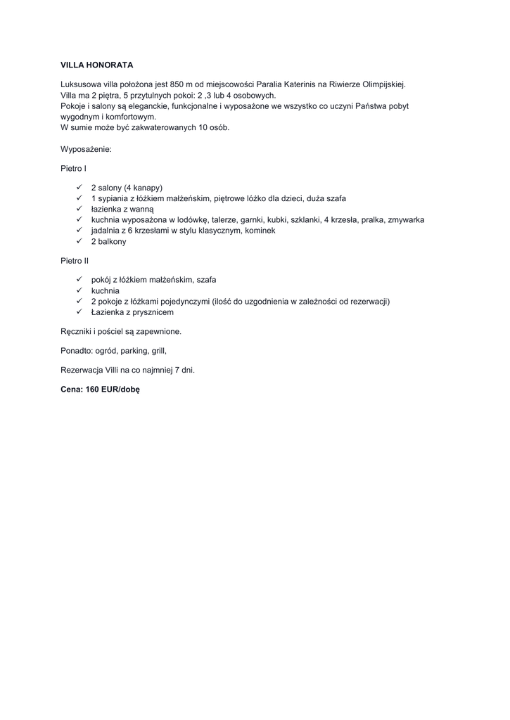 VILLA HONORATA Luksusowa villa położona jest 850 m od miejscowości Paralia Katerinis na Riwierze Olimpijskiej. Villa ma 2 piętra, 5 przytulnych pokoi: 2 ,3 lub 4 osobowych. Pokoje i salony są eleganckie, funkcjonalne i wyposażone we wszystko co uczyni Państwa pobyt wygodnym i komfortowym. W sumie może być zakwaterowanych 10 osób. Wyposażenie: Pietro I 2 salony (4 kanapy) 1 sypiania z łóżkiem małżeńskim, piętrowe lóżko dla dzieci, duża szafa łazienka z wanną kuchnia wyposażona w lodówkę, talerze, garnki, kubki, szklanki, 4 krzesła, pralka, zmywarka jadalnia z 6 krzesłami w stylu klasycznym, kominek 2 balkony Pietro II pokój z łóżkiem małżeńskim, szafa kuchnia 2 pokoje z łóżkami pojedynczymi (ilość do uzgodnienia w zależności od rezerwacji) Łazienka z prysznicem Ręczniki i pościel są zapewnione. Ponadto: ogród, parking, grill, Rezerwacja Villi na co najmniej 7 dni. Cena: 160 EUR/dobę