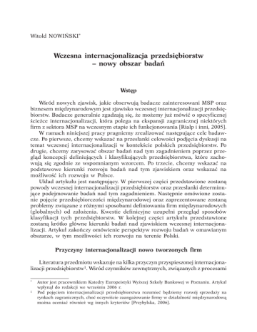 Witold Nowiński* Wczesna internacjonalizacja przedsiębiorstw – nowy obszar badań Wstęp Wśród nowych zjawisk, jakie obserwują badacze zainteresowani MSP oraz biznesem międzynarodowym jest zjawisko wczesnej internacjonalizacji przedsiębiorstw. Badacze generalnie zgadzają się, że możemy już mówić o specyficznej ścieżce internacjonalizacji, która polega na ekspansji zagranicznej niektórych firm z sektora MSP na wczesnym etapie ich funkcjonowania [Rialp i inni, 2005]. W ramach niniejszej pracy pragniemy zrealizować następujące cele badawcze. Po pierwsze, chcemy wskazać na przesłanki celowości podjęcia dyskusji na temat wczesnej internacjonalizacji w kontekście polskich przedsiębiorstw. Po drugie, chcemy zarysować obszar badań nad tym zagadnieniem poprzez przegląd koncepcji definiujących i klasyfikujących przedsiębiorstwa, które zachowują się zgodnie ze wspomnianym wzorcem. Po trzecie, chcemy wskazać na podstawowe kierunki rozwoju badań nad tym zjawiskiem oraz wskazać na możliwość ich rozwoju w Polsce. Układ artykułu jest następujący. W pierwszej części przedstawione zostaną powody wczesnej internacjonalizacji przedsiębiorstw oraz przesłanki determinujące podejmowanie badań nad tym zagadnieniem. Następnie omówione zostanie pojęcie przedsiębiorczości międzynarodowej oraz zaprezentowane zostaną problemy związane z różnymi sposobami definiowania firm międzynarodowych (globalnych) od założenia. Kwestie definicyjne uzupełni przegląd sposobów klasyfikacji tych przedsiębiorstw. W kolejnej części artykułu przedstawione zostaną krótko główne kierunki badań nad zjawiskiem wczesnej internacjonalizacji. Artykuł zakończy omówienie perspektyw rozwoju badań w omawianym obszarze, w tym możliwości ich rozwoju na terenie Polski. Przyczyny internacjonalizacji nowo tworzonych firm Literatura przedmiotu wskazuje na kilka przyczyn przyspieszonej internacjonalizacji przedsiębiorstw. Wśród czynników zewnętrznych, związanych z procesami * Autor jest pracownikiem Katedry Europeistyki Wyższej Szkoły Bankowej w Poznaniu. Artykuł wpłynął do redakcji we wrześniu 2006 r. Pod pojęciem internacjonalizacji przedsiębiorstwa rozumieć będziemy rozwój sprzedaży na rynkach zagranicznych, choć oczywiście zaangażowanie firmy w działalność międzynarodową można oceniać również wg innych kryteriów [Przybylska, 2006]. 88 GOSPODARKA NARODOWA Nr 11-12/2006 zachodzącymi w otoczeniu przedsiębiorstwa, wymieniane są zmiany na rynkach światowych, rozwój technologii łączności, ułatwienia w transporcie oraz integracja gospodarcza. Nie bez znaczenia są także czynniki wewnętrzne związane ze zmianami w samych przedsiębiorstwach, a przede wszystkim z upowszechnieniem wiedzy i umiejętności potrzebnych do działania na rynkach międzynarodowych. Postęp technologii informatycznych powoduje, że przedsiębiorcy napotykają na mniejsze przeszkody w dostępie do informacji o obcych rynkach, którą coraz łatwiej pozyskać w tani i szybki sposób w Internecie. Łatwiej znaleźć informację o potencjalnych partnerach handlowych, utrzymywać z nimi kontakt, czy wreszcie prowadzić sprzedaż za pomocą Internetu docierając w ten sposób małym kosztem do odbiorców na całym świecie. Rozwój tradycyjnego transportu zarówno towarowego, jak i osobowego, również ułatwia dostęp do rynków. Doprowadziło to do sytuacji, w której mały rozmiar i ograniczone zasoby firmy nie stanowią już bariery uniemożliwiającej nowym, małym firmom wejście na rynki międzynarodowe [Knight i Cavusgil, 2005]. Zmniejszanie barier wejścia na rynki wiąże się również z postępującą integracją zarówno tą w skali globalnej, która wiąże się z uzgodnieniami GATT i WTO oraz regionalnej. Integracja poza zmniejszaniem barier dla handlu i inwestycji zagranicznych prowadzi do zmniejszania różnic instytucjonalnych i kulturowych. Zmniejszanie barier między rynkami ułatwia firmom wchodzenie na nowe rynki, ale równocześnie wymusza na nich konkurowanie w skali międzynarodowej, wskutek nasilającej się konkurencji ze strony firm zagranicznych. Wspomniane efekty integracji można obserwować w skali europejskiej, gdzie integracja z jednej strony stanowi dla małych firm zagrożenie poprzez wystawienie ich na konkurencję firm z innych państw Unii a z drugiej stwarza okazje do rozwoju międzynarodowego [Daszkiewicz, 2004]. Integracja gospodarcza ułatwia zresztą wchodzenie na rynki nie tylko firmom z krajów bezpośrednio w niej uczestniczących, ale również innym. Ujednolicenie zasad funkcjonowania rynków ułatwia bowiem takim firmom wykorzystanie doświadczeń zdobytych na jednym rynku przy wchodzeniu do innego kraju. Zmiany w funkcjonowaniu rynków są częściowo pochodną zmian pozostałych czynników zewnętrznych. Polegają one m.in. na postępującej specjalizacji oraz na związanym z nią rozwoju rynków niszowych [Madsen i Servais, 1997]. Jak argumentują Madsen i Servais nawet w przypadku dużych państw, popyt krajowy na tych niszowych rynkach jest zbyt mały, co wymusza na firmach internacjonalizację niezależnie od tego jak długo istnieją one na rynku. Z drugiej strony mechanizm ten napędza również globalne podejście do zaopatrzenia, jakie można obserwować w niektórych branżach, co prowadzi do tego, że poddostawcy są wyszukiwani przez odbiorców działających na skalę globalną [Madsen i Servais, 1997]. Wśród czynników wpływających na internacjonalizację firm są też takie, które oddziałują na nią pośrednio, poprzez modyfikowanie zasobów przedsiębiorstw. Na przykład, firmy mogą budować swoje umiejętności do operowania na rynkach zagranicznych zatrudniając osoby z doświadczeniem międzynarodowym. Jest to możliwe dzięki większej mobilności międzynarodowej ludności, której przykładem może być wymiana zagraniczna studentów prowadzona w krajach Witold Nowiński, Wczesna in