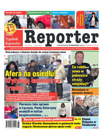 01_okl Olawa 15_Layout 1 4/3/13 1:52 PM Strona 1 str. 6 Kryzys w powiecie str. 7 str. 4 telewidz1 ISSN 2081-5360 DATA WYDANIA: 8.04.2013 numer 15 (147) PROGRAM TELEWIZYJNY 12.04.–18.04.2013 Policja zastęPcza Pon | 20.00 POLSAT matrix czw | 22.30 TVN AGNIESZKA DYGANT W miłosnym pacie s.4 „prawo agaty” wt | 21.30 TVN fot. TVN Odszkodowanie za muldę Razem z Reporterem Program TV 8 KWIETNIA Karetka do2013 pijaka Nowy Tygodnik Regionalny seriale powrót doktora Hannibala lectera s. 5 familijny str. 11 SzaleńStwa młodego naukowca „klopSiki i inne zjawiSka pogodowe” sob | 20.05 POLSAT % VAT Nowy Tygodnik Regionalny w tym 8 ISSN 2299-3703 nr indeksu 286311 Poniedziałek, 8 KWIETNIA 2013 • numer 31/2013 Łęczyca • Grabów • Piątek • Góra Św. Małgorzaty • Daszyna • Świnice Warckie • Witonia Pod jednym z bloków doszło do ostrej wymiany zdań Afera na osiedlu! Krytykują burmistrza i radną kańcy z osiedla przy W obecności naszego reportera mieszejską. Dostało się też ul. Dworcowej skrytykowali radną mipod blokiem była tak głośna, burmistrzowi. Emocjonalna dyskusjace przyjechała też policja. że ludzie wyglądali z okien. Na miejs Co robiła sowa w jednostce straży miejskiej? Awantura w sprawie śmieci Pierwsza taka sprawa w Łęczycy. Panią Katarzynę wsadzili w kaftan bezpieczeństwa... str.2 66 str. 5 Życie zawdzięcza policjantom str.7 Dzień Świnice Warckie: Bezmyślność w gminnych wodo- Palanta w Grabowie ciągach. Niestrzeżone główne ujęcie wody str. 5 str. 12 str. 13 2 Nowy Tygodnik Regionalny Po wielu miesiącach jest wyrok. Ale to nie koniec 8 KWIETNIA 2013 Nietypowa sprawa. Nasza-klasa na wokandzie ŁĘCZYCA To była pierwsza taka sprawa w miejscowym sądzie. Katarzyna Kwiatkowska została obrażona i poniżona wulgarnymi wpisami i zmontowanymi zdjęciami na portalu społecznościowym Nasza-klasa. Zdaniem sądu sprawcami są sąsiedzi pani Katarzyny (matka wraz z synem), którzy otrzymali wyrok 4 miesięcy więzienia w zawieszeniu na 2 lata. Pierwsze obraźliwe komentarze i poniżające zdjęcia Katarzyny Kwiatkowskiej zostały opublikowane w internecie w połowie 2011 roku. - To był dla mnie i moich najbliższych ogromny szok – mówi poszkodowana. - Na portalu społecznościowym Nasza-klasa sfałszowana została moja strona. Zdjęcia z tej prawdziwej strony zostały skopiowane na stronę sfabrykowaną i zmontowane. Byłam na przykład pokazana w kaftanie bezpieczeństwa, na innym zdjęciu nie miałam zębów, a jeszcze na kolejnym byłam skąpo ubrana. Pod zdjęciami widniały obraźliwe teksty na mój temat. Przez to wszystko załamałam się. Musiałam brać leki antydepresyjne a moje dzieci wstydziły się chodzić do szkoły. Jedno z podrobionych zdjęć. Pani Katarzyna w kaftanie bezpieczeństwa Katarzyna Kwiatkowska do dziś nie może zapomnieć o podrobionej stronie w internecie. Jak nam powiedziała od samego początku podejrzewała swoich sąsiadów. - Doszło m iędzy nam i do sprzeczki. Pani Marzena nie oddawała mi pieniędzy za sprzedane kosmetyki. Zaczęły się kłótnie a później na Naszej-klasie pojawiły się te zdjęcia i niewybredne wpisy. Od razu skojarzyłam te sprawy. Moją opinię potwierdził sąd. Jak się dowiedzieliśmy, oprócz zawieszonej kary więzienia, sąsiedzi otrzymali również dozór kuratora oraz po tysiąc złotych nawiązki na rzecz poszkodowanej. Matka wraz z synem nie zgadzają się z wyrokiem. - To nie my zmontowaliśmy te zdjęcia w internecie. Wulgarne wpisy też nie są naszego autorstwa – mówi Marzena L. (nazwisko do wiadomości red.). - W naszym domu przyjmujemy sporo gości. Widocznie ktoś z zewnątrz na naszym komputerze postanowił sfałszować stronę sąsiadki. Ma dużo wrogów. To konfliktowa osoba. Oczywiście od wyroku już się odwołaliśmy. Sprawa trafi do łódzkiego sądu. Pani Katarzyna – jak nam powiedziała – chciałaby jak najszybciej zapomnieć o tej nieprzyjemnej historii. To jednak nie będzie takie proste. (stop) Katarzyna Kwiatkowska, pomimo traumatycznych przeżyć, nadal ma konto na NK Otwarcie Biedronki. Kierowcy, spodziewajcie się sporych utrudnień ŁĘCZYCA Jutro (9 kwietnia) od godziny siódmej można wybrać się na zakupy do nowej Biedronki przy krajowej „jedynce”. Już teraz wiadomo, że zmotoryzowani klienci mogą spodziewać się dużych utrudnień. Droga dojazdowa do marketu jest zbyt wąska. A stojące po bokach samochody skutecznie utrudniają jazdę. Prawdziwą gehennę przeżywają kierowcy samochodów dostawczych, którzy po dostawie towaru próbują wyjechać na krajówkę. W ubiegłym tygodniu byliśmy świadkami, jak przez dobrych kilka minut potężna ciężarówka nie mo- Kierowca ciężarówki miał ogromne problemy z wyjazdem z parkingu marketu gła wyjechać z parkingu Biedronki na drogę przed urzędem pracy prowadzącą na krajową „jedynkę”. To dopiero początek. Aut wcale nie było jeszcze tak dużo. - Droga wyjazdowa z Biedronki na krajówkę nie powinna przebiegać przed pośredniakiem – mówi Tadeusz Karlikowski, którego spotkaliśmy na miejscu. - Ale widocznie market nie uzyskał pozwolenia na inny przebieg tej drogi. Biedronka została wybudowana, ale wcześniej nikt nie pomyślał o kierowcach. Tomasz Mikołajczyk, kierownik nowej Biedronki, o utrudnieniach dla zmotoryzowanych nie chciał rozmawiać. Zachwalał asortyment marketu i zapraszał na wielkie otwarcie. - Klienci mogą liczyć na duże promocje. Biedronka będzie czynna od godz. 7 do 21. (stop) 8 KWIETNIA 2013 Na osiedlu ludzie dali upust swoim emocjom Nowy Tygodnik Regionalny 3 Woda zalewa blok, piwnice i garaże Władze nic nie robią – twierdzą mieszkańcy ŁĘCZYCA Potężne rozlewisko spędza sen z oczu lokatorom bloku przy ul. Dworcowej 5d. Lokatorzy są zdania, że pomimo wielu pism, telefonów i próśb, w łęczyckim magistracie w ogóle nie przejmują problemami zwykłych ludzi. Mieszkańcy nie wytrzymali. Zaprosili naszego dz
