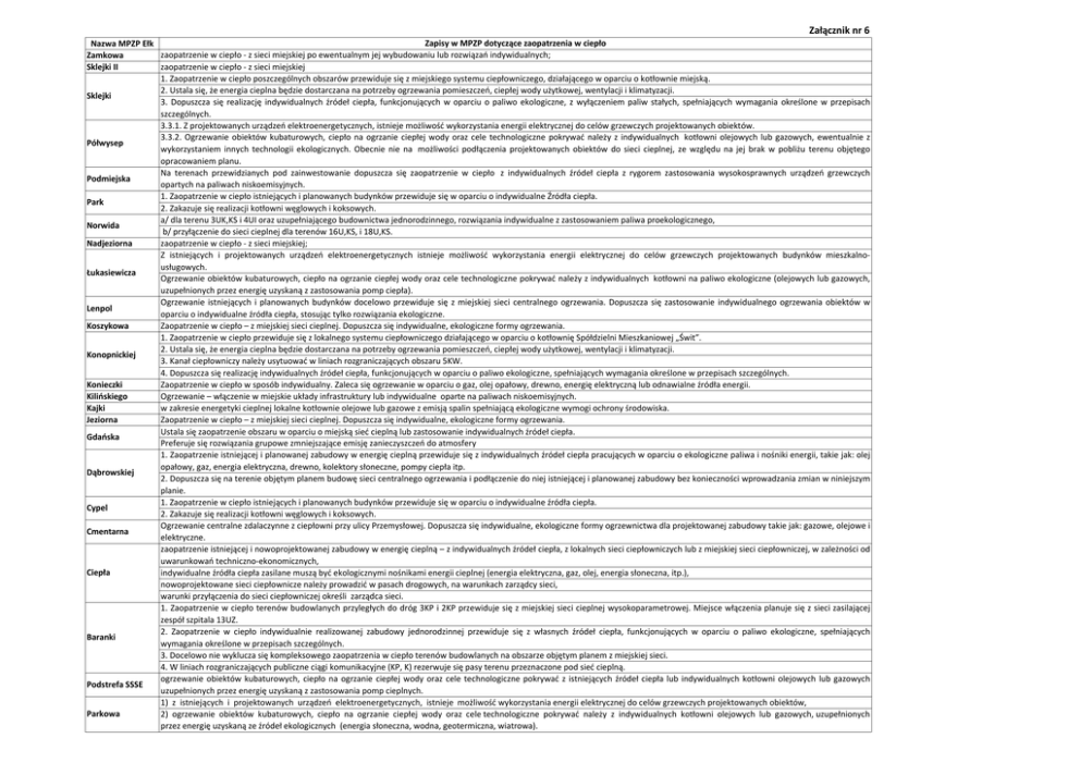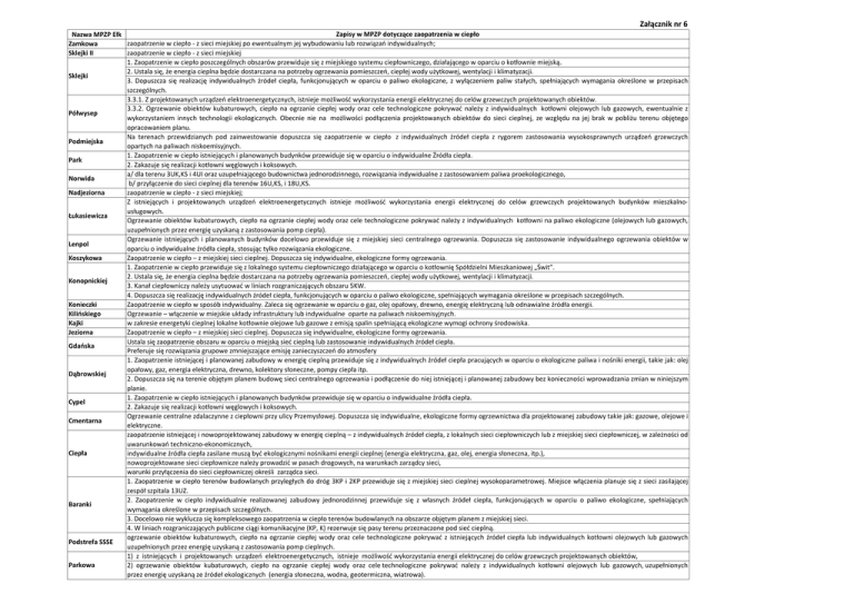 Załącznik nr 6 Zapisy w MPZP dotyczące zaopatrzenia w ciepło Nazwa MPZP Ełk zaopatrzenie w ciepło - z sieci miejskiej po ewentualnym jej wybudowaniu lub rozwiązań indywidualnych; Zamkowa zaopatrzenie w ciepło - z sieci miejskiej Sklejki II 1. Zaopatrzenie w ciepło poszczególnych obszarów przewiduje się z miejskiego systemu ciepłowniczego, działającego w oparciu o kotłownie miejską. 2. Ustala się, że energia cieplna będzie dostarczana na potrzeby ogrzewania pomieszczeń, ciepłej wody użytkowej, wentylacji i klimatyzacji. Sklejki 3. Dopuszcza się realizację indywidualnych źródeł ciepła, funkcjonujących w oparciu o paliwo ekologiczne, z wyłączeniem paliw stałych, spełniających wymagania określone w przepisach szczególnych. 3.3.1. Z projektowanych urządzeń elektroenergetycznych, istnieje możliwość wykorzystania energii elektrycznej do celów grzewczych projektowanych obiektów. 3.3.2. Ogrzewanie obiektów kubaturowych, ciepło na ogrzanie ciepłej wody oraz cele technologiczne pokrywać należy z indywidualnych kotłowni olejowych lub gazowych, ewentualnie z Półwysep wykorzystaniem innych technologii ekologicznych. Obecnie nie na możliwości podłączenia projektowanych obiektów do sieci cieplnej, ze względu na jej brak w pobliżu terenu objętego opracowaniem planu. Na terenach przewidzianych pod zainwestowanie dopuszcza się zaopatrzenie w ciepło z indywidualnych źródeł ciepła z rygorem zastosowania wysokosprawnych urządzeń grzewczych Podmiejska opartych na paliwach niskoemisyjnych. 1. Zaopatrzenie w ciepło istniejących i planowanych budynków przewiduje się w oparciu o indywidualne Źródła ciepła. Park 2. Zakazuje się realizacji kotłowni węglowych i koksowych. a/ dla terenu 3UK,KS i 4UI oraz uzupełniającego budownictwa jednorodzinnego, rozwiązania indywidualne z zastosowaniem paliwa proekologicznego, Norwida b/ przyłączenie do sieci cieplnej dla terenów 16U,KS, i 18U,KS. zaopatrzenie w ciepło - z sieci miejskiej; Nadjeziorna Z istniejących i projektowanych urządzeń elektroenergetycznych istnieje możliwość wykorzystania energii elektrycznej do celów grzewczych projektowanych budynków mieszkalnousługowych. Łukasiewicza Ogrzewanie obiektów kubaturowych, ciepło na ogrzanie ciepłej wody oraz cele technologiczne pokrywać należy z indywidualnych kotłowni na paliwo ekologiczne (olejowych lub gazowych, uzupełnionych przez energię uzyskaną z zastosowania pomp ciepła). Ogrzewanie istniejących i planowanych budynków docelowo przewiduje się z miejskiej sieci centralnego ogrzewania. Dopuszcza się zastosowanie indywidualnego ogrzewania obiektów w Lenpol oparciu o indywidualne źródła ciepła, stosując tylko rozwiązania ekologiczne. Zaopatrzenie w ciepło – z miejskiej sieci cieplnej. Dopuszcza się indywidualne, ekologiczne formy ogrzewania. Koszykowa 1. Zaopatrzenie w ciepło przewiduje się z lokalnego systemu ciepłowniczego działającego w oparciu o kotłownię Spółdzielni Mieszkaniowej „Świt”. 2. Ustala się, że energia cieplna będzie dostarczana na potrzeby ogrzewania pomieszczeń, ciepłej wody użytkowej, wentylacji i klimatyzacji. Konopnickiej 3. Kanał ciepłowniczy należy usytuować w liniach rozgraniczających obszaru 5KW. 4. Dopuszcza się realizację indywidualnych źródeł ciepła, funkcjonujących w oparciu o paliwo ekologiczne, spełniających wymagania określone w przepisach szczególnych. Zaopatrzenie w ciepło w sposób indywidualny. Zaleca się ogrzewanie w oparciu o gaz, olej opałowy, drewno, energię elektryczną lub odnawialne źródła energii. Konieczki Ogrzewanie – włączenie w miejskie układy infrastruktury lub indywidualne oparte na paliwach niskoemisyjnych. Kilińskiego w zakresie energetyki cieplnej lokalne kotłownie olejowe lub gazowe z emisją spalin spełniającą ekologiczne wymogi ochrony środowiska. Kajki Zaopatrzenie w ciepło – z miejskiej sieci cieplnej. Dopuszcza się indywidualne, ekologiczne formy ogrzewania. Jeziorna Ustala się zaopatrzenie obszaru w oparciu o miejską sieć cieplną lub zastosowanie indywidualnych źródeł ciepła. Gdańska Preferuje się rozwiązania grupowe zmniejszające emisję zanieczyszczeń do atmosfery 1. Zaopatrzenie istniejącej i planowanej zabudowy w energię cieplną przewiduje się z indywidualnych źródeł ciepła pracujących w oparciu o ekologiczne paliwa i nośniki energii, takie jak: olej opałowy, gaz, energia elektryczna, drewno, kolektory słoneczne, pompy ciepła itp. Dąbrowskiej 2. Dopuszcza się na terenie objętym planem budowę sieci centralnego ogrzewania i podłączenie do niej istniejącej i planowanej zabudowy bez konieczności wprowadzania zmian w niniejszym planie. 1. Zaopatrzenie w ciepło istniejących i planowanych budynków przewiduje się w oparciu o indywidualne źródła ciepła. Cypel 2. Zakazuje się realizacji kotłowni węglowych i koksowych. Ogrzewanie centralne zdalaczynne z ciepłowni przy ulicy Przemysłowej. Dopuszcza się indywidualne, ekologiczne formy ogrzewnictwa dla projektowanej zabudowy takie jak: gazowe, olejowe i Cmentarna elektryczne. zaopatrzenie istniejącej i nowoprojektowanej zabudowy w energię cieplną – z indywidualnych źródeł ciepła, z lokalnych sieci ciepłowniczych lub z miejskiej sieci ciepłowniczej, w zależności od uwarunkowań techniczno-ekonomicznych, Ciepła indywidualne źródła ciepła zasilane muszą być ekologicznymi nośnikami energii cieplnej (energia elektryczna, gaz, olej, energia słoneczna, itp.), nowoprojektowane sieci ciepłownicze należy prowadzić w pasach drogowych, na warunkach zarządcy sieci, warunki przyłączenia do sieci ciepłowniczej określi zarządca sieci. 1. Zaopatrzenie w ciepło terenów budowlanych przyległych do dróg 3KP i 2KP przewiduje się z miejskiej sieci cieplnej wysokoparametrowej. Miejsce włączenia planuje się z sieci zasilającej zespół szpitala 13UZ. 2. Zaopatrzenie w ciepło indywidual