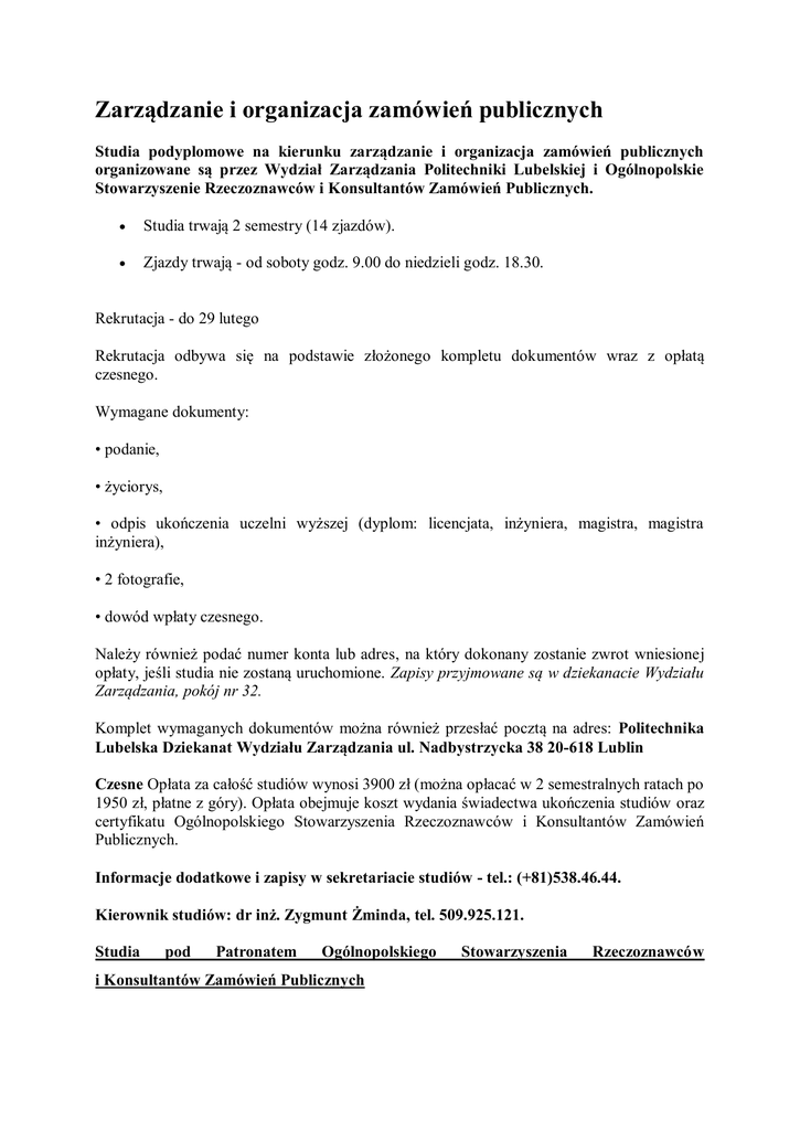 Zarządzanie i organizacja zamówień publicznych Studia podyplomowe na kierunku zarządzanie i organizacja zamówień publicznych organizowane są przez Wydział Zarządzania Politechniki Lubelskiej i Ogólnopolskie Stowarzyszenie Rzeczoznawców i Konsultantów Zamówień Publicznych. Studia trwają 2 semestry (14 zjazdów). Zjazdy trwają - od soboty godz. 9.00 do niedzieli godz. 18.30. Rekrutacja - do 29 lutego Rekrutacja odbywa się na podstawie złożonego kompletu dokumentów wraz z opłatą czesnego. Wymagane dokumenty: • podanie, • życiorys, • odpis ukończenia uczelni wyższej (dyplom: licencjata, inżyniera, magistra, magistra inżyniera), • 2 fotografie, • dowód wpłaty czesnego. Należy również podać numer konta lub adres, na który dokonany zostanie zwrot wniesionej opłaty, jeśli studia nie zostaną uruchomione. Zapisy przyjmowane są w dziekanacie Wydziału Zarządzania, pokój nr 32. Komplet wymaganych dokumentów można również przesłać pocztą na adres: Politechnika Lubelska Dziekanat Wydziału Zarządzania ul. Nadbystrzycka 38 20-618 Lublin Czesne Opłata za całość studiów wynosi 3900 zł (można opłacać w 2 semestralnych ratach po 1950 zł, płatne z góry). Opłata obejmuje koszt wydania świadectwa ukończenia studiów oraz certyfikatu Ogólnopolskiego Stowarzyszenia Rzeczoznawców i Konsultantów Zamówień Publicznych. Informacje dodatkowe i zapisy w sekretariacie studiów - tel.: (+81)538.46.44. Kierownik studiów: dr inż. Zygmunt Żminda, tel. 509.925.121. Studia pod Patronatem Ogólnopolskiego i Konsultantów Zamówień Publicznych Stowarzyszenia Rzeczoznawców Czas trwania: studia są dwusemestralne i będą realizowane w trybie niestacjonarnym, a zajęcia będą odbywały się w soboty i niedziele. Program studiów obejmuje 220 godzin lekcyjnych zajęć dydaktycznych realizowanych w formie warsztatów, wykładów i seminariów. Formy zajęć: interaktywne wykłady ilustrowane prezentacjami, ćwiczenia praktyczne, studium przypadku, dyskusja. Aby studenci mogli efektywniej przygotowywać się do zajęć, wykładowcy będą mogli przed zajęciami przekazywać prezentacje lub tezy prezentacji. Pozostałe materiały dydaktyczne przekazywane będą po zajęciach. Wszyscy wykładowcy są praktykami zajmującymi się problematyką zamówień publicznych Słuchacze uzyskują prawo do: o bezpłatnych konsultacji w trakcie studiów ze wskazanymi wykładowcami, o bezpłatnych konsultacji, przez okres sześciu miesięcy po ukończeniu studiów, z wykładowcą spośród grupy wskazanych wykładowców, o bezpłatnego uczestnictwa w seminariach, konferencjach itp. organizowanych przez Ogólnopolskie Stowarzyszenie Rzeczoznawców i Konsultantów Zamówień Publicznych. Po ukończeniu studiów słuchacze otrzymują świadectwo ukończenia studiów podyplomowych oraz certyfikat Ogólnopolskiego Stowarzyszenia Rzeczoznawców i Konsultantów Zamówień Publicznych, a także słuchacze mogą ubiegać się o nadanie tytułu Rzeczoznawcy Zamówień Publicznych. Możliwości pracy Sektor państwowy i samorządowy: administracja publiczna centralna i samorządowa (m.in. ministerstwa i urzędy centralne, urzędy marszałkowskie, wojewódzkie i miejskie, starostwa, gminy oraz jednostki im podległe, wojsko, policja, straż pożarna, straż graniczna, samodzielne publiczne zakłady opieki zdrowotnej). Wszystkie wymienione instytucje są „zamawiającymi” zobowiązanymi z mocy przepisów prawa do stosowania procedur zamówień publicznych przy wydatkowaniu środków finansowych, wobec tego muszą dysponować pracownikami o odpowiedniej wiedzy i kwalifikacjach. Sektor prywatny: cały (wykazuje coraz większe zainteresowanie pozyskaniem pracowników o wysokich kwalifikacjach) chcąc pozyskać zamówienia z sektora państwowego czy samorządowego musi przestrzegać procedur zamówień publicznych. Przez pierwsze dziewięć miesięcy 2015 r. zamawiający przeprowadzili łącznie 244 353 postępowania o udzielenie zamówienia publicznego, w wyniku których wydatkowano kwotę ok. 28,929 mld zł. Przeprowadzenie tych postępowań wymagało udziału specjalistów zamówień publicznych. Wykonawcy (sektor prywatny) złożyli w tych postępowaniach ok. 733 059 ofert, angażując do tego ogromną rzeszę specjalistów zamówień publicznych. Program naszych studiów obejmuje całość zagadnień niezbędnych do wykonywania zawodu specjalisty zamówień publicznych i pełnienia samodzielnych funkcji w procesie udzielania i uzyskiwania zamówień publicznych. Zajęcia są tak opracowane, aby ściśle połączyć wymaganą wiedzę (znajomość przepisów) z umiejętnościami i praktycznym ich wykorzystaniem w zakresie zamówień klasycznych z uwzględnieniem specyfiki zamówień udzielanych przez jednostki samorządu terytorialnego. Program 1. Cele ustanowienia sytemu zamówień publicznych. 2. Zasady obowiązujące w systemie zamówień publicznych. 3. Zakres stosowania ustawy Prawo zamówień publicznych. 4. Nowe Dyrektywy Unii Europejskiej w krajowym systemie zamówień publicznych. 5. Dyscyplina finansów publicznych w zamówieniach publicznych. 6. Wyłączenia obowiązku stosowania procedur ustawy Prawo zamówień publicznych (wyłączenia podmiotowe i przedmiotowe). 7. Planowanie zamówień – do czego jest potrzebne, jak planować, jak prawidłowo dzielić zamówienia, zamówienie udzielane w częściach. 8. Tryby udzielania zamówień publicznych – co wybrać, jak przeprowadzić. 9. Szczególne procedury w udzielaniu zamówień publicznych. 10. Szacowanie wartości zamówienia – sposoby szacowania w zależności od przedmiotu zamówienia. 11. Przebieg postępowania w zależności od wybranego trybu. 12. Ogłoszenia i reguły dokonywania zmian w ogłoszeniach. 13. Specyfikacja Istotnych Warunków Zamówienia (SIWZ) – najważniejszy dokument postępowania. 14. Wyjaśnianie i zmiany SIWZ, zebranie wykonawców, złożenie ofert. podstawowy i 15. Oceny spełnian