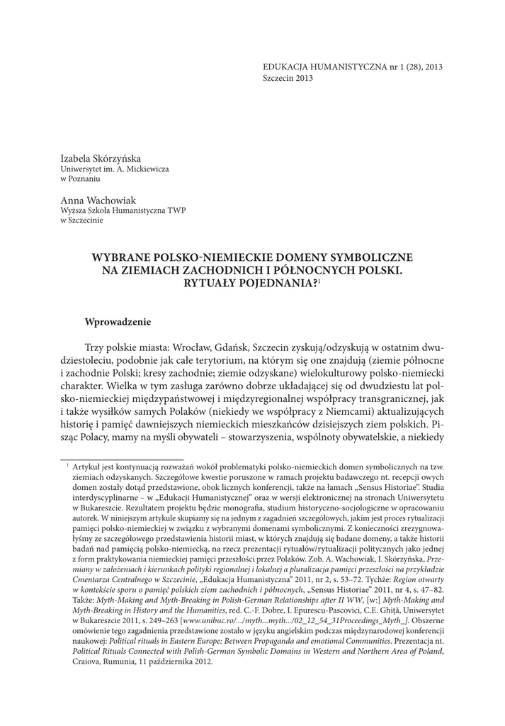 EDUKACJA HUMANISTYCZNA nr 1 (28), 2013 Szczecin 2013 Izabela Skórzyńska Uniwersytet im. A. Mickiewicza w Poznaniu Anna Wachowiak Wyższa Szkoła Humanistyczna TWP w Szczecinie WYBRANE POLSKO-NIEMIECKIE DOMENY SYMBOLICZNE NA ZIEMIACH ZACHODNICH I PÓŁNOCNYCH POLSKI. RYTUAŁY POJEDNANIA?1 Wprowadzenie Trzy polskie miasta: Wrocław, Gdańsk, Szczecin zyskują/odzyskują w ostatnim dwudziestoleciu, podobnie jak całe terytorium, na którym się one znajdują (ziemie północne i zachodnie Polski; kresy zachodnie; ziemie odzyskane) wielokulturowy polsko-niemiecki charakter. Wielka w tym zasługa zarówno dobrze układającej się od dwudziestu lat polsko-niemieckiej międzypaństwowej i międzyregionalnej współpracy transgranicznej, jak i także wysiłków samych Polaków (niekiedy we współpracy z Niemcami) aktualizujących historię i pamięć dawniejszych niemieckich mieszkańców dzisiejszych ziem polskich. Pisząc Polacy, mamy na myśli obywateli – stowarzyszenia, wspólnoty obywatelskie, a niekiedy 1 Artykuł jest kontynuacją rozważań wokół problematyki polsko-niemieckich domen symbolicznych na tzw. ziemiach odzyskanych. Szczegółowe kwestie poruszone w ramach projektu badawczego nt. recepcji owych domen zostały dotąd przedstawione, obok licznych konferencji, także na łamach „Sensus Historiae”. Studia interdyscyplinarne – w „Edukacji Humanistycznej” oraz w wersji elektronicznej na stronach Uniwersytetu w Bukareszcie. Rezultatem projektu będzie monografia, studium historyczno-socjologiczne w opracowaniu autorek. W niniejszym artykule skupiamy się na jednym z zagadnień szczegółowych, jakim jest proces rytualizacji pamięci polsko-niemieckiej w związku z wybranymi domenami symbolicznymi. Z konieczności zrezygnowałyśmy ze szczegółowego przedstawienia historii miast, w których znajdują się badane domeny, a także historii badań nad pamięcią polsko-niemiecką, na rzecz prezentacji rytuałów/rytualizacji politycznych jako jednej z form praktykowania niemieckiej pamięci przeszłości przez Polaków. Zob. A. Wachowiak, I. Skórzyńska, Przemiany w założeniach i kierunkach polityki regionalnej i lokalnej a pluralizacja pamięci przeszłości na przykładzie Cmentarza Centralnego w Szczecinie, „Edukacja Humanistyczna” 2011, nr 2, s. 53–72. Tychże: Region otwarty w kontekście sporu o pamięć polskich ziem zachodnich i północnych, „Sensus Historiae” 2011, nr 4, s. 47–82. Także: Myth-Making and Myth-Breaking in Polish-German Relationships after II WW WW, [w:] Myth-Making and Myth-Breaking in History and the Humanities, red. C.-F. Dobre, I. Epurescu-Pascovici, C.E. Ghiţă, Uniwersytet w Bukareszcie 2011, s. 249–263 [www.unibuc.ro/.../myth...myth.../02_12_54_31Proceedings_Myth_]. Obszerne omówienie tego zagadnienia przedstawione zostało w języku angielskim podczas międzynarodowej konferencji naukowej: Political rituals in Eastern Europe: Between Propaganda and emotional Communities. Prezentacja nt. Political Rituals Connected with Polish-German Symbolic Domains in Western and Northern Area of Poland, Craiova, Rumunia, 11 października 2012. 24 Izabela Skórzyńska, Anna Wachowiak także pojedyncze osoby zamieszkujące terytorium Polski i podejmujące wysiłki na rzecz aktualizacji niemieckiego dziedzictwa jako teraz także naszego/ich dziedzictwa2. Jedną ze szczególnych form aktualizacji polskiej pamięci niemieckiej w wymienionych miastach są założenia nekropolitalne i nekropolitalno-pomnikowe – tytułowe domeny symboliczne; ich odbiór społeczny badamy metodą ilościową (badania ankietowe) oraz jakościową (fokusy, analiza dyskursów publicznych). Autorem pojęcia domena symboliczna jest Lech Nijakowski. Pojęcie to odnosimy – w związku z naszymi badaniami – do konkretnych symbolicznych reprezentacji: wspomnianych założeń nekropolitalnych oraz nekropolitalno-pomnikowych, będących wizualną reprezentacją niemieckiego dziedzictwa w Polsce. Zdaniem Nijakowskiego domeny symboliczne mają dwojaką naturę3. Z jednej strony są/mogą być one wyrazem uznania obecności „obcego” we własnym krajobrazie kulturowym, z drugiej – podstawą do roszczenia „obcych”, aby odzyskać władzę nad utraconą domeną/domenami4. Ten sam autor wskazuje, że roszczenia te przybierają postać animozji o charakterze ideologicznym czy religijnym i „sprzyjają podtrzymaniu opozycji swój – obcy”5. „Można je zatem traktować jako element procesu konfliktowego”, „kształtującego i podtrzymującego „opozycje konstytutywne dla tożsamości grup jako wspólnot pamięci”6. Taki otwarty konflikt (konflikt behawioralny) wyraża się w „egzekwowaniu swoich praw na polu historii i w zakresie kontroli miejsc symbolicznych”7, w dystrybucji/redystrybucji prawa do miejsca i jego znaczeń przez różniące się od siebie grupy społeczne, co jakkolwiek nie przesądza o konflikcie na polu symbolicznym, to zarazem nie znosi różnic strukturalnych (narodowościowych, etnicznych, religijnych itd.) za tym konfliktem stojących. W koncepcji Nijakowskiego pojęcie domeny symbolicznej pojawia się w analogii do pojęcia domeny politycznej. Ta ostatnia to terytorium, nad którym dane państwo ma de facto suwerenną władzę. Analogicznie domena symboliczna to terytorium, nad którym dana grupa (etniczna, narodowa, regionalna) panuje symbolicznie8. Panowanie symboliczne oznacza tu: „przede wszystkim (intencjonalnie) rzeczy, a dopiero wtórnie wpływa na relacje społeczne – przynajmniej tak się to ludziom jawi, którzy nie dostrzegają, że za panowaniem symbolicznym skrywa się także siła, która i ich zmusza do posłuszeństwa”9. Tak więc nawet jeśli panowanie symboliczne „jawi się jedynie jako panowanie nad rzeczami”, „obiektami kultu, pomnikami, które najłatwiej stają się społecznym fetyszem”, to zarazem 2 3 4 5 6 7 8 9 Proces ten dotyczy w skali całego kraju zarówno dziedzictwa niemieckiego, j
