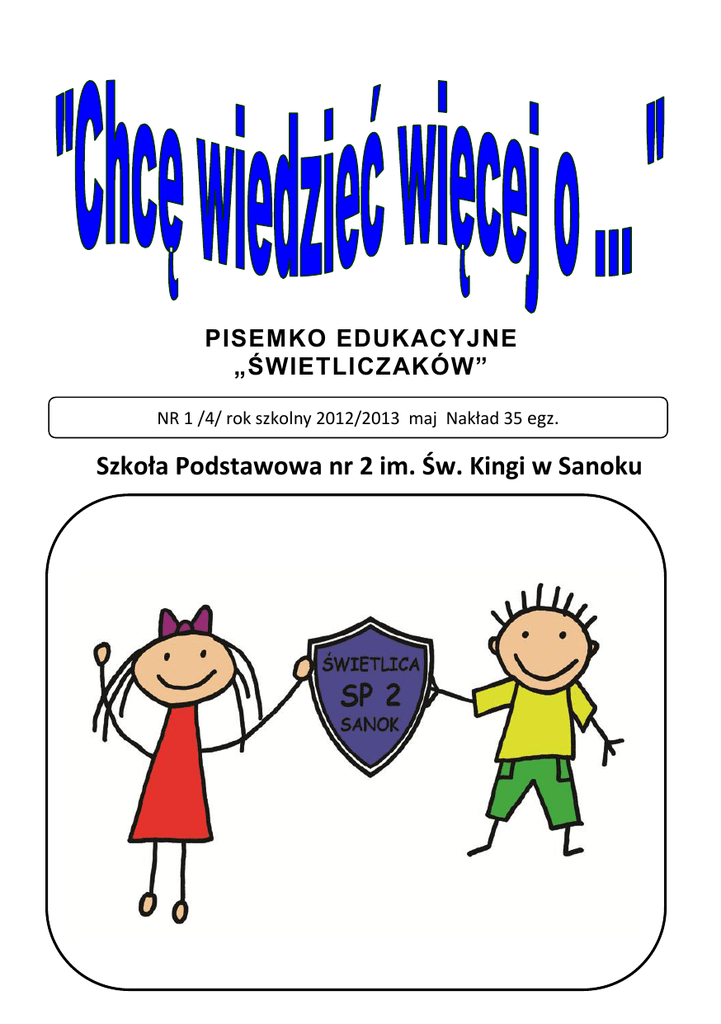 PISEMKO EDUKACYJNE „ŚWIETLICZAKÓW” NR 1 /4/ rok szkolny 2012/2013 maj Nakład 35 egz. Szkoła Podstawowa nr 2 im. Św. Kingi w Sanoku Drodzy Czytelnicy! Oddaję w Wasze ręce czwarty numer pisemka edukacyjnego, w którym prezentuję prace „świetliczaków”, powstałe w ramach cyklu zajęć „CHCĘ WIEDZIEĆ WIĘCEJ O…”. Uczniowie, po przeczytaniu wybranej przez siebie książki lub artykułu, wzbogacając swoją wiedzę z zakresu różnorodnych dziedzin, wyszukują ciekawe informacje, którymi dzielą się z innymi. Zachęcam do interesującej, a zarazem pouczającej lektury. Uwaga: W pisemku zachowałam pisownię, nazewnictwo i styl autora. Elżbieta Gruba Chcę wiedzieć więcej o… JESIENI Gdy dni stają się chłodniejsze i szybko zapada zmrok, ludzie coraz więcej czasu spędzają w domach. Kiedyś w długie jesienne wieczory gospodynie zbierały się po chatach, aby wspólnie prząść wełnę, drzeć pierze, lub szatkować kapustę. Praca szła szybciej, gdy przy niej śpiewano, albo snuto niesamowite opowieści o duchach, diabłach, czarownicach i zakopanych skarbach. Oliwia Królicka kl. 2„d” Chcę wiedzieć więcej o... OWOCACH Wiśnie to owoce o kwaskowatym smaku. Zawierają wodę, tłuszcze, węglowodany, witaminy i minerały. Można robić z nich konfitury. Gruszki to jedne z najsłodszych owoców. Zawierają dużo witamin, wzmacniają odporność i dodają energii. Jabłka to owoc o kulistym, o soczystym i chrupiącym miąższu. Zawierają witaminy i dużo błonnika. Gracja Podulka kl..2c” Chcę wiedzieć więcej o… CHOINCE Choinka to zielone drzewko. W czasie Świąt Bożego Narodzenia na tej choince zawieszamy: bombki, łańcuchy, światełka – to nieomylny znak Świąt Bożego Narodzenia. W Polsce na Święta Bożego Narodzenia nie powinno zabraknąć choinki. To Świąteczna tradycja trwa w Polsce niecałe 100 lat. Paulina Borkawska Chcę wiedzieć więcej o… BETLEJEM Betlejem w Biblii nazywane jest „Miastem Dawidowym” czyli miastem w którym urodził się król Izraela Dawid. Tam właśnie musiał udać się jego potomek Józef ze swoją ciężarną żoną Marią, aby wziąć udział w spisie ludności. W te sposób Betlejem stało się również miejscem urodzenia Jezusa. Dzisiaj pielgrzymują do niego chrześcijanie z całego świata. Bernardo Balzano kl.2„c” Chcę wiedzieć więcej o... PIERNIKACH CHOINKOWYCH Dawniej większość ozdób choinkowych robiono własnoręcznie. Robiono je z bibuły, kolorowych papierów, piórek, wydmuszek i słomy. Na gałązkach choinki zawieszano też jabłka, orzechy i pierniczki w kształcie serc. Bardzo ładnie wygląda Mikołaj zrobiony z lukru. Na choince świecono świeczki, ponieważ wierzono, że dusze zmarłych przodków przychodzą, żeby się przy nich ogrzać. Paulina Borkowska Chcę wiedzieć więcej o… FAJERWERKACH W Europie sztuczne ognie pojawiły się w XIII wieku za sprawą słynnego podróżnika i odkrywcy Marco Polo, który wrócił z wyprawy do Chin z tajemnicą ich produkcji. Wkrótce bez fajerwerków nie wyobrażano sobie urodzin króla, wyboru papieża czy parady zwycięskich wojsk. Pewnego razy Brytyjczycy dla uczczenia pokoju z Francją zaprosili włoskich pirotechników, aby przygotowali godne widowisko. Zanim rozpoczęto przedstawienie, między pirotechnikami wywiązała się bójka, część fajerwerków wybuchła przed czasem i pokaz zakończył się klapą. Zofia Grzebieniak kl. 2a” Chcę wiedzieć więcej o… TEATRZE Gdy podnosi się kurtyna, jest to znak, że zaraz rozpocznie się przedstawienie. Na widowni zapada cisza. Wszyscy wpatrują się w scenę. Właśnie tam aktorzy odegrają sztukę. Nie ma dwóch jednakowych przedstawień. Od wieków w teatrze wszystko odbywa się na oczach widzów, na żywo… W starożytności teatry były olbrzymie! Mogły pomieścić nawet do 30 tysięcy widzów. Przypominały nieco dzisiejsze stadiony. Aktorów dobrze było widać dzięki kostiumom, maskom na twarzach oraz butom na wyjątkowo wysokiej podeszwie zwanych koturnami. 400 lat temu w Anglii żył Willam Szekspir-najwybitniejszy na świecie autor sztuk teatralnych. W tamtych czasach liczyła się przede wszystkim skomplikowana intryga i szybka akcja. Szekspirowi udało się stworzyć wiele wspaniałych sztuk. Najbardziej znane z nich Remeo i Julia, Hamlet, Makbet. Dzisiaj scena za sprawą dekoracji może stać się zarówno książęcym pałacem, jak i leśną polaną. Dzisiaj znany aktor jest gwiazdą. Trudno więc uwierzyć, że w starożytności aktorami byli niewolnicy, nie powodziło się im najlepiej, czasem brano ich za żebraków. Często kilku aktorów łączyło się w grupę tworząc grupę teatralną. Wędrowali z miasta do miasta pokazując swoje przedstawienia. W danych czasach. W role żeńskie wcielali się młodzi mężczyźni. Gdy wydało się, że w teatrze gra kobieta, wybuchał skandal. Jak widać na przestrzeni wieków teatr przeszedł ogromną ewolucję. Bulczyńska Sandra kl.2a Chcę wiedzieć więcej o… DRZEWIE RODZINNYM Drzewo rodzinne, czyli genealogiczne to rysunek, który przedstawia historię rodziny. Rysunek przedstawiający dzieje jakiejś rodziny naprawdę wygląda jak drzewo. Mama i tata to grube konary, a wy jesteście cienkimi gałązkami. Drzewa genealogiczne tworzą ci, którzy są ciekawi, kim byli ich przodkowie. Karina Piecuch kl.2 a Chcę wiedzieć więcej I KRÓLOWYCH. o… WSPÓŁCZESNYCH KRÓLACH Współcześni królowie, w odróżnieniu od swoich przodków, a także władców baśni, rzadko noszą korony i rządzą państwami. Elżbieta jest królową aż 15 państw (poza Wielką Brytanią m.in. Australii, Kanady, Jamajki i Bachamów). Słynna ze swojej odwagi królowa obawia się jedynie o zdrowie swoich psów rasy corgie (czytaj: korgi) Jej pupile noszą np. specjalne buty, by nie uszkodzić sobie łap przy pałacu Buckingham (czytaj: Bakingam). Harold, król wręczający Pokojową Nagrodę Nobla, aż 9 lat czekał, aby 