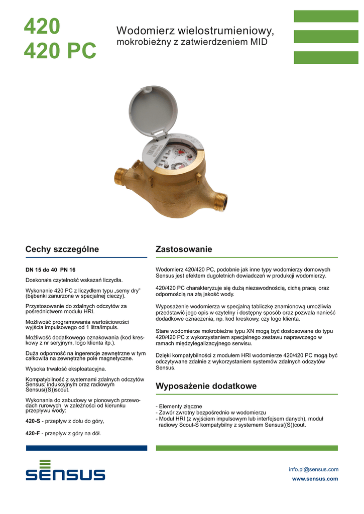 420 420 PC Wodomierz wielostrumieniowy, mokrobieżny z zatwierdzeniem MID Cechy szczególne Zastosowanie DN 15 do 40 PN 16 Wodomierz 420/420 PC, podobnie jak inne typy wodomierzy domowych Sensus jest efektem dugoletnich dowiadczeń w produkcji wodomierzy. Doskonała czytelność wskazań liczydła. Wykonanie 420 PC z liczydłem typu „semy dry” (bębenki zanurzone w specjalnej cieczy). 420/420 PC charakteryzuje się dużą niezawodnością, cichą pracą oraz odpornością na złą jakość wody. Przystosowanie do zdalnych odczytów za pośrednictwem modułu HRI. Wyposażenie wodomierza w specjalną tabliczkę znamionową umożliwia przedstawić jego opis w czytelny i dostępny sposób oraz pozwala nanieść dodadkowe oznaczenia, np. kod kreskowy, czy logo klienta. Możliwość programowania wartościowości wyjścia impulsowego od 1 litra/impuls. Możliwość dodatkowego oznakowania (kod kreskowy z nr seryjnym, logo klienta itp.). Duża odporność na ingerencje zewnętrzne w tym całkowita na zewnętrzne pole magnetyczne. Stare wodomierze mokrobieżne typu XN mogą być dostosowane do typu 420/420 PC z wykorzystaniem specjalnego zestawu naprawczego w ramach międzylegalizacyjnego serwisu. Wysoka trwałość eksploatacyjna. Dzięki kompatybilności z modułem HRI wodomierze 420/420 PC mogą być odczytywane zdalnie z wykorzystaniem systemów zdalnych odczytów Sensus. Kompatybilność z systemami zdalnych odczytów Sensus: indukcyjnym oraz radiowym Sensus((S))scout. Wyposażenie dodatkowe Wykonania do zabudowy w pionowych przewodach rurowych w zależności od kierunku przepływu wody: 420-S - przepływ z dołu do góry, - Elementy złączne - Zawór zwrotny bezpośrednio w wodomierzu - Moduł HRI (z wyjściem impulsowym lub interfejsem danych), moduł radiowy Scout-S kompatybilny z systemem Sensus((S))cout. 420-F - przepływ z góry na dół. [email protected] www.sensus.com Dokładność Typowy wykres błędów Osłona wykonana z wysokiej jakości mosiądzu oraz szyba liczydła z poliwęglanu o dużej grubości gwarantują odporność wodomierzy 420 na korozję, uderzenia hydrodynamiczne, wysokie ciśnienie oraz podwyższoną temperaturę wody. Q2 Q3 Q4 Strumień objętości [m3/h] 40 DN 32 DN 25 DN 20 Typowy wykres straty ciśnienia 15 Liczydło Q1 Strata ciśnienia [bar] Elementy wewnętrzne wykonane są z wysokiej jakości tworzyw sztucznych. Rozwiązania konstrukcyjne poszczególnych zespołów i częśći gwarantują zachowanie parametrów technicznych wodomierza, np: - w celu zwiększenia trwałości czop wirnika wyposażono w kamień techniczny, - zastosowano podwójną filtrację docierającej do komory pomiarowej wody: sito w kanale wlotowym i sito na obwodzie komory pomiarowej. R=80 DN Niezawodność R=160 DN Bezpośrednia transmisja obrotów wirnika do liczydła gwarantuje wysoką czułość w zakresie najmniejszych przepływów. Błąd [%] Zrównoważony rozkład strumienia objętości powoduje niewielkie obciążenia wirnika. . Duże czarne cyfry bębenków (5mm) na białym tle umożliwiają odczyt m3 z odległości ponad 1 m. Przy pomocy wskaźników mozna odczytać z tarczy liczydła podwielokrotność m3.. W celu ograniczenia kondensacji zanieczyszczeń w wykonaniu 420 PC bębenki odseparowano od przepływającej wody poprzez umieszczając je w kapsule ze specjalną cieczą. 1,5 2,5 3,5 6 10 Strumień objętości [m3/h] Liczydło chronione jest bardzo grubą szybą z poliwęglanu wytrzymującą wysokie ciśnienie oraz Zabezpieczenie przed ingerencjami zewnętrznymi Wodomierz 420/420 PC cechuje bardzo wysoki poziom ochrony przed ingerencjami zewnętrznymi: - całkowita odporność przed zewnętrznym polem magnetycznym (brak sprzęgła magnetycznego), - uniemożliwienie mechanicznego zatrzymania dzięki wykonaniu osłony z mosiądzu oraz grubej (8mm) szybie liczydła z poliwęglanu. LD 1170 PL Strona 2 Zgodnsość Dane techniczne Ciągły strum. obj. Wodomierze 420PC są zgodne z: Średnica nominalna - PN-ISO 4064 DN Zatwierdzenie typu SK 08-MI001-SMU/003 Q3 = 2,5; 4; 6,3; 10; 16 Wykonanie DN 20 Q3 2,5, L=165 G1 oraz wszystkie wielkości 420-S (F) dostępne tylko z R=80. 10 16 15, 20 25, 32 25, 32 40 całkowicie mokrobieżne Działka elementarna dm3 0,05 Maksymalne dopuszczalne ciśnienie robocze [MAP] bar 16 Roboczy zakres ciśnień bar 0,3 do 16 Strata ciśnienia Δp bar 0,63 Klasa temperaturowa [MAT] O 3 C T 50 Klasa odporności na zaburzenia przepływu - U0, D0 Pozycja zbudowy - pozioma (H) Klimatyczne i mechaniczne warunki otoczenia - -10OC do 55OC, klasa M2 Otoczenie elektromagnetyczne - klasa E1 Zakres pomiarowy R Q3/Q1 - 80 / 160 (błąd w zakresie ±5) 3,125 5 7,875 12,5 20 Q1 l/h 31 / 16 50 / 25 79 / 39 125 / 63 200/100 Q2 l/h 50 / 25 80 / 40 126 /63 200/100 320/160 (błąd w zakresie ±2) Współczynnik m3/h Q4 Pośredni strum. obj. Pełne oznaczenie wodomierza: nazwa producenta, typ wodomierza, klasa metrologiczna, znak i numer zatwierdzenia typu EEC oraz data produkcji i numer seryjny są trwale naniesione na specjalnej tarczy znamionowej mocowanej trwale na zespole głowicy. 6,3 105 Minimalny strum. obj. Kierunek przepływu wody zaznaczony jest na korpusie w postaci dwóch strzałek. 4 15, 20 25 m Przeciąż. strum. obj. Oznakowanie 2,5 - Zakres wskazań liczydła - wymaganiami Dyrektywy UE nr 75/33. Q2/Q1 1,6 - Wymiary i masa 420 / 420 PC Rysunek z wymiarami *) mm mm Średnica nominalna Długość Szerokość Wysokość całkowita DN L B H Wysokość całkowita z modułem HRI Wysokość od podstawy do osi rurociągu Gwint króćca osłony H1 mm mm mm 25 **) 260 32 260 120 20 190 *) 96 120 103 135 103 135 40 300 134 152 150 150 165 165 182 61 15 165 96 H mm 34 36,5 45 45 cale cale kg G¾ G1 G1 ¼ G1 ½ G2 Gwint elementów złącznych Masa G1 ¼ 2,5 G1 ½ 5 dostępna długość 165mm Średnica nominalna 420/420 PC **) cale cale H (H1) H1 420-S (F) Masa (bez el. złącznych) G½ 1,4 G¾ 1,6 G1 2,3 dostępna długość 175mm DN mm (Qn) m3/h Wymiary 420/420 P