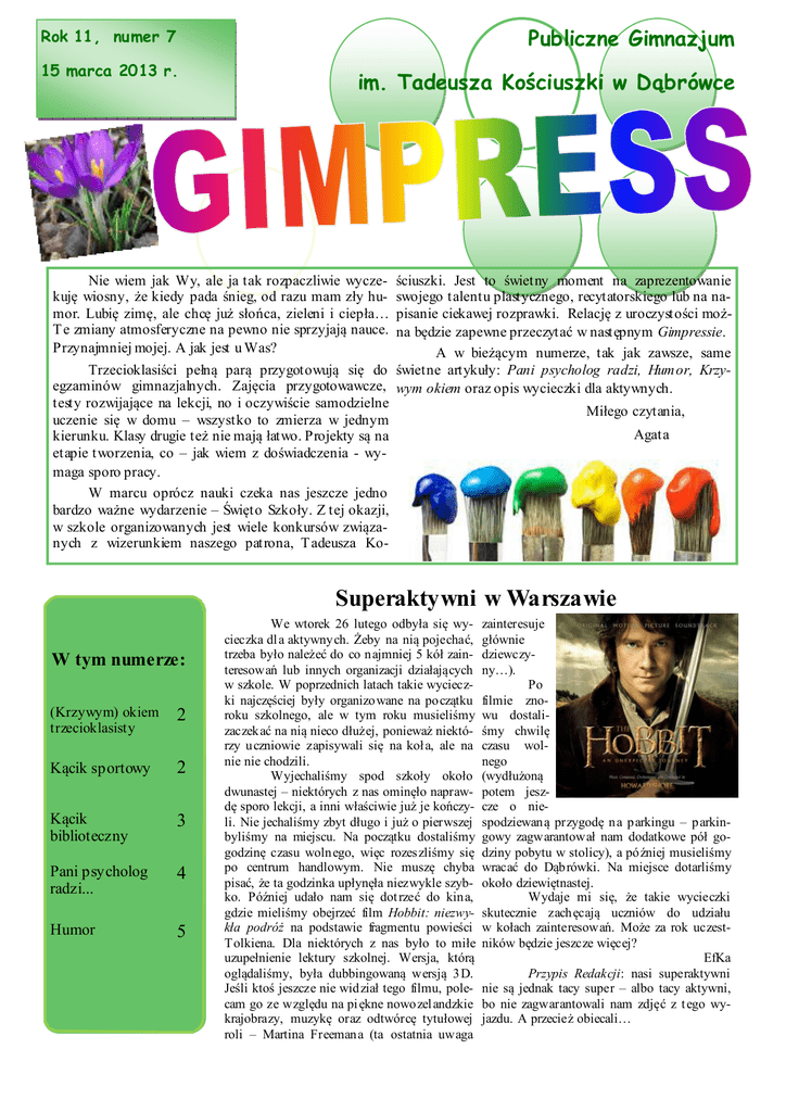 Publiczne Gimnazjum Rok 11, numer 7 15 marca 2013 r. im. Tadeusza Kościuszki w Dąbrówce Nie wiem jak Wy, ale ja tak rozpaczliwie wyczekuję wiosny, że kiedy pada śnieg, od razu mam zły humor. Lubię zimę, ale chcę już słońca, zieleni i ciepła… T e zmiany atmosferyczne na pewno nie sprzyjają nauce. Przynajmniej mojej. A jak jest u Was? ściuszki. Jest to świetny moment na zaprezentowanie swojego talentu plastycznego, recytatorskiego lub na napisanie ciekawej rozprawki. Relację z uroczystości można będzie zapewne przeczytać w następnym Gimpressie. A w bieżącym numerze, tak jak zawsze, same Trzecioklasiści pełną parą przygotowują się do świetne artykuły: Pani psycholog radzi, Humor, Krzyegzaminów gimnazjalnych. Zajęcia przygotowawcze, wym okiem oraz opis wycieczki dla aktywnych. testy rozwijające na lekcji, no i oczywiście samodzielne Miłego czytania, uczenie się w domu – wszystko to zmierza w jednym Agata kierunku. Klasy drugie też nie mają łatwo. Projekty są na etapie tworzenia, co – jak wiem z doświadczenia - wymaga sporo pracy. W marcu oprócz nauki czeka nas jeszcze jedno bardzo ważne wydarzenie – Święto Szkoły. Z tej okazji, w szkole organizowanych jest wiele konkursów związanych z wizerunkiem naszego patrona, T adeusza Ko- Superaktywni w Warszawie W tym numerze: (Krzywym) okiem trzecioklasisty 2 Kącik sportowy 2 Kącik biblioteczny 3 Pani psycholog radzi... 4 Humor 5 We wtorek 26 lutego odbyła się wycieczka dl a aktywnych. Żeby na nią pojechać, trzeba było należeć do co najmniej 5 kół zainteresowań lub innych organizacji działających w szkole. W poprzednich latach takie wycieczki najczęściej były organizowane na początku roku szkolnego, ale w tym roku musieliśmy zaczekać na nią nieco dłużej, ponieważ niektórzy uczniowie zapisywali się na koł a, ale na nie nie chodzili. Wyjechaliśmy spod szkoły około dwunastej – niektórych z nas ominęło naprawdę sporo lekcji, a inni właściwie już je kończyli. Nie jechaliśmy zbyt długo i już o pierwszej byliśmy na miejscu. Na początku dostaliśmy godzinę czasu wolnego, więc rozes zliśmy się po centrum handlowym. Nie muszę chyba pisać, że ta godzinka upłynęła niezwykle szybko. Później udało nam się dot rzeć do kina, gdzie mieliśmy obejrzeć film Hobbit: niezwykła podróż na podstawie fragmentu powieści Tolkiena. Dla niektórych z nas było to miłe uzupełnienie lektury szkolnej. Wersja, którą oglądaliśmy, była dubbingowaną wersją 3D. Jeśli ktoś jeszcze nie widział tego filmu, polecam go ze względu na pi ękne nowozel andzkie krajobrazy, muzykę oraz odtwórcę tytułowej roli – Martina Freemana (ta ostatnia uwaga zainteresuje głównie dziewczyny…). Po filmie znowu dostaliśmy chwilę czasu wolnego (wydłużoną potem jeszcze o niespodziewaną przygodę na parkingu – parkingowy zagwarantował nam dodatkowe pół godziny pobytu w stolicy), a później musieliśmy wracać do Dąbrówki. Na miejsce dotarliśmy około dziewiętnastej. Wydaje mi się, że takie wycieczki skutecznie zachęcają uczniów do udziału w kołach zainteresowań. Może za rok uczestników będzie jeszcze więcej? EfKa Przypis Redakcji: nasi superaktywni nie są jednak tacy super – albo tacy aktywni, bo nie zagwarantowali nam zdjęć z t ego wyjazdu. A przecież obiecali… IO KL ASIS TY C E Z R T M IE K O ) M Y (KR ZYW Witam Was wyjątkowo serdecznie, Robaczki. Chyba zaczyna się wiosna – śnieg stopniał i jest podej rzani e widno. Nie, nie jestem z tego powodu zadowolona, bo wiosny wyjątkowo nie lubię. Najpiękniejszą porą roku jest listopad i nic mojej opinii na ten temat nie zmieni. Lato mogłoby nie istnieć… Tym razem dla odmiany zacznę od środka i trochę się z Was pośmieję (nie będę ukrywać, że to moja ulubiona część tych artykułów). Na początek kwestia moich ukochanych glonojadów, które - z powodu pewnych przetasowań w życiu rom ansowym w naszej szkol e – powracają ze zdwojoną siłą. Na wiosnę to… się bardziej rzuca w oczy (szczególnie osobnikom typu foreverus aloneus). A w ogóle to mi się „Ale tak z drugiej wydaje, że takie rzeczy się załatwia po lekcjach. A, wrócę j eszcze do strony To, że lubię wulgaryzmów… Nie wzięliście soludzi, wcale nie zna- bie do serca moich wrednych uwag. Jak piszeci e wypracowania, nie staczy, że lubię cię za to, wiacie nawet połowy znaków interpunkcyjnych, a w rozmowi e… Zakim jesteś” działam drastycznie – wyobraźcie sobie, ze zamiast każdego użytego przeze mnie znaczka, widzicie mało cenzuralne słowo. Przyjemnie? Trzecia sprawa, której nie mogę sobie darować… DRZWI. Tak, ten kontur naszkicowany na ścianie w podziemiach. One chyba s ą… chłopcem. Powiem tak – panowie, jeśli chcecie oglądać narządy, nie każci e na ni e patrzeć wszystkim korzystającym z szatni, tylko popatrzcie na własne albo znajdźcie sobie odpowiednie obrazki w Internecie, w którym – jak powszechni e wiadomo – można znal eźć dokł adnie wszystko. Poza tym obrazek narysowany przez jakiegoś geniusza anatomicznego był wyjątkowo marnej jakości. Chłopak powinien mocno kreskę poćwiczyć. Geniusz j ęzykowy t eż się znalazł… Wiecie co? Tracę wi arę w ludzi. Ktoś się stara, robi projekt, rysuje na ściani e i t ak dal ej, a pot em przychodzi jeden z dru- gim i rysują… narząd na pół obrazka. Cóż, każdy chce się po(d) pisać jak potrafi, prawda? Proponuję osobie, która jest tak wielkim fanem… ekhm, ekhm… żeby strzeliła sobie coś t akiego na ścianie w pokoju. Właśnie… dlaczego z reguły to panowie rysują takie rzeczy…? W Ziołowym Kąciku Muzycznym przedstawiam piosenkę Jesus of Suburbia zespołu Green Day (ostatnio mam na nich fazę…). Długie toto, ale prześliczne. Najbardziej lubię częś ć czwartą… Dearl y Beloved, are you listening? I can’t remember a word that you were saying… - to zdanie to es