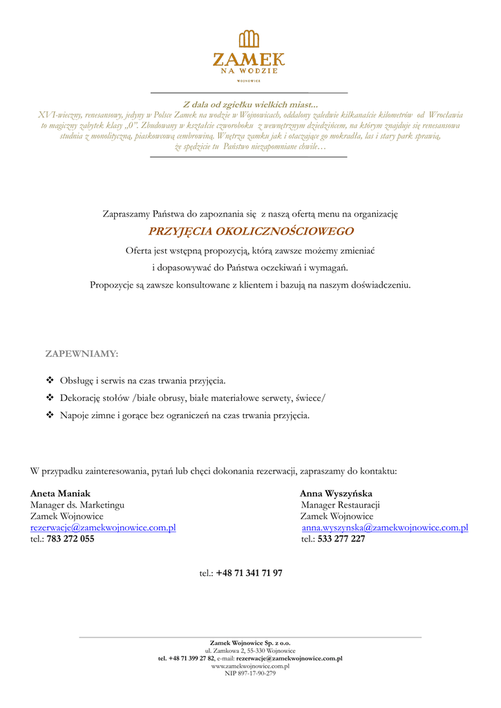 Z dala od zgiełku wielkich miast... XVI-wieczny, renesansowy, jedyny w Polsce Zamek na wodzie w Wojnowicach, oddalony zaledwie kilkanaście kilometrów od Wrocławia to magiczny zabytek klasy „0”. Zbudowany w kształcie czworoboku z wewnętrznym dziedzińcem, na którym znajduje się renesansowa studnia z monolityczną, piaskowcową cembrowiną. Wnętrza zamku jak i otaczające go mokradła, las i stary park sprawią, że spędzicie tu Państwo niezapomniane chwile… Zapraszamy Państwa do zapoznania się z naszą ofertą menu na organizację PRZYJĘCIA OKOLICZNOŚCIOWEGO Oferta jest wstępną propozycją, którą zawsze możemy zmieniać i dopasowywać do Państwa oczekiwań i wymagań. Propozycje są zawsze konsultowane z klientem i bazują na naszym doświadczeniu. ZAPEWNIAMY: Obsługę i serwis na czas trwania przyjęcia. Dekorację stołów /białe obrusy, białe materiałowe serwety, świece/ Napoje zimne i gorące bez ograniczeń na czas trwania przyjęcia. W przypadku zainteresowania, pytań lub chęci dokonania rezerwacji, zapraszamy do kontaktu: Aneta Maniak Manager ds. Marketingu Zamek Wojnowice [email protected] tel.: 783 272 055 Anna Wyszyńska Manager Restauracji Zamek Wojnowice [email protected] tel.: 533 277 227 tel.: +48 71 341 71 97 Zamek Wojnowice Sp. z o.o. ul. Zamkowa 2, 55-330 Wojnowice tel. +48 71 399 27 82, e-mail: [email protected] www.zamekwojnowice.com.pl NIP 897-17-90-279 PROPOZYCJA - 65 zł/os (do wyboru jedna propozycja) o o o o o /Dzieci do lat 7 - 50% zniżki/ ZUPA Rosół z makaronem Krem z zielonego groszku, prażony bekon, pestki dyni , bita śmietana Żurek Chłodnik Litewski Krem Veolute z białych jarzyn z serem kozim i szczypiorem (do wyboru jedna propozycja) DANIE GŁÓWNE o Polędwiczka wieprzowa , ciepła sałata Nicoas o Filet z kurczaka a’ la capresse z sałatką ziemniaczaną na ciepło, pesto, rukola, pomidor o Schab po prowansalsku z puree kalafiorowo-ziemniaczanym. Brokuł z masłem migdałowym (do wyboru jedna propozycja) DESER o Szarlotka z coulis owoców leśnych o Sernik z frużeliną wiśniową o Tarta z owocami sezonowymi Napoje dodatkowo płatne: o Dzbanek wody z cytryna i miętą (6 porcji) – 8 zł o Dzbanek soku owocowego (6 porcji) – 12 zł Zamek Wojnowice Sp. z o.o. ul. Zamkowa 2, 55-330 Wojnowice tel. +48 71 399 27 82, e-mail: [email protected] www.zamekwojnowice.com.pl NIP 897-17-90-279 PROPOZYCJA - 100 zł/os (do wyboru jedna propozycja) o o o o o /Dzieci do lat 7 - 50% zniżki/ ZUPA Consomne wołowe , kluski francuski , jarzyny julienne Krem z zielonego groszku, prażony bekon, pestki dyni , bita śmietana Żurek Krem z buraka , chrzan , ser pleśniowy Fumme z borowików (do wyboru jedna propozycja) DANIE GŁÓWNE o Eskalopki wieprzowe , pieczone warzywa, sos koperkowy o Filet z kurczaka a’ la capresse z sałatką ziemniaczaną na ciepło, pesto, rukola, pomidor o Schab po prowansalsku z puree kalafiorowo-ziemniaczanym. Brokuł z masłem migdałowym o Sznycelki z indyka, puree z marchewki, maślane kopytka, pieczona pietruszka z zimnym winegretem szczypiorkowym (do wyboru jedna propozycja) DESER o Strudel jabłkowy o Sernik z coulis owocowym o Deser szefa kuchni z owocami sezonowymi Napoje zimne i gorące bez ograniczeń na czas trwania przyjęcia Zamek Wojnowice Sp. z o.o. ul. Zamkowa 2, 55-330 Wojnowice tel. +48 71 399 27 82, e-mail: [email protected] www.zamekwojnowice.com.pl NIP 897-17-90-279 PROPOZYCJA - 125 zł/os (do wyboru jedna propozycja) /Dzieci do lat 7 - 50% zniżki/ PRZYSTAWKA o Marynowane plastry wędzonej kaczki z grillowanym bakłażanem, włoska peperonata, pieczona ciabata o Mini sałatka z sera koziego, placki tortilli z rukolą w kompozycji tajskiego sosu słodko-kwaśnego o Rostbef a’lla Rosa z tatarem jarzynowym , sos ogórkowy (do wyboru jedna propozycja) ZUPA o Consomme z borowików o Delikatny krem porowy z kaszą pęczak i parmezanem o Krem z zielonego groszku, prażony bekon, pestki dyni, bita śmietana (do wyboru jedna propozycja) DANIE GŁÓWNE o Schab z dzika marynowany w bulwach cebuli i jabłkach z emulsją z pietruszki ziemniaki poinf neaf o Polędwiczka wieprzowa pieczona z bulwami cebulki i rozmarynem, puree z pietruszki i jabłka, kremowy pęczak z parmezanem, pieczony pomidor koktajlowy, grillowana cukinia o Pave z łososia norweskiego , puree z kalafiora i kopru, pieczone cząstki batatów w majeranku i czosnku, fasolka szparagowa, sos holenderski ze szczypiorkiem. (do wyboru jedna propozycja) DESER o Suflet belgijski o Gruszka marynowana w czerwonym winie, lekki sos zabajone z odrobiną koniaku o Szarlotka na ciepło z coulinis Napoje zimne i gorące bez ograniczeń na czas trwania przyjęcia. Zamek Wojnowice Sp. z o.o. ul. Zamkowa 2, 55-330 Wojnowice tel. +48 71 399 27 82, e-mail: [email protected] www.zamekwojnowice.com.pl NIP 897-17-90-279 PROPOZYCJA - 190 zł/os (do wyboru jedna propozycja) /Dzieci do lat 7 - 50% zniżki/ PRZYSTAWKA o Confit wołowe, marynowane plastry polędwicy z grillowanym bakłażanem, włoska peperonata, pieczona ciabata o Mini sałatka z sera koziego, placki tortilli z rukolą, pieczony rostbef w kompozycji tajskiego sosu słodko-kwaśnego o Terina z łososia i białej ryby pieczone w algach, krewetka w pomidorach, roszponka, ciabata (do wyboru jedna propozycja) o o o o ZUPA Consomme z borowików Delikatny krem porowy Krem z zielonego groszku, prażony bekon, pestki dyni, bita śmietana Krem z pomidorów z sezamową diabotką (do wyboru jedna propozycja) DANIE GŁÓWNE o Udko z kaczki marynowane w kardamonie i jabłkach, duszone cebulki w balsamico, ziemniaki poinf neaf , pieczona marchewka o Polędwiczka wieprzowa pieczona z bulwami cebulki i rozmarynem, puree z pietruszki i jabłka, kremowy pęczak z parmezanem, pieczony pomidor koktajlowy, grillowana cukinia o Pieczony schab z dzika, puree z kalafiora i kopru, pieczone cząstki ziemniaka w majeranku i czosnku, fasolka szparagowa, sos holenderski ze szczypiorkiem. o Sakwa z wołowiny z borow