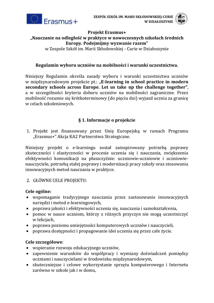 ZESPÓŁ SZKÓŁ IM. MARII SKŁODOWSKIEJ-CURIE W DZIAŁOSZYNIE Projekt Erasmus+ „Nauczanie na odległość w praktyce w nowoczesnych szkołach średnich Europy. Podejmijmy wyzwanie razem” w Zespole Szkół im. Marii Skłodowskiej - Curie w Działoszynie Regulamin wyboru uczniów na mobilności i warunki uczestnictwa. Niniejszy Regulamin określa zasady wyboru i warunki uczestnictwa uczniów w międzynarodowym projekcie pt.: „E-learning in school practice in modern secondary schools across Europe. Let us take up the challenge together”, a w szczególności kryteria doboru uczniów na mobilności zagraniczne. Przez mobilność rozumie się krótkoterminowy (do pięciu dni) wyjazd ucznia za granicę w celach szkoleniowych. § 1. Informacje o projekcie 1. Projekt jest finansowany przez Unię Europejską w ramach Programu „Erasmus+” Akcja KA2 Partnerstwa Strategiczne. Niniejszy projekt o e-learningu został zainspirowany potrzebą poprawy skuteczności i elastyczności w procesie uczenia się i nauczania, zwiększenia efektywności komunikacji na płaszczyźnie: uczniowie-uczniowie i uczniowienauczyciele, potrzebą stałej poprawy i modernizacji pracy szkoły oraz stosowania innowacyjnych metod nauczania w praktyce. 2. GŁÓWNE CELE PROJEKTU: Cele ogólne: wspomaganie tradycyjnego nauczania przez zastosowanie innowacyjnych narzędzi i metod e-learningowych, poprawa jakości i efektywności uczenia się, nauczania i samokształcenia, pomoc w nauce uczniom, którzy z różnych przyczyn nie mogą uczestniczyć w lekcjach, poprawa poziomu umiejętności komputerowych uczniów i nauczycieli, poprawa dostępności i propagowanie idei uczenia się przez całe życie. Cele szczegółowe: wspieranie rozwoju edukacyjnego uczniów, zapewnienie warunków do współpracy i wymiany doświadczeń pomiędzy uczniami i nauczycielami w środowisku międzynarodowym, skuteczniejsze i celowe wykorzystanie sprzętu komputerowego i Internetu zarówno w szkole jak i w domu, ZESPÓŁ SZKÓŁ IM. MARII SKŁODOWSKIEJ-CURIE W DZIAŁOSZYNIE rozwój umiejętności komunikacyjnych, w tym umiejętności językowych. wykorzystanie platformy e-learningowej Moodle do celów edukacyjnych przez uczniów i nauczycieli 3. Projekt realizowany jest w Zespole Szkół im. Marii Skłodowskiej-Curie w Działoszynie w okresie 01.09.2014 - 31.08.2016. Działania projektowe uczniów i nauczycieli będą odbywały się w w/wym. okresie i również po zakończeniu projektu (przygotowanie sprawozdawczości, promocja i rozpowszechnianie rezultatów projektu). Praca w projekcie w zależności od potrzeb może mieć formę regularnych zajęć lekcyjnych, cyklicznych (np. raz w tygodniu) zajęć pozalekcyjnych, zajęć w czasie wolnym od nauki szkolnej, pracy grupowej z nauczycielami oraz zajęć indywidualnych w domu. Koordynator projektu - mgr Grzegorz Puch dokonuje przydziału zadań poszczególnym uczniom - członkom zespołu projektowego i opracowuje harmonogram prac projektowych w trakcie trwania projektu i po jego zakończeniu, aż do chwili ostatecznego rozliczenia finansowego i merytorycznego projektu przez Agencję Narodową programu Erasmus+ z siedzibą w Warszawie. 4. Udział w projekcie i w mobilnościach oparty jest na zasadzie dobrowolności. § 2. Warunki uczestnictwa w projekcie 1. Uczestnikami projektu są uczniowie klasy drugiej i trzeciej Technikum Informatycznego i Teleinformatycznego przy Zespole Szkół im. Marii Skłodowskiej-Curie w Działoszynie. 2. Uczestnictwo w projekcie nie oznacza automatycznie udziału w mobilnościach zagranicznych. 3. Warunkiem uczestnictwa w projekcie jest wyrażenie przez ucznia chęci uczestnictwa i pisemna zgoda rodziców na udział dziecka w projekcie i wyjeździe zagranicznym. Stosowne formularze dokumentów będą do pobrania u Koordynatora projektu. § 3. Zasady rekrutacji uczestników projektu na mobilności (wyjazdy zagraniczne) do Czech w kwietniu 2015 i Grecji w październiku 2015 1. Rekrutacji uczniów dokonuje Komisja Rekrutacyjna powołana przez Dyrektora Szkoły. W jej skład wchodzą: Dyrektor Szkoły - mgr Dorota Czuba Koordynator projektu - mgr Grzegorz Puch nauczyciel przedmiotów zawodowych - mgr inż. Andrzej Mostowski nauczyciel przedmiotów zawodowych - mgr inż. Michał Grajoszek nauczyciel języka angielskiego - mgr Anna Adrjanowicz-Noga ZESPÓŁ SZKÓŁ IM. MARII SKŁODOWSKIEJ-CURIE W DZIAŁOSZYNIE 2. Rekrutacja prowadzona będzie w roku szkolnym 2014/2015 i 2015/2016. 3. Do wyjazdów zagranicznych będą kwalifikowani uczniowie wybitnie zaangażowani we wszystkie prace nad projektem począwszy od października 2014 r. (wykonywanie gazetek, tzw. kącików Erasmus+ i ich aktualizowanie, wykonywanie prezentacji multimedialnych o działaniach projektowych, opracowanie Logo projektu, opracowanie prezentacji multimedialnej o naszej szkole i grupie projektowej, zdobywanie i poszerzanie informacji na temat wykorzystania E-learningu, w szczególności platformy Moodle w uczeniu się. W celu „zaliczenia” tego ostatniego uczniowie winni założyć własne portfolio/teczkę zatytułowane Moodle i gromadzić w nich zdobyte materiały. Zaangażowanie uczniów będzie oceniał Koordynator projektu, natomiast zawartość portfolio i umiejętności praktyczne z nim związane oceni Komisja Rekrutacyjna, przed którą uczniowie w wyznaczonym czasie zaprezentują swój dorobek. Na każdym etapie oceniania premiowana będzie własna inwencja twórcza i zaangażowanie. Członkowie Komisji Rekrutacyjnej w każdej chwili będą służyć chętnym uczniom swoją pomocą i radą, nie mogą jednak nikogo faworyzować i przejmować za uczniów inicjatywy. 4. Ponadto uczniowie winni gromadzić informacje na temat kraju, do którego chcą wyjechać, a w szczególności miejscowości i regionu. 5. Na wyjazd za granicę nie zostaną zakwalifikowani uczniowie z oceną ze sprawowania poniżej dobrej. 6. Umiejętności komputerowe przydatne i niezbędne do efektywnego udziału w wyjeźdz