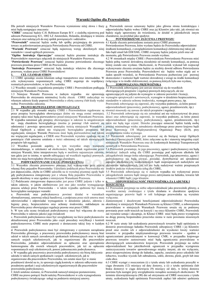 Warunki Ogólne dla Przewoźników Dla potrzeb niniejszych Warunków Przewozu wymienione niżej słowa i frazy mieć będą następujące znaczenie: “CHRE” oznaczać będzie C.H. Robinson Europe B.V. z siedzibą rejestrową pod adresem Parnassusweg 821, 1082 LZ Amsterdam, Holandia, działającą w imieniu własnym oraz należących do niej spółek powiązanych i oddziałów. “Przewoźnik” oznaczać będzie osobę lub spółkę przyjmującą do przewozu towary za pokwitowaniem przyjęcia Potwierdzenia Przewozu od CHRE. “Warunki Przewozu” oznaczać będą najnowszą wersję określonych niżej warunków i zasad ogólnych przewozu. “Ogólne Instrukcje Operacyjne” oznaczać będzie pisemne instrukcje dla Przewoźników stanowiące załącznik do niniejszych Warunków Przewozu. “Potwierdzenie Przewozu” oznaczać będzie pisemne potwierdzenie zleconego przewozu przesłane przez CHRE do Przewoźnika. “Instrukcje Przewozowe” oznaczać będą instrukcje właściwe dla zleconego przewozu, wydane przez CHRE Przewoźnikowi 1. CEL I ZAMIAR STRON 1.1 CHRE sprzedaje swoim klientom usługi transportowe oraz intermodalne. W celu wykonywania wspomnianych usług CHRE angażuje do współpracy rozmaitych przewoźników, w tym Przewoźnika. 1.2 Wszelkie stosunki i uzgodnienia pomiędzy CHRE i Przewoźnikiem podlegają niniejszym Warunkom Przewozu. 1.3 Niniejsze Warunki Przewozu w żadnym wypadku nie uprawniają Przewoźnika do otrzymania minimalnej liczby zleceń. CHRE zadecyduje we własnym zakresie kiedy poprosić Przewoźnika o ofertę cenową i/lub kiedy wydać wobec Przewoźnika zalecenia. 2. PRAWO BEZWZGLĘDNIE OBOWIĄZUJĄCE 2.1 W wypadku gdy stosunki między CHRE i Przewoźnikiem regulowane są przez przepisy bezwzględnie obowiązujące (które nie mogą zostać ominięte), przepisy takie mieć będą pierwszeństwo przed niniejszymi Warunkami Przewozu. W wypadku natomiast gdy przepisy obowiązujące w zakresie tu uregulowanym nie mają charakteru bezwzględnego (można je pominąć i/lub umówić się odmiennie) i powstaje sprzeczność pomiędzy treścią niniejszych Warunków i Zasad Ogólnych a takimi nie wiążącymi bezwzględnie przepisami lub regulacjami, niniejsze Warunki Przewozu mieć będą pierwszeństwo nad takimi nie wiążącymi regulacjami, a CHER oraz Przewoźnik wyraźnie zgadzają się na pominięcie i/lub umowne ustalenia o treści odmiennej od takich niewiążących przepisów lub regulacji. 2.2 Wszelkie pozostałe aspekty, w tym wszystkie etapy transportu intermodelanego, w zależności od okoliczności, będą jednak regulowane przez niniejsze Warunki, które interpretowane będą w możliwie najszerszym zakresie, tam gdzie jest to istotne, w sposób odbiegający od wszelkich regulacji prawnych, które nie mają bezwzględnie obowiązującego charakteru. 3. PODWYKONYWANIE USŁUG (PODZLECENIA) 3.1 Wszystkie zlecenia przewozowe powinny być wykonywane przy użyciu własnej floty pojazdów Przewoźnika Udzielanie podzleceń przez Przewoźnika nie jest dopuszczalne, chyba że CHRE udzieliła na to wyraźnej pisemnej zgody bądź gdy podwykonawca zintegrowany jest z własną flotą pojazdów Przewoźnika w sposób określony w oraz zgodnie z niniejszymi Warunkami Przewozu. 3.2 Podzlecanie zintegrowane dopuszczalne jest przez CHRE jedynie i tylko w takim zakresie, w jakim zdefiniowane jest ono jako rezultat wymagającego procesu selekcji przez Przewoźnika – w takim wypadku spełnione być muszą bezwzględnie następujące warunki: a. Przewoźnik oraz podwykonawca powinni działać w warunkach sformalizowanej, umownej relacji handlowej, a podpisana przez nich umowa musi odzwierciedlać i odpowiadać wymaganiom w dziedzinie jakości, zdrowia i higieny pracy, bezpieczeństwa oraz ochrony środowiska, nakładanym na Przewoźnika przez obowiązujące regulacje prawne oraz przez CHRE. b. W tym celu ocena świadczeń podwykonawcy musi być włączona do oceny Przewoźnika w zakresie jakości jego świadczeń c. Przewoźnik podwykonawca musi być uwzględniony na liście podwykonawców aktualizowanej przez Przewoźnika jako część procedury weryfikacji i kontroli podwykonawstwa; CHRE może poprosić o dostarczenie takiej listy w każdym czasie d. Przewoźnik podwykonawca musi być zintegrowany z systemem zarządzania Przewoźnika głównego, a pracownicy przewoźnika podwykonawcy muszą brać udział w takich samych zawodowych spotkaniach informacyjnych oraz w takich samych sesjach szkoleniowych, jak te organizowane dla pracowników Przewoźnika, jednakże odpowiedzialność za opłacenie oraz sporządzenie harmonogramu dla swoich własnych pracowników, jak też za opłacenie wspomnianych sesji szkoleniowych, ponosi jednoznacznie podwykonawca. e. W wypadku gdy pracownicy przewoźnika podwykonawcy nie biorą faktycznie udziału w takich samych spotkaniach i sesjach szkoleniowych, jak te organizowane dla pracowników Przewoźnika, ten ostatni musi być w stanie przedstawić dowód na to, że sprawuje ciągłą kontrolę w zakresie odbywania oraz przedmiotu spotkań i sesji szkoleniowych organizowanych dla pracowników przewoźnika podwykonawcy. f. Jeżeli ustalone zostanie, że Przewoźnik naruszył niniejsze postanowienie, CHRE ma prawo potrącić fracht należny Przewoźnikowi w celu wynagrodzenia podwykonawcy świadczącego usługi na podstawie niniejszej umowy. g. Przewoźnik zawsze uznawany będzie jako główna strona kontraktująca i odpowiedzialny będzie wobec CHRE oraz jej Klientów jako taki, jak również nie będzie nigdy uprawniony do twierdzenia, że działał w jakimkolwiek innym charakterze, na przykład jako spedytor. 4. POTWIERDZENIE ZLECENIA I PRZEWOZU 4.1 Każde zlecenie potwierdzone zostanie przez CHRE pisemnym Potwierdzeniem Przewozu, które wysłane będzie do Przewoźnika odpowiednimi środkami komunikacji, z uwzględnieniem komunikacji elektronicznej takiej jak faks bądź email lub EDI/XML. CHRE związany będzie jedynie jeżeli oraz