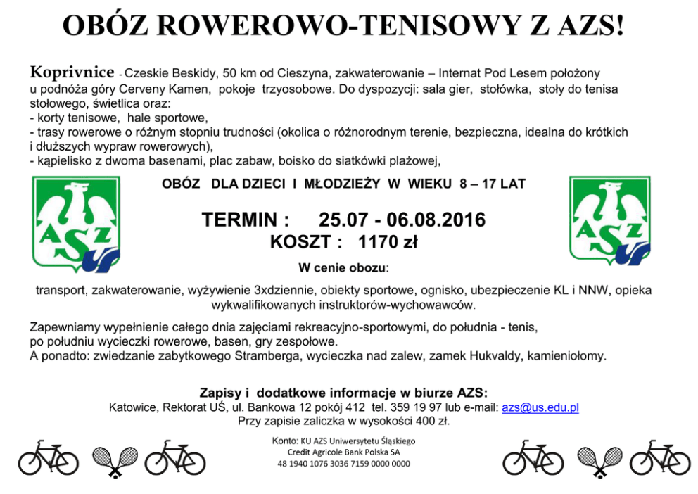 OBÓZ ROWEROWO-TENISOWY Z AZS! Koprivnice - Czeskie Beskidy, 50 km od Cieszyna, zakwaterowanie – Internat Pod Lesem położony u podnóża góry Cerveny Kamen, pokoje trzyosobowe. Do dyspozycji: sala gier, stołówka, stoły do tenisa stołowego, świetlica oraz: - korty tenisowe, hale sportowe, - trasy rowerowe o różnym stopniu trudności (okolica o różnorodnym terenie, bezpieczna, idealna do krótkich i dłuższych wypraw rowerowych), - kąpielisko z dwoma basenami, plac zabaw, boisko do siatkówki plażowej, OBÓZ DLA DZIECI I MŁODZIEŻY W WIEKU 8 – 17 LAT TERMIN : 25.07 - 06.08.2016 KOSZT : 1170 zł W cenie obozu: transport, zakwaterowanie, wyżywienie 3xdziennie, obiekty sportowe, ognisko, ubezpieczenie KL i NNW, opieka wykwalifikowanych instruktorów-wychowawców. Zapewniamy wypełnienie całego dnia zajęciami rekreacyjno-sportowymi, do południa - tenis, po południu wycieczki rowerowe, basen, gry zespołowe. A ponadto: zwiedzanie zabytkowego Stramberga, wycieczka nad zalew, zamek Hukvaldy, kamieniołomy. Zapisy i dodatkowe informacje w biurze AZS: Katowice, Rektorat UŚ, ul. Bankowa 12 pokój 412 tel. 359 19 97 lub e-mail: [email protected] Przy zapisie zaliczka w wysokości 400 zł. Konto: KU AZS Uniwersytetu Śląskiego Credit Agricole Bank Polska SA 48 1940 1076 3036 7159 0000 0000