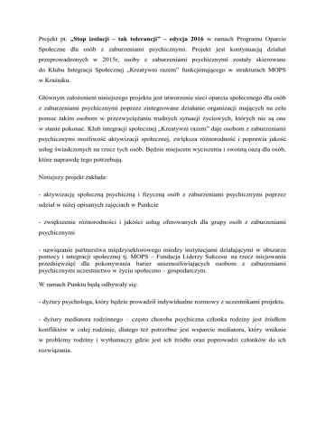 Projekt pt. „Stop izolacji – tak tolerancji” – edycja 2016 w ramach Programu Oparcie Społeczne dla osób z zaburzeniami psychicznymi. Projekt jest kontynuacją działań przeprowadzonych w 2015r, osoby z zaburzeniami psychicznymi zostały skierowane do Klubu Integracji Społecznej „Kreatywni razem” funkcjonującego w strukturach MOPS w Kraśniku. Głównym założeniem niniejszego projektu jest utworzenie sieci oparcia społecznego dla osób z zaburzeniami psychicznymi poprzez zintegrowane działanie organizacji mających na celu pomoc takim osobom w przezwyciężaniu trudnych sytuacji życiowych, których nie są one w stanie pokonać. Klub integracji społecznej „Kreatywni razem” daje osobom z zaburzeniami psychicznymi możliwość aktywizacji społecznej, zwiększa różnorodność i poprawia jakość usług świadczonych na rzecz tych osób. Będzie miejscem wyciszenia i swoistą oazą dla osób, które naprawdę tego potrzebują. Niniejszy projekt zakłada: - aktywizację społeczną psychiczną i fizyczną osób z zaburzeniami psychicznymi poprzez udział w niżej opisanych zajęciach w Punkcie - zwiększenie różnorodności i jakości usług oferowanych dla grupy osób z zaburzeniami psychicznymi - nawiązanie partnerstwa międzysektorowego miedzy instytucjami działającymi w obszarze pomocy i integracji społecznej tj. MOPS – Fundacja Liderzy Sukcesu na rzecz inicjowania przedsięwzięć dla pokonywania barier uniemożliwiających osobom z zaburzeniami psychicznymi uczestnictwo w życiu społeczno – gospodarczym. W ramach Punktu będą odbywały się: - dyżury psychologa, który będzie prowadził indywidualne rozmowy z uczestnikami projektu. - dyżury mediatora rodzinnego – często choroba psychiczna członka rodziny jest źródłem konfliktów w całej rodzinie, dlatego też potrzebne jest wsparcie mediatora, który wniknie w problemy rodziny i wytłumaczy gdzie jest ich źródło oraz poprowadzi członków do ich rozwiązania. - warsztaty rękodzieła artystycznego (elementy artterapii), podczas których poza uczestnicy pod okiem trenera będą rozwijali swoje umiejętności manualne oraz odprężali się odzyskując potrzebny im spokój - warsztat kulinarny – powszechne powiedzenie, że „stół łączy wszystkich” sprawdziło się również u uczestników poprzedniej edycji projektu w 2015r. To właśnie uczestnicy poprzedniej edycji wyszli z inicjatywą zorganizowania takich warsztatów podczas, których oni sami pod okiem trenera będą mogli przygotować posiłki, które następnie wszyscy razem spożyją. - wyjścia aktywizujące – idąc dalej stawiamy kolejny krok, dotychczas zależało nam na integracji osób z zaburzeniami psychicznymi w grupie i to się udało osiągnąć w 2015r. natomiast obecnie chcielibyśmy rozpoczać integrację z otoczeniem. W związku z tym proponujemy wyjazdy nad zalew w Kraśniku połączone z ćwiczeniami ruchowymi na świeżym powietrzu na ogólnodostępnym atlasie ćwiczeń przy zalewie. Ponadto proponujemy również grupowe wyjścia do kraśnickich herbaciarni/kawiarni. W grupie osoby z zaburzeniami psychicznymi czują się bezpieczniej. - w Punkcie zostanie także zatrudniony asystent osób z zaburzeniami psychicznymi i ich rodzin, który będzie dostępny przez wszystkie godziny otwarcia Punku Ponadto będzie on opiekował się grupą uczestników podczas wspólnych wyjść do kawiarni lub wyjazdów nad zalew. Osoba ta będzie dbała o przełamywanie bariery izolacji społecznej uczestników projektu i organizacje kontaktów międzyludzkich, - poza w/w zajęciami w ramach punktu będą organizowane spotkania terapii zajęciowej, które będą polegały na wspólnym spędzaniu wolnego czasu przy grach, pracach plastycznych, florystycznych, czy też czytaniu czasopism, książek lub układaniu puzzli.