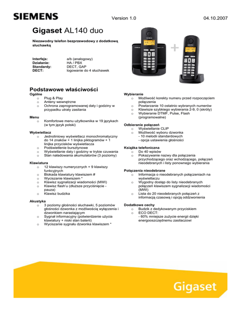 Version 1.0 04.10.2007 Gigaset AL140 duo Niezawodny telefon bezprzewodowy z dodatkową słuchawką Interfejs: Działanie: Standardy: DECT: a/b (analogowy) HA / PBX DECT, GAP logowanie do 4 słuchawek Podstawowe właściwości Ogólne o Plug & Play o Anteny wewnętrzne o Ochrona zaprogramowanej daty i godziny w przypadku utraty zasilania Menu o Komfortowe menu użytkownika w 19 językach (w tym język polski) Wyświetlacz o Jednoliniowy wyświetlacz monochromatyczny do 14 znaków + 1 linijka piktogramów + 1 linijka przycisków wyświetlacza o Podświetlenie bursztynowe o Wyświetlanie daty i godziny w trybie czuwania o Stan naładowania akumulatorów (3 poziomy) Klawiatura o 12 klawiszy numerycznych + 9 klawiszy funkcyjnych o Blokada klawiatury klawiszem # o Wyciszanie klawiszem * o Klawisz sygnalizacji wiadomości (MWI) o Klawisz flash’u (dłuższe przyciśnięcie pauza) o Klawisz budzika Akustyka o 3 poziomy głośności słuchawki, 5 poziomów głośności dzwonka z możliwością wyłączenia i dzwonkiem narastającym o Sygnał informacyjny (potwierdzenie użycia klawiatury + niski stan baterii) o Wyciszanie sygnału dzwonka klawiszem * Wybieranie o Możliwość korekty numeru przed rozpoczęciem połączenia o Powtarzanie 10 ostatnio wybranych numerów o Klawisze szybkiego wybierania 2-9, 0 (skróty) o Wybieranie DTMF, Pulse, Flash (programowalne) Odbieranie połączeń o Wyświetlanie CLIP o Możliwość wyboru dzwonka - 10 melodii standardowych - opcja ustawienia głośności Książka telefoniczna o Do 40 wpisów o Pokazywanie nazwy dla połączenia przychodzącego oraz wchodzącego, połączeń nieodebranych i listy ponownego wybierania Połączenia nieodebrane o Informacja o nieodebranych połączeniach na wyświetlaczu o Wygodny dostęp do listy nieodebranych połączeń klawiszem sygnalizacji wiadomości (MWI) o Lista do 20 nieodebranych połączeń z informacją czasową i opcją oddzwonienia Dodatkowe cechy o Budzik z dedykowanym przyciskiem o ECO DECT: - 60% mniejsze zużycie energii dzięki energooszczędnemu zasilaczowi Version 1.0 Cechy Interkomu o Bezpłatne rozmowy wewnętrzne o Połączenie zbiorowe do wszystkich słuchawek o Trójstronna konferencja (1 zew., 2 wew.) poprzez połączenie wewnętrzne lub włączenie się do rozmowy o Przełączanie rozmowy na drugą słuchawkę wewnętrzną po uprzedniej konsultacji 04.10.2007 Dane techniczne Słuchawka o Czas czuwania: do 200 godz. o Czas rozmowy: do 13 godz. o Akumulatory: Zestaw (NiMH) o Czas ładowania: 10h o Zasięg wewn.: do 50 metrów o Zasięg zewn.: do 300 metrów o Wymiary i waga (w mm i gramach): o Słuchawka: 151,9 x 50,3 x 33,8 / 122g Baza: 90,4 x 109,5 x 71 / 110g Stacja bazowa o Zasilanie: 230 V (zasilacz wtyczkowy) o Ładowarka w stacji bazowej o Możliwość montażu na ścianie o Klawisz przywołania słuchawek o Podłączenie 1 linii zewnętrznej o Możliwość zalogowania do 4 słuchawek Zawartość opakowania o 2 Słuchawki o 1 Stacja bazowa o 1 Ładowarka o 2 Zestawy akumulatorów (softpack) o 1 Zasilacz o 1 Kabel telefoniczny RJ-11 o 1 Instrukcja obsługi Kolor: czarny