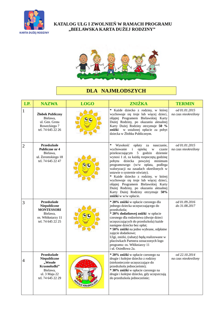 KATALOG ULG I ZWOLNIEŃ W RAMACH PROGRAMU „BIELAWSKA KARTA DUŻEJ RODZINY” DLA NAJMŁODSZYCH LP. 1 NAZWA Żłobek Publiczny Bielawa, ul. Gen. Grota Roweckiego 7 tel. 74 645 22 26 LOGO ZNIŻKA TERMIN * Każde dziecko z rodziny, w której wychowuje się troje lub więcej dzieci, objętej Programem Bielawskiej Karty Dużej Rodziny, po okazaniu aktualnej Karty Dużej Rodziny otrzymuje 50 % zniżki w ustalonej opłacie za pobyt dziecka w Żłobku Publicznym. od 01.01.2015 na czas nieokreślony 2 Przedszkole Publiczne nr 4 Bielawa, ul. Żeromskiego 18 tel. 74 645 22 47 * Wysokość opłaty za nauczanie, wychowanie i opiekę w czasie przekraczającym 5 godzin dziennie wynosi 1 zł, za każdą rozpoczętą godzinę pobytu dziecka powyżej minimum programowego (w/w opłata, podlega waloryzacji na zasadach określonych w ustawie o systemie oświaty). * Każde dziecko z rodziny, w której wychowuje się troje lub więcej dzieci, objętej Programem Bielawskiej Karty Dużej Rodziny, po okazaniu aktualnej Karty Dużej Rodziny otrzymuje 50% zniżki w w/w opłacie. od 01.01.2015 na czas nieokreślony 3 Przedszkole Niepubliczne MONTESSORI Bielawa, os. Włókniarzy 11 tel. 74 645 22 25 * 20% zniżki w opłacie czesnego dla jednego dziecka uczęszczającego do przedszkola; * 20% dodatkowej zniżki w opłacie czesnego dla rodzeństwa (dwoje dzieci uczęszczających do przedszkola) każde następne dziecko bez opłat; * 50% zniżki na jedno wybrane, odpłatne zajęcie dodatkowe; Ulgi, zniżki, (rabaty) będą realizowane w placówkach Partnera oznaczonych logo programu: os. Włókniarzy 11 i ul. Osiedlowa 2a. od 01.09.2016 do 31.08.2017 Przedszkole Niepubliczne „Wesołe Krasnoludki” Bielawa, ul. 3 Maja 22 tel. 74 645 22 29 * 20% zniżki w opłacie czesnego na drugie i kolejne dziecko z rodziny (niekoniecznie uczęszczające do przedszkola jednocześnie); * 30% zniżki w opłacie czesnego na drugie i kolejne dziecko, gdy uczęszczają do przedszkola jednocześnie; od 22.10.2014 na czas nieokreślony 4 KATALOG ULG I ZWOLNIEŃ W RAMACH PROGRAMU „BIELAWSKA KARTA DUŻEJ RODZINY” 5 Przedszkole Niepubliczne z Oddziałami Integracyjnymi Bielawa, ul. Wolności 88 tel. 74 645 22 27 * 20% zniżki w opłacie czesnego na drugie i kolejne dziecko(w przypadku jednoczesnego uczęszczania do przedszkola dwojga dzieci z jednej rodziny); * Bezpłatne ubezpieczenie dla drugiego i trzeciego dziecka z jednej rodziny (w przypadku jednoczesnego uczęszczania do przedszkola); * 50% zniżki w opłacie czesnego dla dziecka niepełnosprawnego; od 22.10.2014 do 31.12.2016 6 Sportowe Przedszkole Niepubliczne Bielawa, ul. Klonowa 4 tel. 74 645 22 28 * 50% zniżki w opłacie czesnego dla drugiego dziecka (w przypadku jednoczesnego uczęszczania dwojga dzieci z rodziny do przedszkola); * 100% zniżki w opłacie czesnego dla trzeciego dziecka (w przypadku jednoczesnego uczęszczania trojga dzieci z rodziny do przedszkola); * Przedszkole zapewnia dzieciom wyprawkę papierniczą na początku roku szkolnego; od 22.10.2014 do 31.12.2016 7 Ekologiczne Przedszkole Niepubliczne Bielawa, ul. Parkowa 11 tel. 74 645 22 24 * Każde dziecko z rodziny posiadającej „Kartę Dużej Rodziny”otrzymuje 20% zniżki w opłacie czesnego; * Dodatkowo drugie dziecko uczęszczające do przedszkola otrzymuje 30% zniżki w opłacie czesnego; * Trzecie i kolejne dziecko uczęszczające do przedszkola otrzymuje 50% zniżki w opłacie czesnego; od 22.10.2014 na czas nieokreślony 8 Zespół Szkół Społecznych STO Bielawa ul. S. Żeromskiego 1 tel. 74 833 38 70 * Czesne za drugie dziecko przez cały okres nauki – 50% wysokości czesnego podstawowego; * Czesne za trzecie dziecko i kolejne dziecko przez cały okres nauki – 0,5% wysokości czesnego podstawowego; * Czesne w Społecznej Szkole Muzycznej – 25% zniżki; * Czesne w Ognisku Muzycznym – 30 zł zniżki. od 02.09.2015 na czas niekreślony 9 TOYS Sławomir Hanuszek Bielawa, pl. Wolności 9 tel. 512 169 400 * Cały asortyment (z wyłączeniem asortymentu firmy LEGO oraz produktów objętych promocją, wyprzedażą lub przeceną) – zniżka 10%; od 22.10.2014 na czas nieokreślony KATALOG ULG I ZWOLNIEŃ W RAMACH PROGRAMU „BIELAWSKA KARTA DUŻEJ RODZINY” COŚ DLA DUSZY I DLA CIAŁA LP. NAZWA 1 Miejska Biblioteka Publiczna Bielawa, ul. Piastowska 19c tel. 74 645 09 66 2 Miejski Ośrodek Kultury i Sztuki Bielawa, ul. Piastowska 19a tel. 74 833 30 0 LOGO ZNIŻKA * Założenie konta i wydanie karty bibliotecznej – bezpłatnie; * Usługi ksero – 0,10 zł za stronę A4, skan 0,05 zł za stronę; * Bezpłatne korzystanie z komputera i internetu; * Wstęp do Działu RegionalnoBadawczego – zniżka 50%; * Publikacje wydawnictwa MBP – zniżka 30%; * Bilet wstępu na koncerty Klubu „Pozytywka” – zniżka 50%; * Dla dzieci nieodpłatne uczestnictwo w zajęciach warsztatowych organizowanych przez MOKiS w czasie ferii szkolnych TERMIN od 22.10.2014 na czas nieokreślony od 22.10.2014 na czas nieokreślony oraz wakacji; * Udział w sekcjach i zespołach amatorskiego ruchu artystycznego – zniżka 50% na pierwsze dziecko, kolejne dziecko bierze udział bezpłatnie; * Nieodpłatne uczestnictwo w zespołach dziecięcych; * Dla dzieci nieodpłatne wejście na imprezy biletowane organizowane przez MOKiS, dla rodziców wejście ze zniżką – cena biletu będzie każdorazowo publikowana na plakacie (z wyjątkiem imprez odbywających się w obiektach MOKiS na zasadzie wynajmu sali); * Nieodpłatne wejście dla całych rodzin na Regałowisko oraz inne płatne imprezy plenerowe organizowane przez MOKiS * Bilety do kina – zakup biletów ze zniżką 25%; 3 Ośrodek Sportu i Rekreacji Bielawa, ul. Gen. Grota Roweckiego 8 tel. 74 833 95 10 *PŁYWALNIA AQUARIUS * Zniżka za pierwszą godzinę wejścia na basen – 30%; * Zniżka za drugą godzinę wejścia na basen – 50%; STUDIO ODNOWY BIOLOGICZNEJ * Zniżka na siłownię za osobę – 6 zł godzina; od 27.01.2016 na czas nieokreślony KATALOG ULG I