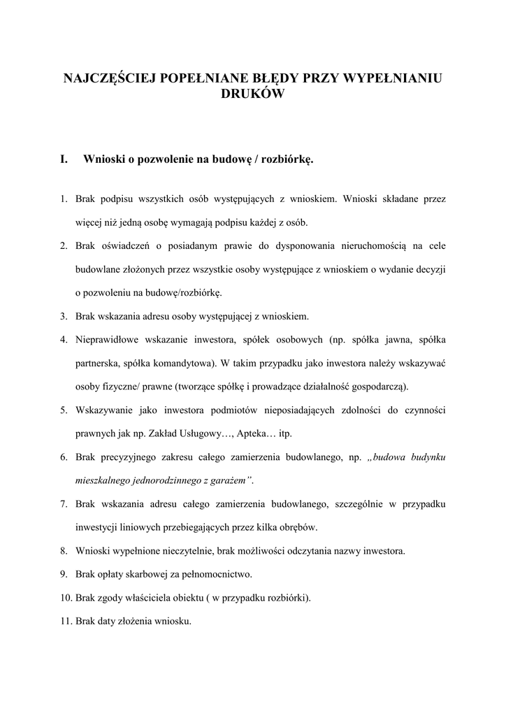 NAJCZĘŚCIEJ POPEŁNIANE BŁĘDY PRZY WYPEŁNIANIU DRUKÓW I. Wnioski o pozwolenie na budowę / rozbiórkę. 1. Brak podpisu wszystkich osób występujących z wnioskiem. Wnioski składane przez więcej niż jedną osobę wymagają podpisu każdej z osób. 2. Brak oświadczeń o posiadanym prawie do dysponowania nieruchomością na cele budowlane złożonych przez wszystkie osoby występujące z wnioskiem o wydanie decyzji o pozwoleniu na budowę/rozbiórkę. 3. Brak wskazania adresu osoby występującej z wnioskiem. 4. Nieprawidłowe wskazanie inwestora, spółek osobowych (np. spółka jawna, spółka partnerska, spółka komandytowa). W takim przypadku jako inwestora należy wskazywać osoby fizyczne/ prawne (tworzące spółkę i prowadzące działalność gospodarczą). 5. Wskazywanie jako inwestora podmiotów nieposiadających zdolności do czynności prawnych jak np. Zakład Usługowy…, Apteka… itp. 6. Brak precyzyjnego zakresu całego zamierzenia budowlanego, np. „budowa budynku mieszkalnego jednorodzinnego z garażem”. 7. Brak wskazania adresu całego zamierzenia budowlanego, szczególnie w przypadku inwestycji liniowych przebiegających przez kilka obrębów. 8. Wnioski wypełnione nieczytelnie, brak możliwości odczytania nazwy inwestora. 9. Brak opłaty skarbowej za pełnomocnictwo. 10. Brak zgody właściciela obiektu ( w przypadku rozbiórki). 11. Brak daty złożenia wniosku. II. Druk zgłoszenia robót niewymagających pozwolenie a na budowę i objętych zgłoszeniem 1. Brak podpisu wszystkich osób występujących ze zgłoszeniem. Zgłoszenia składane przez więcej niż jedną osobę wymagają podpisu każdej z osób. 2. Brak oświadczeń o posiadanym prawie do dysponowania nieruchomością na cele budowlane złożonych przez wszystkie osoby występujące ze zgłoszeniem robót budowlanych / rozbiórkowych. 3. Brak wskazania adresu osoby występującej ze zgłoszeniem. 4. Nieprawidłowe wskazanie inwestora, spółek osobowych (np. spółka jawna, spółka partnerska, spółka komandytowa). W takim przypadku jako inwestora należy wskazywać osoby fizyczne/ prawne (tworzące spółkę i prowadzące działalność gospodarczą). 5. Wskazywanie jako inwestora podmiotów nieposiadających zdolności do czynności prawnych jak np. Zakład Usługowy…, Apteka… itp. 6. Brak precyzyjnego zakresu robót zamierzenia budowlanego. 7. Brak wskazania terminu rozpoczęcia robót. 8. Druki wypełnione nieczytelnie, brak możliwości odczytania nazwy inwestora. 9. Brak opłaty skarbowej za pełnomocnictwo. 10. Brak zgody właściciela obiektu ( w przypadku rozbiórki). 11. Brak daty złożenia zgłoszenia. III. Oświadczenia o posiadanym prawie do dysponowania nieruchomością na cele budowlane A. 1. Braki w oświadczeniach składanych przez osoby fizyczne. Brak wskazania nr dowodu osobistego lub innego dokumentu stwierdzającego tożsamość osoby składającej oświadczenie. 2. Brak nazwy organu wydającego dokument tożsamości. 3. W przypadku wskazania tytułu do dysponowania nieruchomością na cele budowlane wynikającego ze współwłasności brak wskazania współwłaściciela. 4. W przypadku wskazania tytułu do dysponowania nieruchomością na cele budowlane wynikające ze współwłasności, nie wypełnienie akapitu o posiadaniu zgody wszystkich współwłaścicieli. 5. W przypadku wskazania tytułu do dysponowania nieruchomością budowlaną na cele budowlane wynikającego ze stosunku zobowiązaniowego brak wskazania właściciela (współwłaścicieli) nieruchomości z podaniem imienia i nazwiska (lub nazwy) oraz adresu. 6. W przypadku wskazania tytułu do dysponowania nieruchomością na cele budowlane wynikającego ze stosunku zobowiązaniowego, nie wypełnienie akapitu dotyczącego wskazania dokumentu potwierdzającego powyższe prawo do dysponowania nieruchomością na cele budowlane. 7. Brak określenia miejscowości i daty złożenia oświadczenia. III. Oświadczenia o posiadanym prawie do dysponowania nieruchomością na cele budowlane B. Braki w oświadczeniach składanych przez pełnomocników inwestorów będących osobami prawnymi. 1. Brak wskazania nr dowodu osobistego lub innego dokumentu stwierdzającego tożsamość osoby składającej oświadczenie. 2. Brak nazwy organu wydającego dokument tożsamości. 3. W przypadku wskazania tytułu do dysponowania nieruchomością na cele budowlane wynikającego ze współwłasności brak wskazania współwłaściciela. 4. W przypadku wskazania tytułu do dysponowania nieruchomością na cele budowlane wynikające ze współwłasności, nie wypełnienie akapitu o posiadaniu zgody wszystkich współwłaścicieli. 5. W przypadku wskazania tytułu do dysponowania nieruchomością budowlaną na cele budowlane wynikającego ze stosunku zobowiązaniowego brak wskazania właściciela (współwłaścicieli) nieruchomości z podaniem imienia i nazwiska (lub nazwy) oraz adresu. 6. W przypadku wskazania tytułu do dysponowania nieruchomością na cele budowlane wynikającego ze stosunku zobowiązaniowego, nie wypełnienie akapitu dotyczącego wskazania dokumentu potwierdzającego powyższe prawo do dysponowania nieruchomością na cele budowlane. 7. Brak określenia miejscowości i daty złożenia oświadczenia. 8. Wpisywanie nazwy osoby prawnej (firmy) zamiast imienia i nazwiska osoby składającej oświadczenie. 9. Niewypełnienie (lub nieprawidłowe wypełnienie) akapitu o posiadanym pełnomocnictwie do reprezentowania osoby prawnej. Najczęściej brak daty nabycia prawa do reprezentowania oraz pełnej nazwy i adresu firmy. 10. Nie dołączanie do oświadczenia pełnomocnictwa do reprezentowania osoby prawnej.