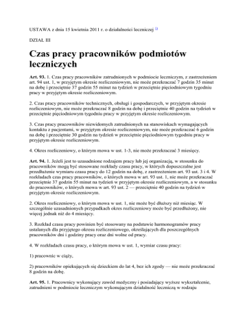 USTAWA z dnia 15 kwietnia 2011 r. o działalności leczniczej 1) DZIAŁ III Czas pracy pracowników podmiotów leczniczych Art. 93. 1. Czas pracy pracowników zatrudnionych w podmiocie leczniczym, z zastrzeżeniem art. 94 ust. 1, w przyjętym okresie rozliczeniowym, nie może przekraczać 7 godzin 35 minut na dobę i przeciętnie 37 godzin 55 minut na tydzień w przeciętnie pięciodniowym tygodniu pracy w przyjętym okresie rozliczeniowym. 2. Czas pracy pracowników technicznych, obsługi i gospodarczych, w przyjętym okresie rozliczeniowym, nie może przekraczać 8 godzin na dobę i przeciętnie 40 godzin na tydzień w przeciętnie pięciodniowym tygodniu pracy w przyjętym okresie rozliczeniowym. 3. Czas pracy pracowników niewidomych zatrudnionych na stanowiskach wymagających kontaktu z pacjentami, w przyjętym okresie rozliczeniowym, nie może przekraczać 6 godzin na dobę i przeciętnie 30 godzin na tydzień w przeciętnie pięciodniowym tygodniu pracy w przyjętym okresie rozliczeniowym. 4. Okres rozliczeniowy, o którym mowa w ust. 1-3, nie może przekraczać 3 miesięcy. Art. 94. 1. Jeżeli jest to uzasadnione rodzajem pracy lub jej organizacją, w stosunku do pracowników mogą być stosowane rozkłady czasu pracy, w których dopuszczalne jest przedłużenie wymiaru czasu pracy do 12 godzin na dobę, z zastrzeżeniem art. 93 ust. 3 i 4. W rozkładach czas pracy pracowników, o których mowa w art. 93 ust. 1, nie może przekraczać przeciętnie 37 godzin 55 minut na tydzień w przyjętym okresie rozliczeniowym, a w stosunku do pracowników, o których mowa w art. 93 ust. 2 — przeciętnie 40 godzin na tydzień w przyjętym okresie rozliczeniowym. 2. Okres rozliczeniowy, o którym mowa w ust. 1, nie może być dłuższy niż miesiąc. W szczególnie uzasadnionych przypadkach okres rozliczeniowy może być przedłużony, nie więcej jednak niż do 4 miesięcy. 3. Rozkład czasu pracy powinien być stosowany na podstawie harmonogramów pracy ustalanych dla przyjętego okresu rozliczeniowego, określających dla poszczególnych pracowników dni i godziny pracy oraz dni wolne od pracy. 4. W rozkładach czasu pracy, o którym mowa w ust. 1, wymiar czasu pracy: 1) pracownic w ciąży, 2) pracowników opiekujących się dzieckiem do lat 4, bez ich zgody — nie może przekraczać 8 godzin na dobę. Art. 95. 1. Pracownicy wykonujący zawód medyczny i posiadający wyższe wykształcenie, zatrudnieni w podmiocie leczniczym wykonującym działalność leczniczą w rodzaju stacjonarne i całodobowe świadczenia zdrowotne mogą być zobowiązani do pełnienia w przedsiębiorstwie tego podmiotu dyżuru medycznego. 2. Dyżurem medycznym jest wykonywanie poza normalnymi godzinami pracy czynności zawodowych przez osoby, o których mowa w ust. 1, w podmiocie leczniczym wykonującym stacjonarne i całodobowe świadczenia zdrowotne. 3. Czas pełnienia dyżuru medycznego wlicza się do czasu pracy. 4. Praca w ramach pełnienia dyżuru medycznego może być planowana również w zakresie, w jakim będzie przekraczać 37 godzin 55 minut na tydzień w przyjętym okresie rozliczeniowym. Do pracy w ramach pełnienia dyżuru nie stosuje się przepisów art. 151 § 3, art. 1513 i art. 1514 ustawy z dnia 26 czerwca 1974 r. — Kodeks pracy. 5. Do wynagrodzenia za pracę w ramach pełnienia dyżuru medycznego stosuje się odpowiednio przepisy art. 1511 § 1-3 ustawy z dnia 26 czerwca 1974 r. — Kodeks pracy. 6. Zasad wynagradzania, o których mowa w przepisach art. 1511 § 1-3 ustawy z dnia 26 czerwca 1974 r. — Kodeks pracy, nie stosuje się do lekarzy stażystów, których zasady wynagradzania określają odrębne przepisy. Art. 96. 1. Pracownicy, o których mowa w art. 95 ust. 1, mogą być, po wyrażeniu na to zgody na piśmie, zobowiązani do pracy w wymiarze przekraczającym przeciętnie 48 godzin na tydzień w przyjętym okresie rozliczeniowym. Przepisu art. 151 § 3 ustawy z dnia 26 czerwca 1974 r. — Kodeks pracy nie stosuje się. 2. Okres rozliczeniowy, o którym mowa w ust. 1, nie może być dłuższy niż 4 miesiące. 3. Pracodawca jest obowiązany prowadzić i przechowywać ewidencję czasu pracy pracowników, o których mowa w ust. 1, oraz udostępniać ją organom właściwym do sprawowania nadzoru i kontroli nad przestrzeganiem prawa pracy, które mogą, z powodów związanych z bezpieczeństwem lub zdrowiem pracowników, a także w celu zapewnienia właściwego poziomu udzielania świadczeń zdrowotnych, zakazać albo ograniczyć możliwość wydłużenia maksymalnego tygodniowego wymiaru czasu pracy. 4. Pracodawca nie może podejmować działań dyskryminujących wobec pracowników, którzy nie wyrazili zgody, o której mowa w ust. 1. 5. Pracodawca jest obowiązany dostarczać organom, o których mowa w ust. 3, na ich wniosek, informacje o przypadkach, w których pracownicy wyrazili zgodę w celu wykonywania pracy w wymiarze przekraczającym 48 godzin na tydzień w przyjętym okresie rozliczeniowym, o którym mowa w ust. 2. 6. Pracownik może cofnąć zgodę na pracę w wymiarze przekraczającym 48 godzin na tydzień w przyjętym okresie rozliczeniowym, informując o tym pracodawcę na piśmie, z zachowaniem miesięcznego okresu wypowiedzenia. 7. Do wynagrodzenia za pracę w wymiarze przekraczającym przeciętnie 48 godzin na tydzień w przyjętym okresie rozliczeniowym stosuje się odpowiednio art. 1511 § 1-3 ustawy z dnia 26 czerwca 1974 r. — Kodeks pracy. Art. 97. 1. Pracownikowi przysługuje w każdej dobie prawo do co najmniej 11 godzin nieprzerwanego odpoczynku. 2. Pracownikowi pełniącemu dyżur medyczny okres odpoczynku, o którym mowa w ust. 1, powinien być udzielony bezpośrednio po zakończeniu pełnienia dyżuru medycznego. 3. Pracownikowi przysługuje w każdym tygodniu prawo do co najmniej 35 godzin nieprzerwanego odpoczynku, obejmującego co najmniej 11 godzin nieprzerwanego odpoczynku dobowego. 4. W przypadku uzasadnionym organizacją pracy pracownikowi, o który