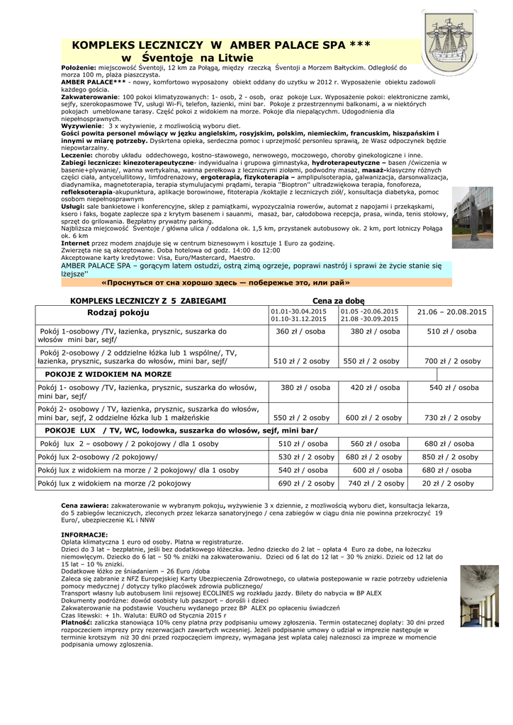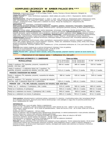 KOMPLEKS LECZNICZY W AMBER PALACE SPA *** w Śventoje na Litwie Położenie: miejscowość Śventoji, 12 km za Połągą, między rzeczką Śventoji a Morzem Bałtyckim. Odległość do morza 100 m, plaża piaszczysta. AMBER PALACE*** - nowy, komfortowo wyposażony obiekt oddany do uzytku w 2012 r. Wyposażenie obiektu zadowoli każdego gościa. Zakwaterowanie: 100 pokoi klimatyzowanych: 1- osob, 2 - osob, oraz pokoje Lux. Wyposażenie pokoi: elektroniczne zamki, sejfy, szerokopasmowe TV, usługi Wi-Fi, telefon, łazienki, mini bar. Pokoje z przestrzennymi balkonami, a w niektórych pokojach umeblowane tarasy. Część pokoi z widokiem na morze. Pokoje dla niepalącychm. Udogodnienia dla niepełnosprawnych. Wyzywienie: 3 x wyżywienie, z mozliwością wyboru diet. Gości powita personel mówiący w jęzku angielskim, rosyjskim, polskim, niemieckim, francuskim, hiszpańskim i innymi w miarę potrzeby. Dyskrtena opieka, serdeczna pomoc i uprzejmość personleu sprawią, że Wasz odpoczynek będzie niepowtarzalny. Leczenie: choroby układu oddechowego, kostno-stawowego, nerwowego, moczowego, choroby ginekologiczne i inne. Zabiegi lecznicze: kinezoterapeutyczne- indywidualna i grupowa gimnastyka, hydroterapeutyczne – basen /ćwiczenia w basenie+plywanie/, wanna wertykalna, wanna perełkowa z leczniczymi ziołami, podwodny masaż, masaż-klasyczny różnych części ciała, antycelullitowy, limfodrenażowy, ergoterapia, fizykoterapia – amplipulsoterapia, galwanizacja, darsonwalizacja, diadynamika, magnetoterapia, terapia stymulujacymi prądami, terapia ''Bioptron'' ultradzwiękowa terapia, fonoforeza, refleksoterapia-akupunktura, aplikacje borowinowe, fitoterapia /koktajle z leczniczych ziół/, konsultacja diabetyka, pomoc osobom niepełnosprawnym Usługi: sale bankietowe i konferencyjne, sklep z pamiątkami, wypozyczalnia rowerów, automat z napojami i przekąskami, ksero i faks, bogate zaplecze spa z krytym basenem i sauanmi, masaż, bar, całodobowa recepcja, prasa, winda, tenis stołowy, sprzęt do grilowania. Bezpłatny prywatny parking. Najbliższa miejcowość Śventoje / główna ulica / oddalona ok. 1,5 km, przystanek autobusowy ok. 2 km, port lotniczy Połąga ok. 6 km Internet przez modem znajduje się w centrum biznesowym i kosztuje 1 Euro za godzinę. Zwierzęta nie są akceptowane. Doba hotelowa od godz. 14:00 do 12:00 Akceptowane karty kredytowe: Visa, Euro/Mastercard, Maestro. AMBER PALACE SPA – gorącym latem ostudzi, ostrą zimą ogrzeje, poprawi nastrój i sprawi że życie stanie się lżejsze'' «Проснуться от сна хорошо здесь — побережье это, или рай» KOMPLEKS LECZNICZY Z 5 ZABIEGAMI Rodzaj pokoju Pokój 1-osobowy /TV, łazienka, prysznic, suszarka do włosów mini bar, sejf/ Pokój 2-osobowy / 2 oddzielne łóżka lub 1 wspólne/, TV, łazienka, prysznic, suszarka do włosów, mini bar, sejf/ Cena za dobę 01.01-30.04.2015 01.10-31.12.2015 360 zł / osoba 01.05 -20.06.2015 21.08 -30.09.2015 380 zł / osoba 21.06 – 20.08.2015 510 zł / osoba 510 zł / 2 osoby 550 zł / 2 osoby 700 zł / 2 osoby 380 zł / osoba 420 zł / osoba 540 zł / osoba 550 zł / 2 osoby 600 zł / 2 osoby 730 zł / 2 osoby POKOJE Z WIDOKIEM NA MORZE Pokój 1- osobowy /TV, łazienka, prysznic, suszarka do włosów, mini bar, sejf/ Pokój 2- osobowy / TV, łazienka, prysznic, suszarka do włosów, mini bar, sejf, 2 oddzielne łózka lub 1 małżeńskie POKOJE LUX / TV, WC, lodowka, suszarka do wlosów, sejf, mini bar/ Pokój lux 2 – osobowy / 2 pokojowy / dla 1 osoby 510 zł / osoba Pokój lux 2-osobowy /2 pokojowy/ 530 zł / 2 osoby Pokój lux z widokiem na morze / 2 pokojowy/ dla 1 osoby 540 zł / osoba Pokój lux z widokiem na morze /2 pokojowy 690 zł / 2 osoby 560 zł / osoba 680 zł / osoba 680 zł / 2 osoby 850 zł / 2 osoby 600 zł / osoba 680 zł / osoba 740 zł / 2 osoby 20 zł / 2 osoby Cena zawiera: zakwaterowanie w wybranym pokoju, wyżywienie 3 x dziennie, z mozliwością wyboru diet, konsultacja lekarza, do 5 zabiegów leczniczych, zleconych przez lekarza sanatoryjnego / cena zabiegów w ciągu dnia nie powinna przekroczyć 19 Euro/, ubezpieczenie KL i NNW INFORMACJE: Oplata klimatyczna 1 euro od osoby. Platna w registraturze. Dzieci do 3 lat – bezpłatnie, jeśli bez dodatkowego łóżeczka. Jedno dziecko do 2 lat – opłata 4 Euro za dobe, na łożeczku niemowlęcym. Dziecko do 6 lat – 50 % zniżki na zakwaterowaniu. Dzieci od 6 lat do 12 lat – 30 % znizki. Dzieic od 12 lat do 15 lat – 10 % znizki. Dodatkowe łóżko ze śniadaniem – 26 Euro /doba Zaleca się zabranie z NFZ Europejskiej Karty Ubezpieczenia Zdrowotnego, co ułatwia postepowanie w razie potrzeby udzielenia pomocy medycznej / dotyczy tylko placówek zdrowia publicznego/ Transport własny lub autobusem linii rejsowej ECOLINES wg rozkładu jazdy. Bilety do nabycia w BP ALEX Dokumenty podróżne: dowód osobisty lub paszport – dorośli i dzieci Zakwaterowanie na podstawie Voucheru wydanego przez BP ALEX po opłaceniu świadczeń Czas litewski: + 1h. Waluta: EURO od Stycznia 2015 r Platność: zaliczka stanowiąca 10% ceny platna przy podpisaniu umowy zgłoszenia. Termin ostatecznej doplaty: 30 dni przed rozpoczeciem imprezy przy rezerwacjach zawartych wczesniej. Jeżeli podpisanie umowy o udział w imprezie następuje w terminie krotszym niż 30 dni przed rozpoczęciem imprezy, wymagana jest wplata calej naleznosci za impreze w momencie podpisania umowy zgloszenia. Szczegóły oferty i rezerwacje w BP ALEX pod numerami telefonów: 85 7445039, 7445041