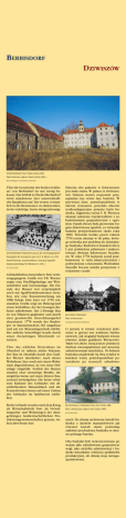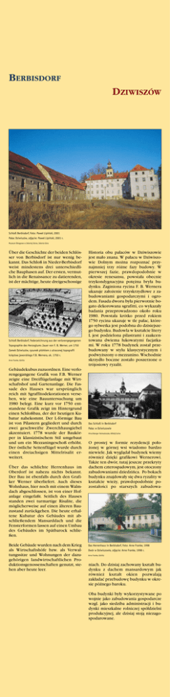 BERBISDORF DZIWISZÓW Schloß Berbisdorf, Foto: Paweł Lipiński, 2001 Pałac Dziwiszów, zdjęcie: Paweł Lipiński, 2001 r. Muzeum Okręgowe w Jeleniej Górze, Jelenia Góra Über die Geschichte der beiden Schlösser von Berbisdorf ist nur wenig bekannt. Das Schloß in Nieder-Berbisdorf weist mindestens drei unterschiedliche Bauphasen auf. Der ersten, vermutlich in die Renaissance zu datierenden, ist der mächtige, heute dreigeschossige Schloß Berbisdorf, Federzeichnung aus der verlorengegangenen Topographie des Herzogtums Jauer von F. B. Werner, um 1750 Zamek Dziwiszów, rysunek piórkiem z utraconej topografii księstwa jaworskiego F.B. Wernera, ok. 1750 r. Arne Franke, Görlitz Gebäudekubus zuzuordnen. Eine verlorengegangene Grafik von F.B. Werner zeigte eine Dreiflügelanlage mit Wirtschaftshof und Gartenanlage. Die Fassade des Hauses war ursprünglich reich mit Sgraffitodekorationen versehen, wie eine Bauuntersuchung um 1980 belegt. Eine kurz vor 1750 entstandene Grafik zeigt im Hintergrund einen Schloßbau, der der heutigen Kubatur nahekommt. Der L-förmige Bau ist von Pilastern gegliedert und durch zwei geschweifte Zwerchhausgiebel akzentuiert. 1778 wurde der Baukörper in klassizistischem Stil umgebaut und um ein Mezzaningeschoß erhöht. Der östliche Seitenflügel wurde durch einen dreiachsigen Mittelrisalit erweitert. Über das schlichte Herrenhaus im Oberdorf ist nahezu nichts bekannt. Der Bau ist ebenfalls durch den Grafiker Werner überliefert. Auch dieses Wohnhaus, hier noch mit einem Walmdach abgeschlossen, ist von einer Hofanlage eingefaßt. Seitlich des Hauses standen zwei turmartige Risalite, die möglicherweise auf einen älteren Bauzustand zurückgehen. Die heute erhaltene Kubatur des Gebäudes mit abschließendem Mansarddach und die Fensterformen lassen auf einen Umbau des Gebäudes im Spätbarock schließen. Beide Gebäude wurden nach dem Krieg als Wirtschaftshöfe bzw. als Verwaltungssitze und Wohnungen der dazugehörigen landwirtschaftlichen Produktionsgenossenschaften genutzt, stehen aber heute leer. Historia obu pałaców w Dziwiszowie jest mało znana. W pałacu w Dziwiszowie Dolnym można rozpoznać przynajmniej trzy różne fazy budowy. W pierwszej fazie, prawdopodobnie w okresie renesansu, powstała obecnie trzykondygnacyjna potężna bryła budynku. Zaginiona rycina F. B. Wernera ukazuje założenie trzyskrzydłowe z zabudowaniami gospodarczymi i ogrodem. Fasada dworu była pierwotnie bogato dekorowana sgrafitti, co wykazały badania przeprowadzono około roku 1980. Powstała krótko przed rokiem 1750 rycina ukazuje w tle pałac, którego sylwetka jest podobna do dzisiejszego budynku. Budowla w kształcie litery L jest podzielona pilastrami i zaakcentowana dwiema łukowatymi facjatkami. W roku 1778 budynek został przebudowany w stylu klasycystycznym i podwyższony o mezzanino. Wschodnie skrzydło boczne zostało poszerzone o trójosiowy ryzalit. Das Schloß in Berbisdorf Pałac w Dziwiszowie Hirschberger Heimatstube, Alfeld/Leine O prostej w formie rezydencji położonej w górnej wsi wiadomo bardzo niewiele. Jak wyglądał budynek wiemy również dzięki grafikowi Wernerowi. Także ten dwór, tutaj jeszcze przekryty dachem czterospadowym, jest otoczony zabudowaniami dziedzińca. Po bokach budynku znajdowały się dwa ryzality w kształcie wieży, prawdopodobnie pozostałości po starszych zabudowa- Das Herrenhaus in Berbisdorf, Foto: Arne Franke, 1998 Dwór w Dziwiszowie, zdjęcie: Arne Franke, 1998 r. Arne Franke, Görlitz niach. Do dzisiaj zachowany kształt budynku z dachem mansardowym jak również kształt okien pozwalają zakładać przebudowę budynku w okresie późnego baroku. Oba budynki były wykorzystywane po wojnie jako zabudowania gospodarcze wzgl. jako siedziba administracji i budynki mieszkalne rolniczej spółdzielni produkcyjnej, ale dzisiaj stoją niezagospodarowane.