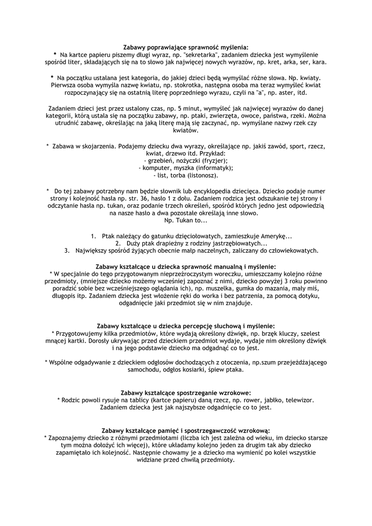 Zabawy poprawiające sprawność myślenia: * Na kartce papieru piszemy długi wyraz, np. "sekretarka", zadaniem dziecka jest wymyślenie spośród liter, składających się na to słowo jak najwięcej nowych wyrazów, np. kret, arka, ser, kara. * Na początku ustalana jest kategoria, do jakiej dzieci będą wymyślać różne słowa. Np. kwiaty. Pierwsza osoba wymyśla nazwę kwiatu, np. stokrotka, następna osoba ma teraz wymyśleć kwiat rozpoczynający się na ostatnią literę poprzedniego wyrazu, czyli na "a", np. aster, itd. Zadaniem dzieci jest przez ustalony czas, np. 5 minut, wymyśleć jak najwięcej wyrazów do danej kategorii, którą ustala się na początku zabawy, np. ptaki, zwierzęta, owoce, państwa, rzeki. Można utrudnić zabawę, określając na jaką literę mają się zaczynać, np. wymyślane nazwy rzek czy kwiatów. * Zabawa w skojarzenia. Podajemy dziecku dwa wyrazy, określające np. jakiś zawód, sport, rzecz, kwiat, drzewo itd. Przykład: - grzebień, nożyczki (fryzjer); - komputer, myszka (informatyk); - list, torba (listonosz). * Do tej zabawy potrzebny nam będzie słownik lub encyklopedia dziecięca. Dziecko podaje numer strony i kolejność hasła np. str. 36, hasło 1 z dołu. Zadaniem rodzica jest odszukanie tej strony i odczytanie hasła np. tukan, oraz podanie trzech określeń, spośród których jedno jest odpowiedzią na nasze hasło a dwa pozostałe określają inne słowo. Np. Tukan to... 1. Ptak należący do gatunku dzięciołowatych, zamieszkuje Amerykę... 2. Duży ptak drapieżny z rodziny jastrzębiowatych... 3. Największy spośród żyjących obecnie małp naczelnych, zaliczany do człowiekowatych. Zabawy kształcące u dziecka sprawność manualną i myślenie: * W specjalnie do tego przygotowanym nieprzeźroczystym woreczku, umieszczamy kolejno różne przedmioty, (mniejsze dziecko możemy wcześniej zapoznać z nimi, dziecko powyżej 3 roku powinno poradzić sobie bez wcześniejszego oglądania ich), np. muszelka, gumka do mazania, mały miś, długopis itp. Zadaniem dziecka jest włożenie ręki do worka i bez patrzenia, za pomocą dotyku, odgadnięcie jaki przedmiot się w nim znajduje. Zabawy kształcące u dziecka percepcję słuchową i myślenie: * Przygotowujemy kilka przedmiotów, które wydają określony dźwięk, np. brzęk kluczy, szelest mnącej kartki. Dorosły ukrywając przed dzieckiem przedmiot wydaje, wydaje nim określony dźwięk i na jego podstawie dziecko ma odgadnąć co to jest. * Wspólne odgadywanie z dzieckiem odgłosów dochodzących z otoczenia, np.szum przejeżdżającego samochodu, odgłos kosiarki, śpiew ptaka. Zabawy kształcące spostrzeganie wzrokowe: * Rodzic powoli rysuje na tablicy (kartce papieru) daną rzecz, np. rower, jabłko, telewizor. Zadaniem dziecka jest jak najszybsze odgadnięcie co to jest. Zabawy kształcące pamięć i spostrzegawczość wzrokową: * Zapoznajemy dziecko z różnymi przedmiotami (liczba ich jest zależna od wieku, im dziecko starsze tym można dołożyć ich więcej), które układamy kolejno jeden za drugim tak aby dziecko zapamiętało ich kolejność. Następnie chowamy je a dziecko ma wymienić po kolei wszystkie widziane przed chwilą przedmioty. * Zabawa "Poszedł Marek na Jarmarek". Dorosły zaczyna zabawę i mówi: Poszedł Marek na Jarmarek i kupił masło..., dziecko powtarza ten tekst i dodaje coć od siebie np.: Poszedł Marek na Jarmarek i kupił masło i chleb....Zabawa trwa doputy, dopóki nie nastąpi pomyłka. Zabawy utrwalające poznane litery alfabetu: * Rodzic wylicza kolejno litery alfabetu, dziecko w pewnym momencie mówi stop, jaka literka wypadnie na taką ma wymyśleć np, nazwę zwierzęcia, kwiatu, warzywa, imię itp.