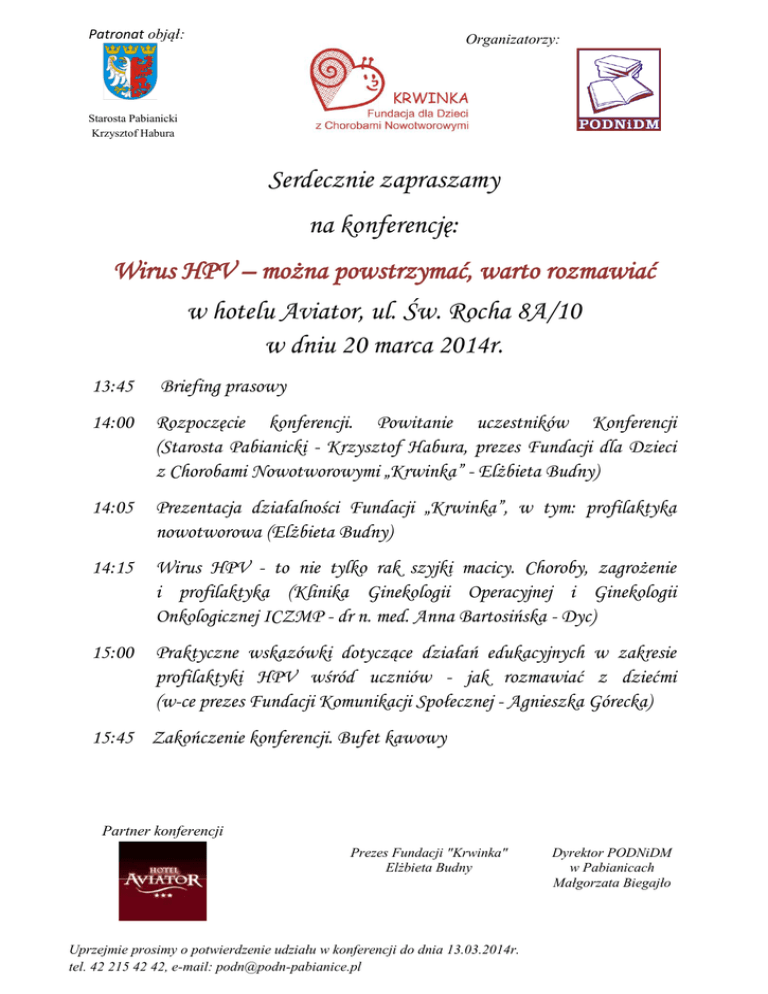 Patronat objął: Organizatorzy: Starosta Pabianicki Krzysztof Habura Serdecznie zapraszamy na konferencję: Wirus HPV – można powstrzymać, warto rozmawiać w hotelu Aviator, ul. Św. Rocha 8A/10 w dniu 20 marca 2014r. 13:45 Briefing prasowy 14:00 Rozpoczęcie konferencji. Powitanie uczestników Konferencji (Starosta Pabianicki - Krzysztof Habura, prezes Fundacji dla Dzieci z Chorobami Nowotworowymi „Krwinka” - Elżbieta Budny) 14:05 Prezentacja działalności Fundacji „Krwinka”, w tym: profilaktyka nowotworowa (Elżbieta Budny) 14:15 Wirus HPV - to nie tylko rak szyjki macicy. Choroby, zagrożenie i profilaktyka (Klinika Ginekologii Operacyjnej i Ginekologii Onkologicznej ICZMP - dr n. med. Anna Bartosińska - Dyc) 15:00 Praktyczne wskazówki dotyczące działań edukacyjnych w zakresie profilaktyki HPV wśród uczniów - jak rozmawiać z dziećmi (w-ce prezes Fundacji Komunikacji Społecznej - Agnieszka Górecka) 15:45 Zakończenie konferencji. Bufet kawowy Partner konferencji Prezes Fundacji "Krwinka" Elżbieta Budny Uprzejmie prosimy o potwierdzenie udziału w konferencji do dnia 13.03.2014r. tel. 42 215 42 42, e-mail: [email protected] Dyrektor PODNiDM w Pabianicach Małgorzata Biegajło