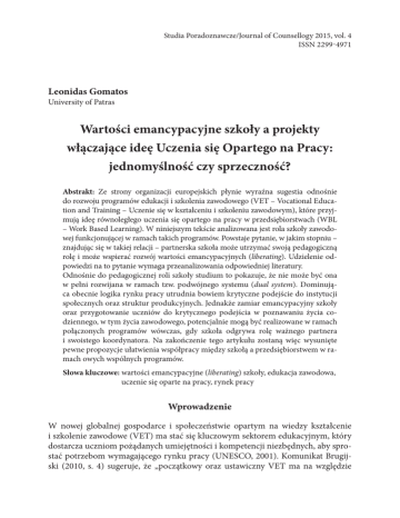 Studia Poradoznawcze/Journal of Counsellogy 2015, vol. 4 ISSN 2299-4971 Leonidas Gomatos University of Patras Wartości emancypacyjne szkoły a projekty włączające ideę Uczenia się Opartego na Pracy: jednomyślność czy sprzeczność? Abstrakt: Ze strony organizacji europejskich płynie wyraźna sugestia odnośnie do rozwoju programów edukacji i szkolenia zawodowego (VET – Vocational Educa‑ tion and Training – Uczenie się w kształceniu i szkoleniu zawodowym), które przyj‑ mują ideę równoległego uczenia się opartego na pracy w przedsiębiorstwach (WBL – Work Based Learning). W niniejszym tekście analizowana jest rola szkoły zawodo‑ wej funkcjonującej w ramach takich programów. Powstaje pytanie, w jakim stopniu – znajdując się w takiej relacji – partnerska szkoła może utrzymać swoją pedagogiczną rolę i może wspierać rozwój wartości emancypacyjnych (liberating). Udzielenie od‑ powiedzi na to pytanie wymaga przeanalizowania odpowiedniej literatury. Odnośnie do pedagogicznej roli szkoły studium to pokazuje, że nie może być ona w pełni rozwijana w ramach tzw. podwójnego systemu (dual system). Dominują‑ ca obecnie logika rynku pracy utrudnia bowiem krytyczne podejście do instytucji społecznych oraz struktur produkcyjnych. Jednakże zamiar emancypacyjny szkoły oraz przygotowanie uczniów do krytycznego podejścia w poznawaniu życia co‑ dziennego, w tym życia zawodowego, potencjalnie mogą być realizowane w ramach połączonych programów wówczas, gdy szkoła odgrywa rolę ważnego partnera i swoistego koordynatora. Na zakończenie tego artykułu zostaną więc wysunięte pewne propozycje ułatwienia współpracy między szkołą a przedsiębiorstwem w ra‑ mach owych wspólnych programów. Słowa kluczowe: wartości emancypacyjne (liberating) szkoły, edukacja zawodowa, uczenie się oparte na pracy, rynek pracy Wprowadzenie W nowej globalnej gospodarce i społeczeństwie opartym na wiedzy kształcenie i szkolenie zawodowe (VET) ma stać się kluczowym sektorem edukacyjnym, który dostarcza uczniom pożądanych umiejętności i kompetencji niezbędnych, aby spro‑ stać potrzebom wymagającego rynku pracy (UNESCO, 2001). Komunikat Brugij‑ ski (2010, s. 4) sugeruje, że „początkowy oraz ustawiczny VET ma na względzie II. Komunikaty z badań i opinie 107 podwójny cel: przyczynianie się do wzrostu zatrudnialności (employability) i wzro‑ stu gospodarczego, a także odpowiadanie na szersze wyzwania społeczne, w szcze‑ gólności promowanie spójności społecznej”. Ze strony organizacji europejskich płynie wyraźna zachęta do rozwoju progra‑ mów VET, które adaptują ideę równoległego uczenia się opartego na pracy (WBL) w przedsiębiorstwach. Chodzi o to, że preferuje się takie programy zawodowe, po‑ łączone z rodzajem szkolenia w miejscu pracy, w których są praktykowane dana specjalizacja zawodowa lub niektóre z jej zadań. Tego rodzaju idea jest generalnie uznawana i znajduje podstawy naukowe w literaturze przedmiotu. Na przykład Jean Lave i Etienne Wenger (1991) twierdzą, że wiedza zawodowa wydaje się za‑ sadniczo znajdować w społecznościach praktyki, a większość z niej rozwija się po‑ przez partycypację w codziennym życiu zawodowym. Postulat powiązania szkoły z rynkiem pracy w celu realizacji programów zawodowych już jest częścią sugestii i zaleceń europejskich organizacji w zakresie kształcenia zawodowego i wchodzenia na rynek pracy (Komunikat Brugijski, 2010). Pośród różnych rodzajów połączonych programów kształcenia szkolnego i za‑ wodowego praktykowanych w różnych krajach najczęściej spotykany jest staż (apprenticeship). Sam termin „staż” oznacza praktykę w miejscu pracy na ogół opła‑ caną przez pracodawcę, realizowaną w celu uzyskania zawodowego certyfikatu lub kwalifikacji po umówionym okresie i po zdaniu egzaminów kwalifikacyjnych. Jest rzeczą oczywistą, że w tym procesie pracodawca nie jest sam. Działa on w zor‑ ganizowanych ramach, opracowanych przez systemy szkolne i innych partnerów pracodawców (izby zawodowe, związki zawodowe). Praktyka w miejscu pracy od‑ bywa się w obecności opiekuna-trenera. Trenerem jest pracownik danego zakładu pracy, zobowiązany do szkolenia praktykantów. W rzeczywistości, w większości przypadków – jak wyjaśnia Anke Bahl (2013) – to nie jest tylko jeden pracownik: stażysta podczas odbywania praktyk uczy się od różnych fachowców. Można mówić o wspólnocie praktyki w miejscu pracy. W każdym przypadku rola trenera w miej‑ scu pracy jest skomplikowana, jako że on/ona pełni tę rolę, łącząc ją równocześnie ze swoimi zadaniami pracowniczymi. W związku z tym utrzymywanie równowa‑ gi między różnymi funkcjami może być dla niej/niego trudne. Trenerzy w miejscu pracy są w pewnym sensie „ukrytymi bohaterami” szkolenia (Ostendorf, 2012). W niniejszym tekście uwaga koncentruje się na pedagogicznej roli szkoły i pe‑ dagogicznych aspektach WBL, obecnych w różnych formach połączonych progra‑ mów przygotowania zawodowego. Dociekania dotyczą tego, czy w obrębie wymie‑ nionych struktur i działań może być wspierana i rozwijana idea emancypacji. Idea ta jest rozumiana przez pedagogikę krytyczną jako część transformacji społecznej. Według Paula Freire (1968) edukacja nigdy nie jest neutralna. Działa ona jako śro‑ dek adaptacji ludzi do danego istniejącego porządku albo staje się praktyką prze‑ kształcania obecnych warunków. Autor ten postrzega praktyki edukacyjne w per‑ spektywie ich roli w wyzwoleniu ludności defaworyzowanej, uciśnionej, zwłaszcza ubogich i nieuprzywilejowanych. 108 Studia Poradoznawcze/Journal of Counsellogy 2015, vol. 4 Szczegółowe pytania badawcze brzmią następująco: ӹӹ Czy szkolny projekt emancypacji i przygotowanie uczniów do krytycznego po‑ nownego wejścia w poznawanie życia codziennego, w 